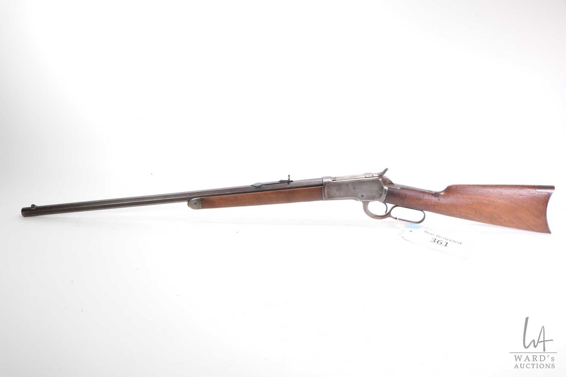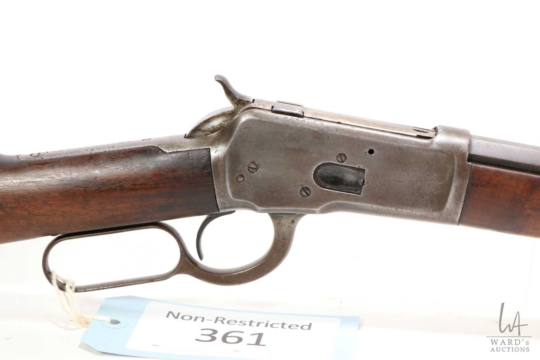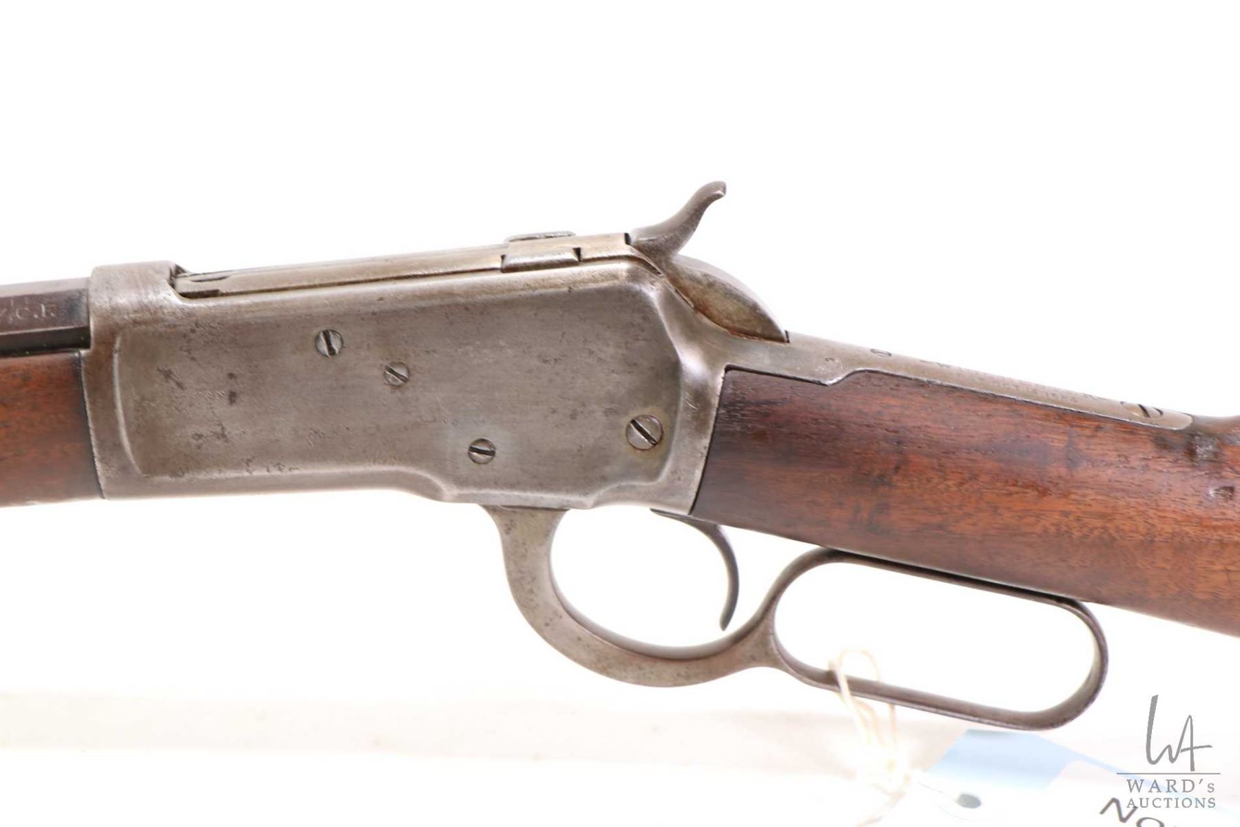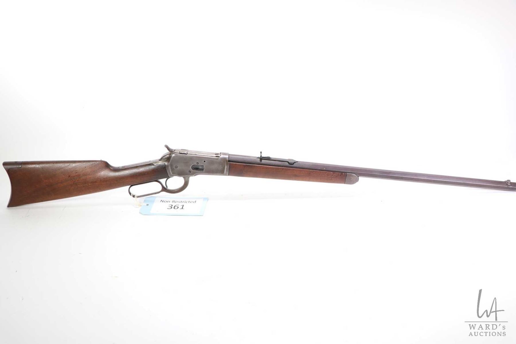 Non-Restricted rifle Winchester model 1892, .32 W.C.F lever action, w/ bbl length 24-1/4" [Blued octagonal barrel turning brown grey. Fixed front and adjustable rear buckhorn sights. Smooth straight stock with metal butt plate. Virtually no bluing remains on receiver. Half length tube magazine. Action and trigger function reasonably smoothly with use, storage and handling marks on wood and metal.] serial # NIL, PAL required