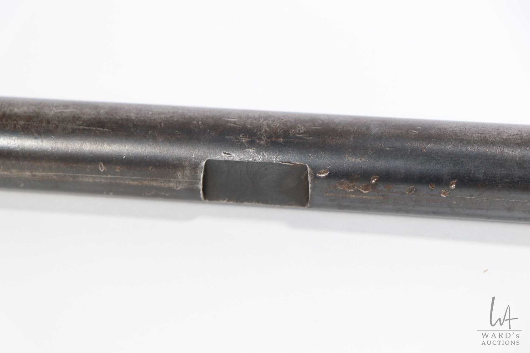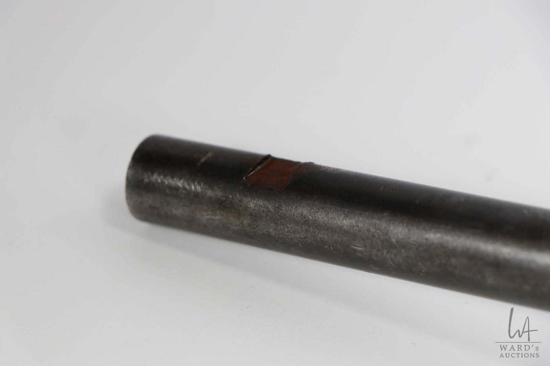 Non-Restricted rifle Winchester model 1892, .38 WCF lever action, w/ bbl length 23" [Blued barrel and receiver. Front and rear sights missing. Smooth straight stock with curved metal butt plate. Currently fitted with half length tube however barrel is designed for full length tube. Bluing worn in use and handling areas, especially on receiver. Crack in bottom of stock. Use, handling and storage marks on wood and metal.] serial # 847733, PAL required