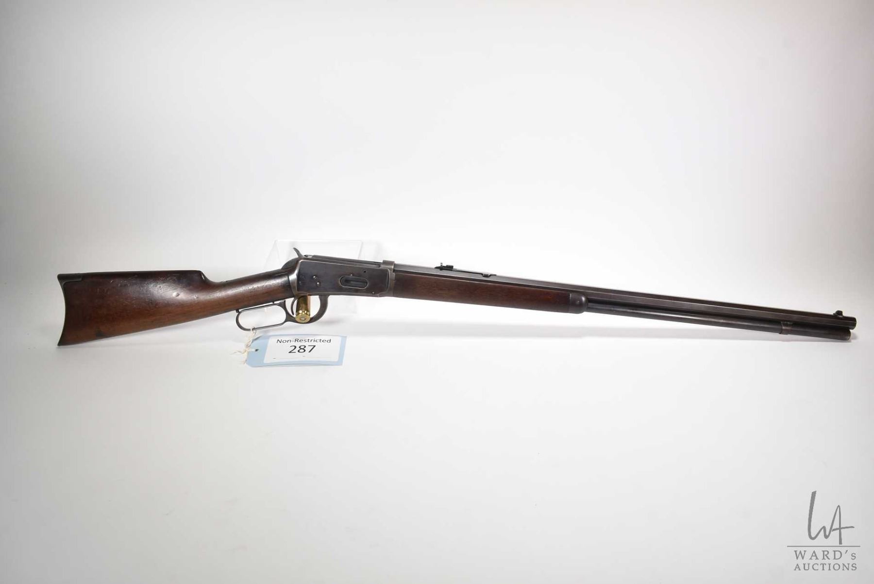 Non-Restricted rifle Winchester model 1894 (1895), .32-40 lever action, w/ bbl length 26" [Blued octagonal barrel, receiver and full length tube. Fixed front and elevation adjustable rear sight. Smooth straight stock and forend. Curved metal butt plate. Most metal turning brown gray. Wood and metal has recent oiled coating. Action and trigger seem to function smoothly. Use, handling and storage marks to wood and metal. Includes Cody letter.] serial # 6327, PAL required