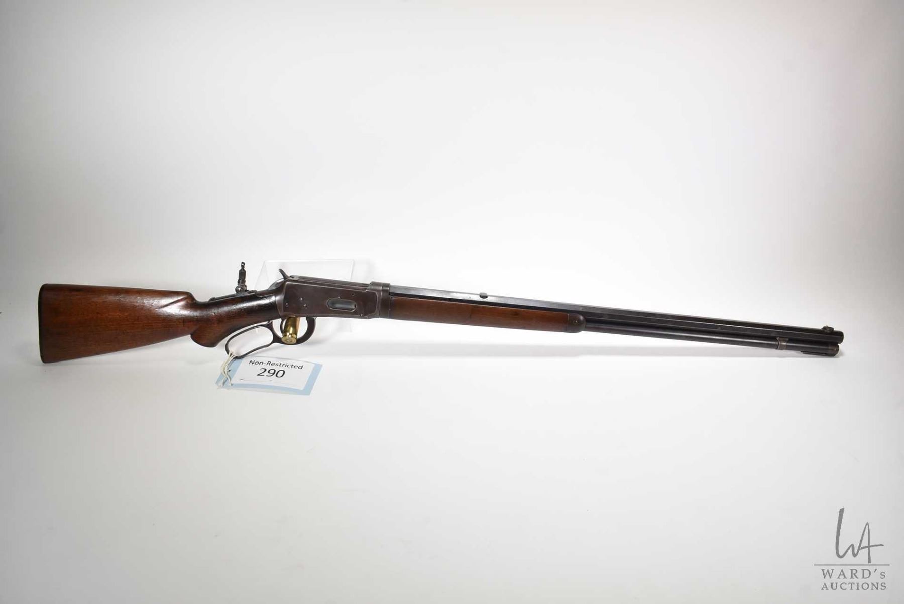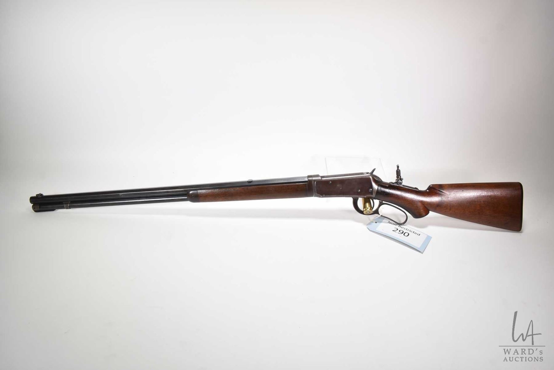 Non-Restricted rifle Winchester model 1894 (1912) Takedown, .32 WS lever action, w/ bbl length 26" [Blued octagonal barrel, receiver and full length tube. Fitted with Lyman folding front sight, rear plug and Lyman rear tang. Whelen fluted wooden stock and smooth forend. Branded butt plate. Most of the metal turning brown with recent oiled coating. Action and trigger function reasonably smoothly. Use, handling and storage marks on wood and metal Comes with WWII era paperwork including certificate of registration of rifles and shotguns with such question as "British Subject?", "Racial Origin" and "Occupation" which in this case is housewife] serial # 565051, PAL required