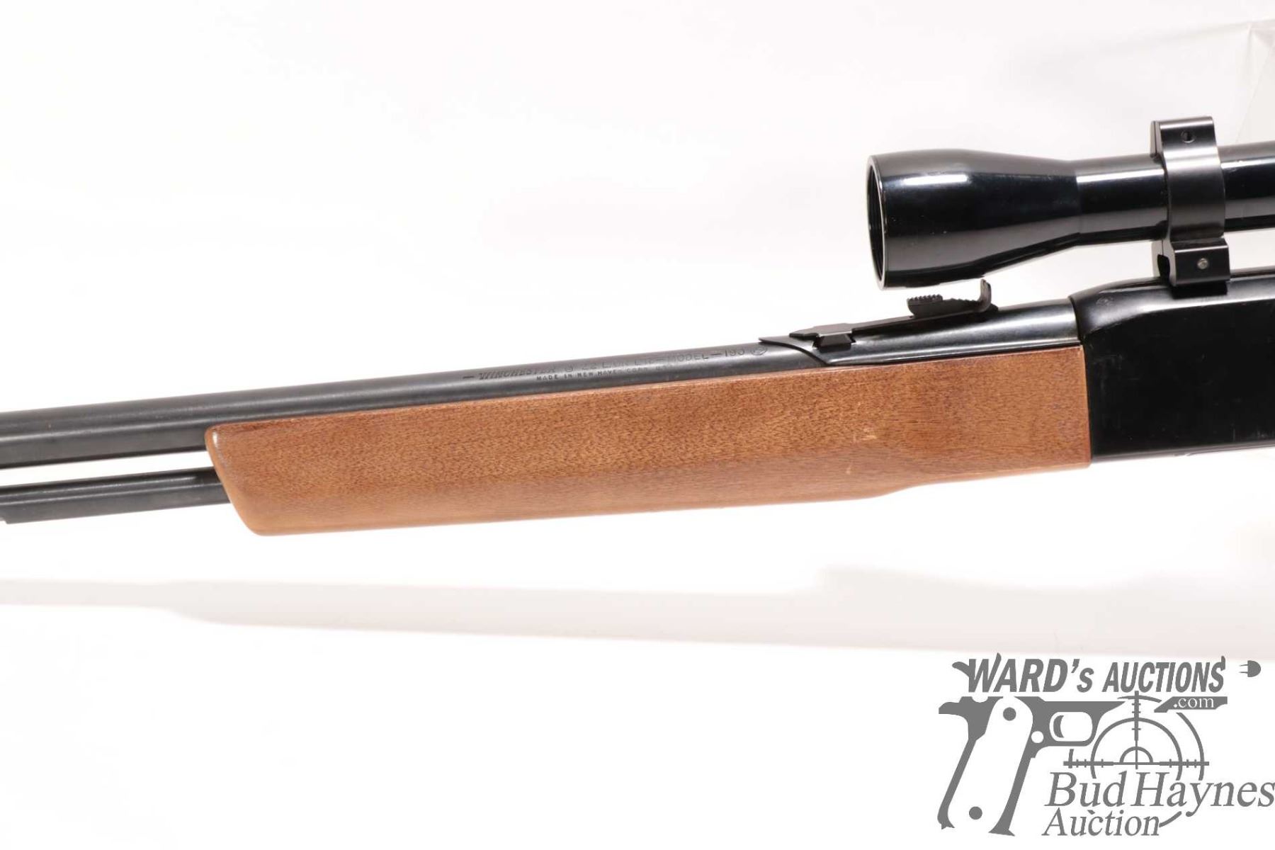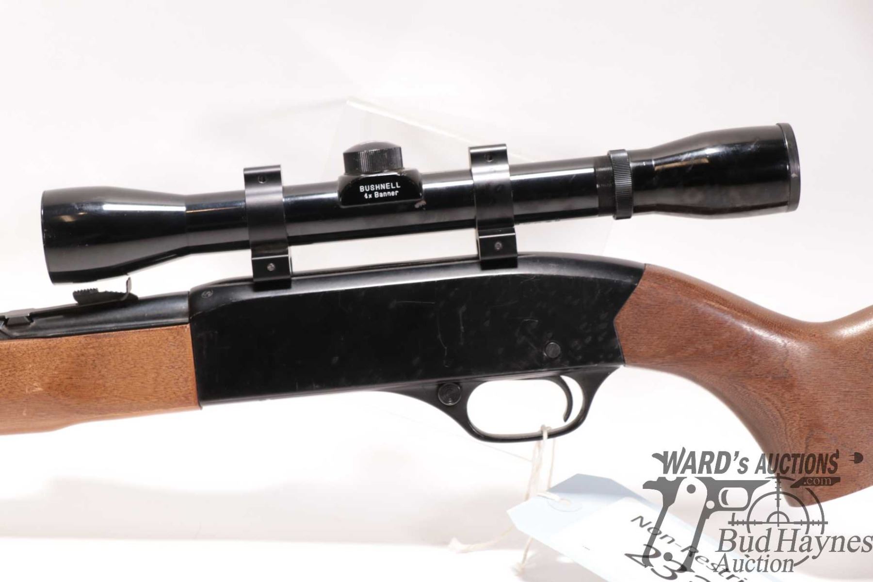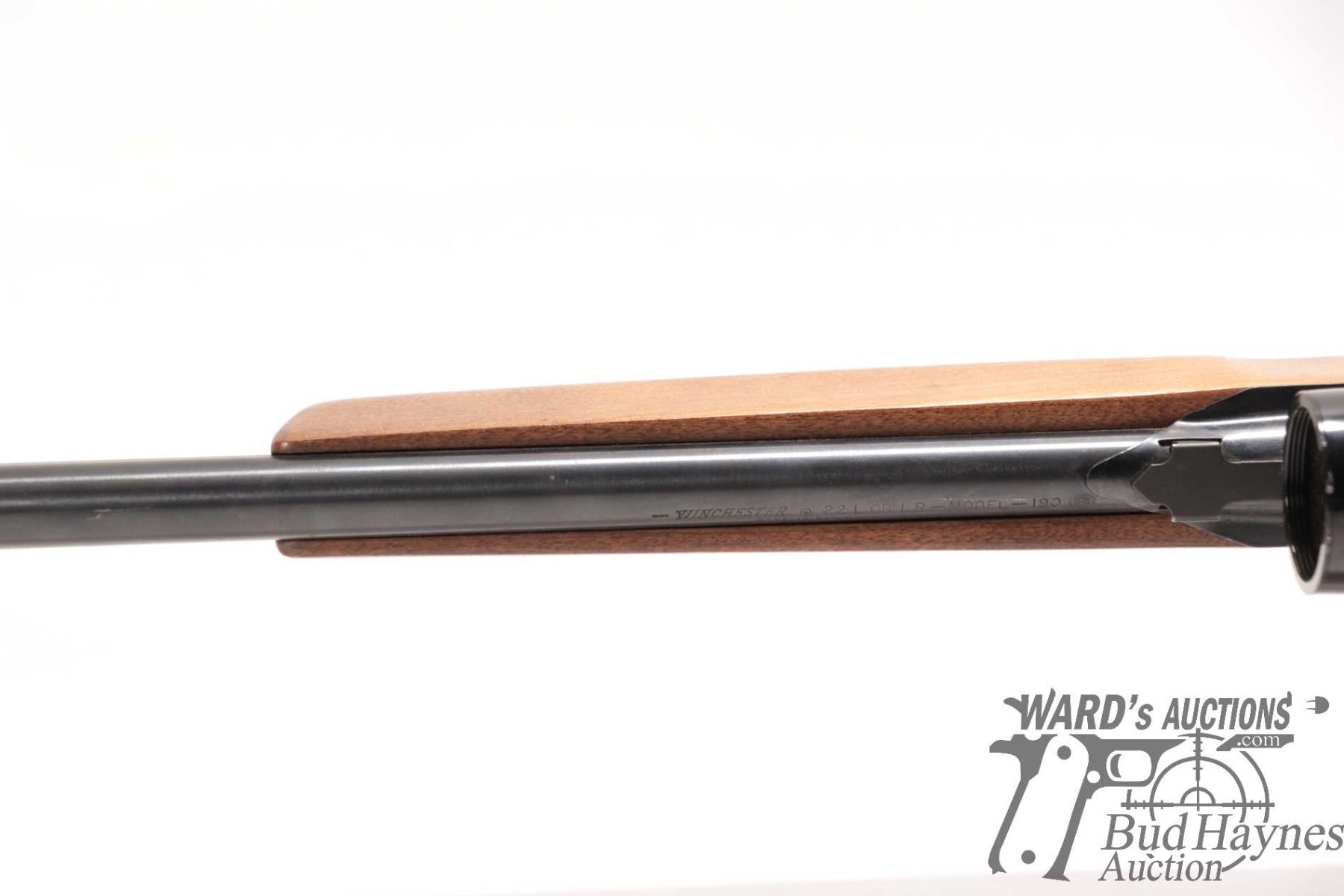 Non-Restricted rifle Winchester model 190, 22 L, LR semi automatic, w/ bbl length 20 1/2" [Blued barrel and full length tube. Fixed front and adjustable rear sights. Black alloy receiver. Fitted with Bushnell Banner 4X scope. Smooth wooden stock with branded plastic butt plate. Mechanically appears to function and appears to have had light use. Overall only minor use, handling and storage marks plus a few extra shelf rubs.] serial # B1936220, PAL required