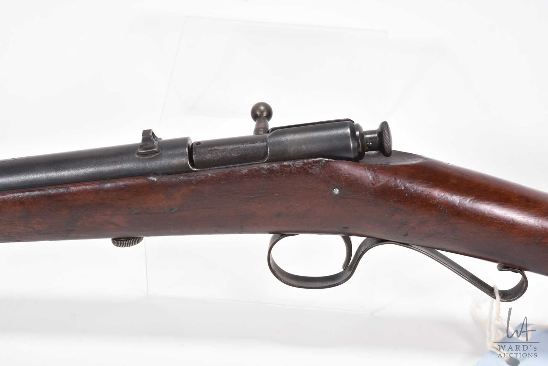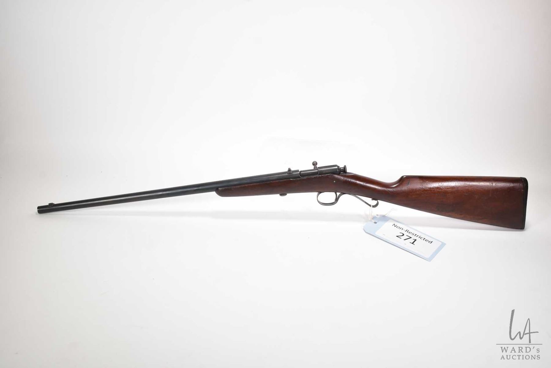 Non-Restricted rifle Winchester model 1902, .22 S, L single shot bolt action, w/ bbl length 18" [Blued barrel with fixed front and rear peep sight. Smooth wooden stock with branded plastic scroll style trigger guard. Wood and metal have been refinished with some degradation to stamped lettering. Use, handling and storage marks to wood and metal.] serial # NIL, PAL required