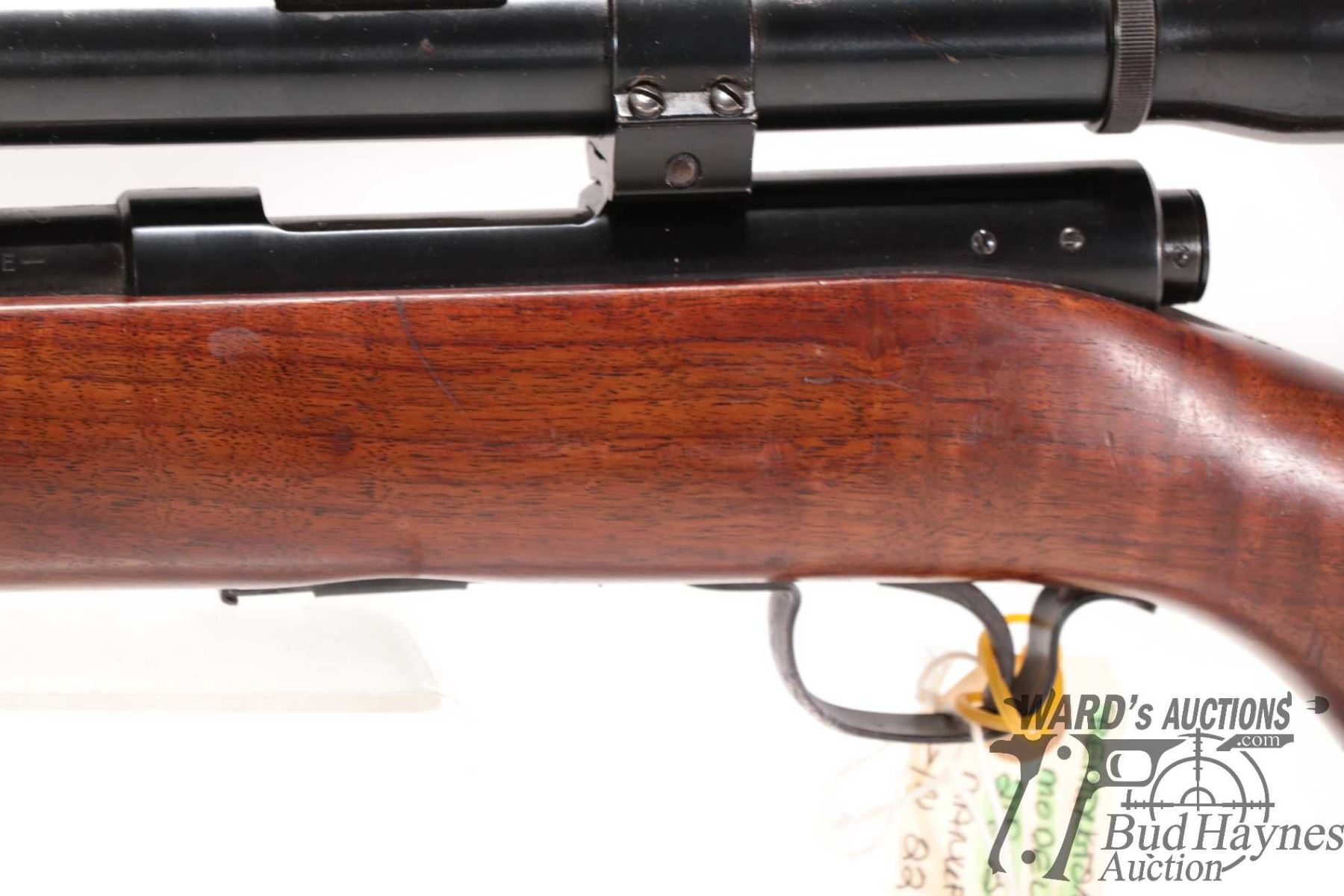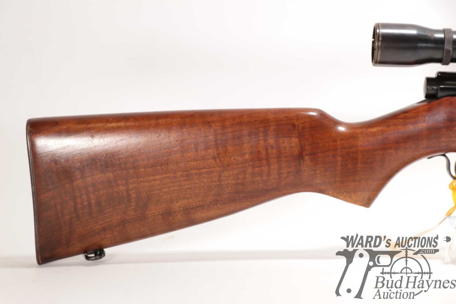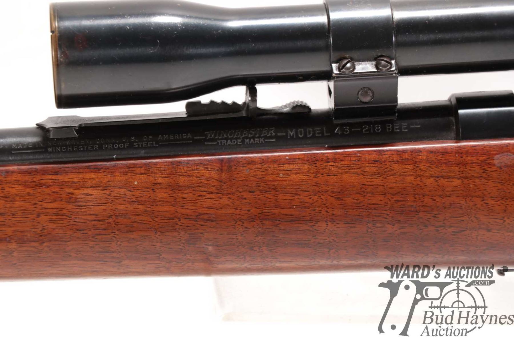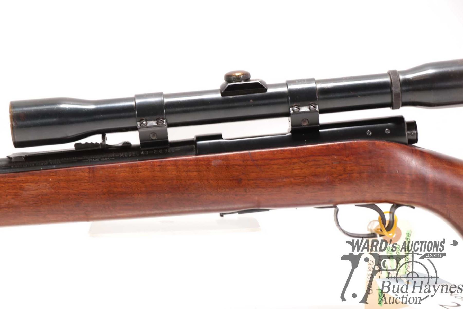 Non-Restricted rifle Winchester model 43 (circa 1950), 218 BEE bolt action, w/ bbl length 24" [Blued barrel and receiver. Hooded fixed front sight and adjustable rear. Fitted with Weaver K6 scope. Includes one detachable box magazine. Smooth hardwood stock with checkered metal butt plate. Mechanically appears to function well. Most bluing intact with light surface rust. Overall minor use, handling and storage marks.] serial # 22317A, PAL required