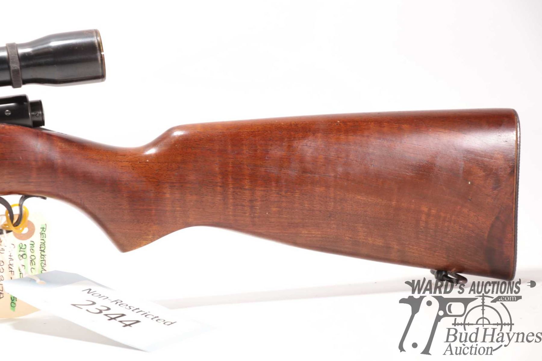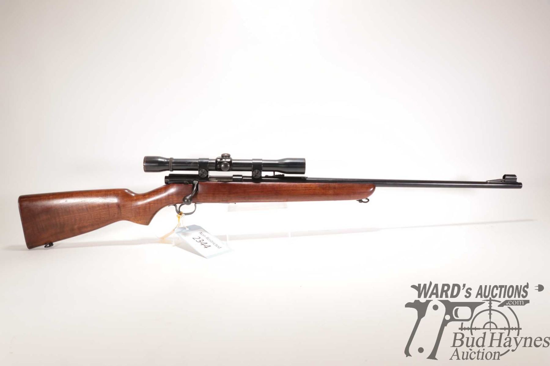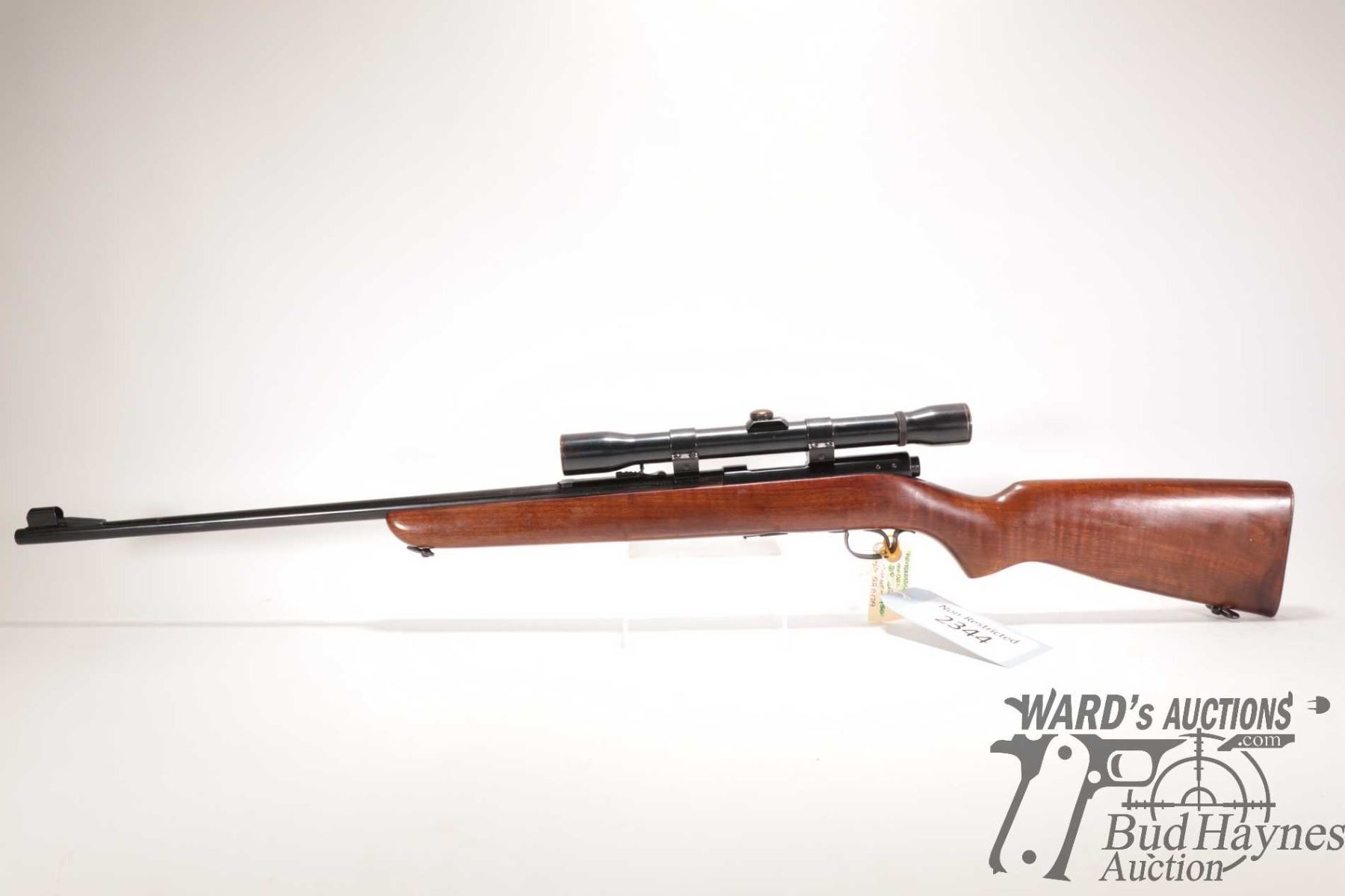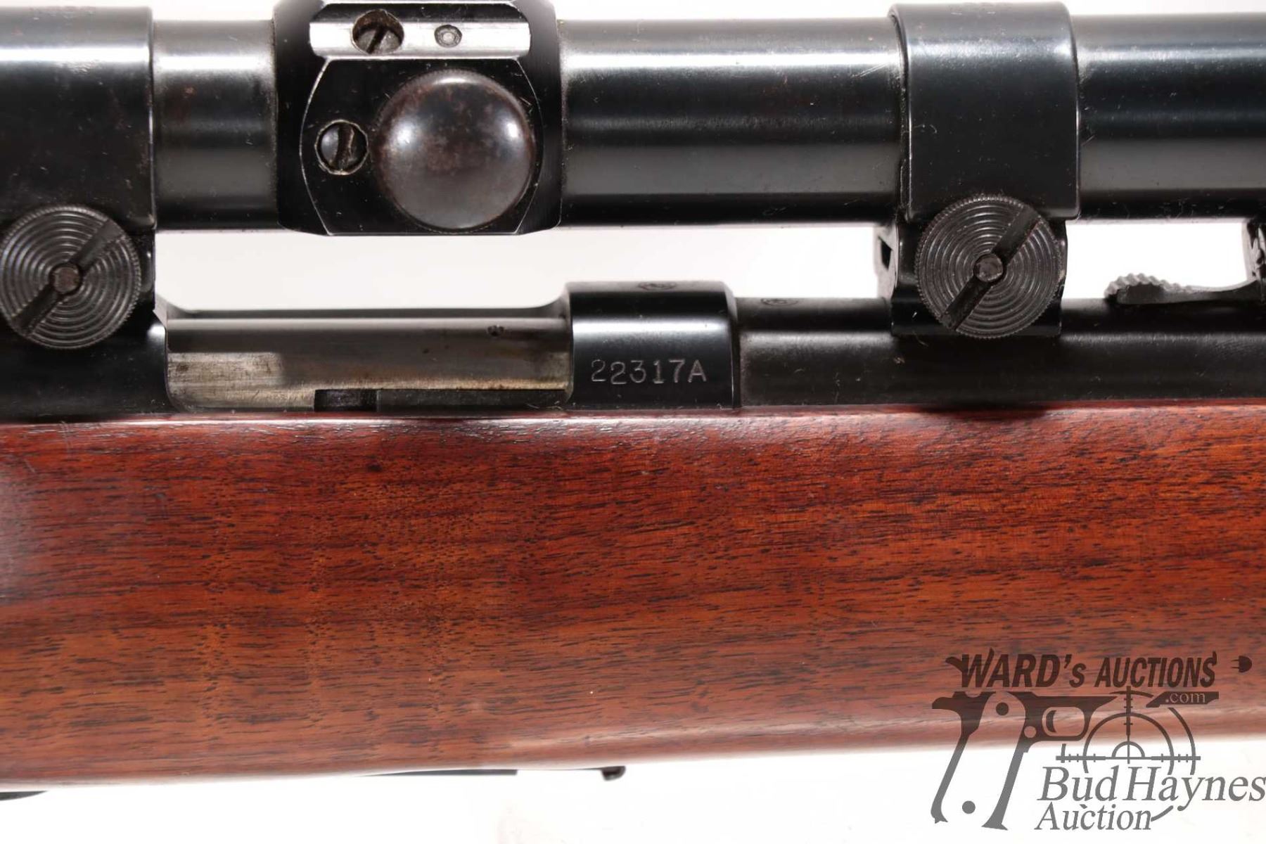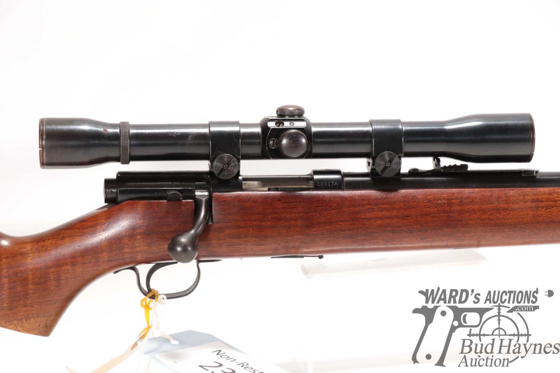 Non-Restricted rifle Winchester model 43 (circa 1950), 218 BEE bolt action, w/ bbl length 24" [Blued barrel and receiver. Hooded fixed front sight and adjustable rear. Fitted with Weaver K6 scope. Includes one detachable box magazine. Smooth hardwood stock with checkered metal butt plate. Mechanically appears to function well. Most bluing intact with light surface rust. Overall minor use, handling and storage marks.] serial # 22317A, PAL required