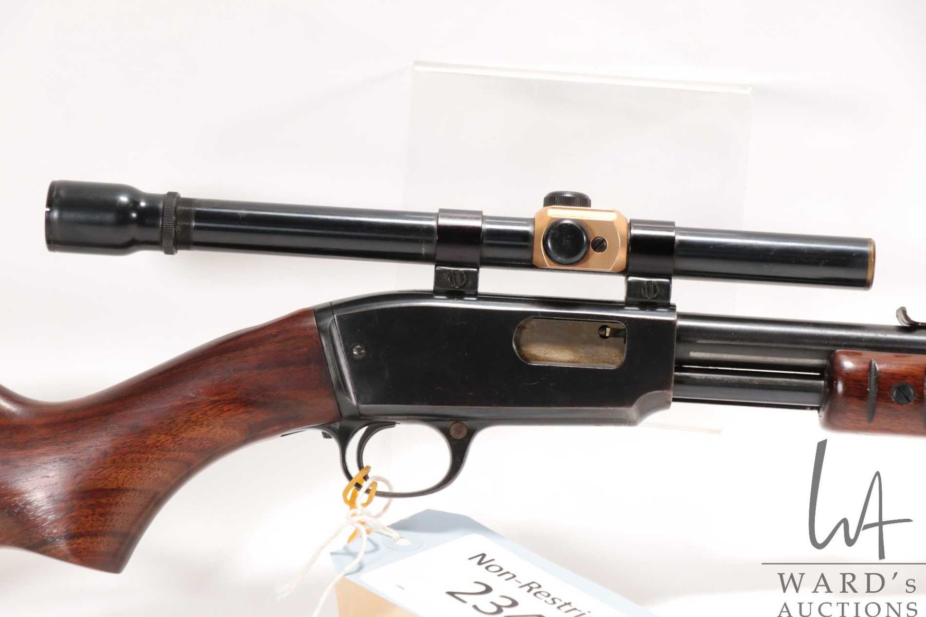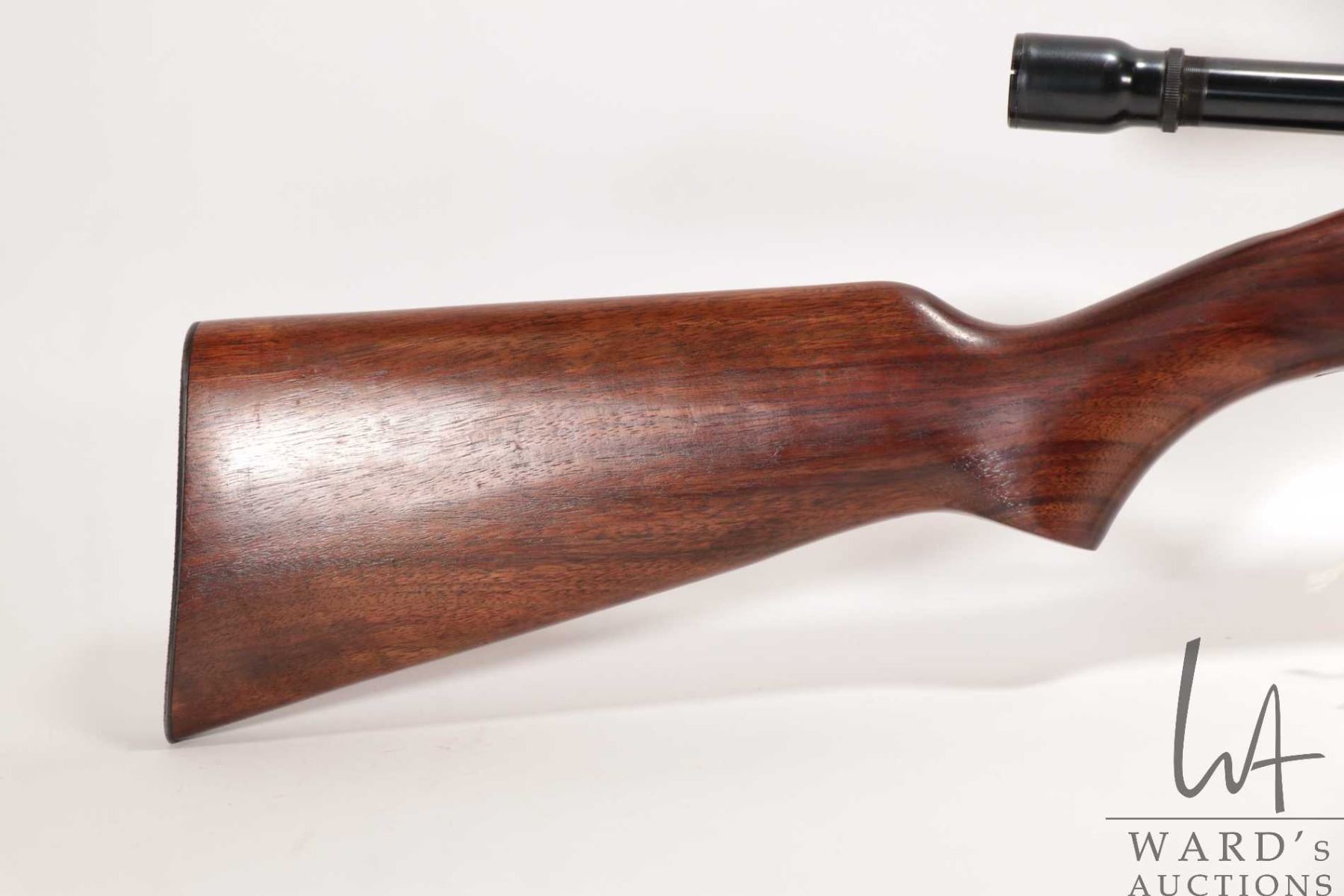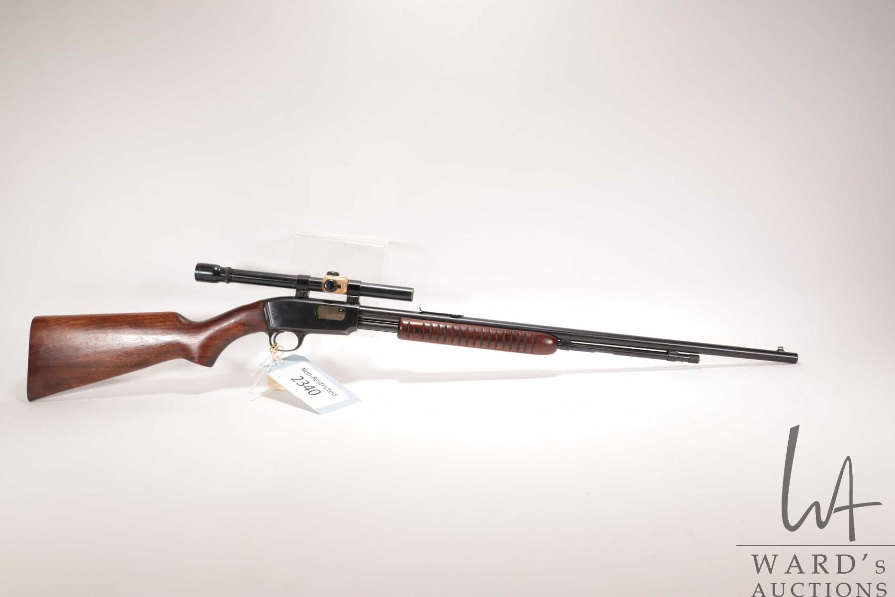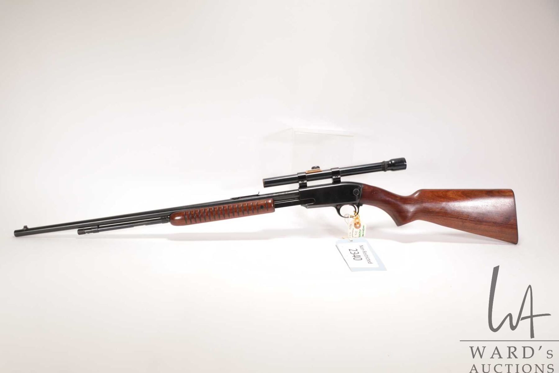 Non-Restricted rifle Winchester model 61 (circa 1956), .22 S, L & LR pump action, w/ bbl length 24" [Blued barrel and receiver. Fixed front and adjustable rear sight with ramp missing. Fitted with J.C. Higgins Rifleman 4X scope. Smooth wooden stock with checkered metal butt plate. Mechanically appears near excellent. Minor bluing wear and some isolated areas of light surface rust and other minor use, handling and storage marks.] serial # 238970, PAL required