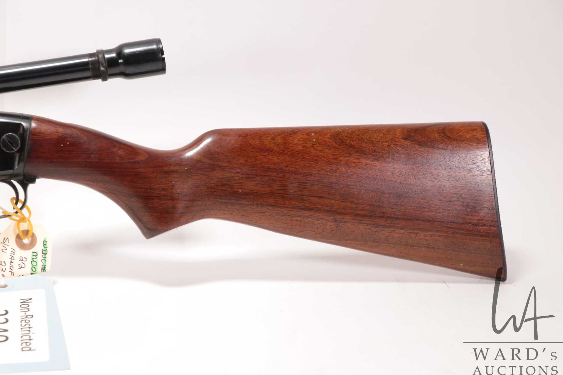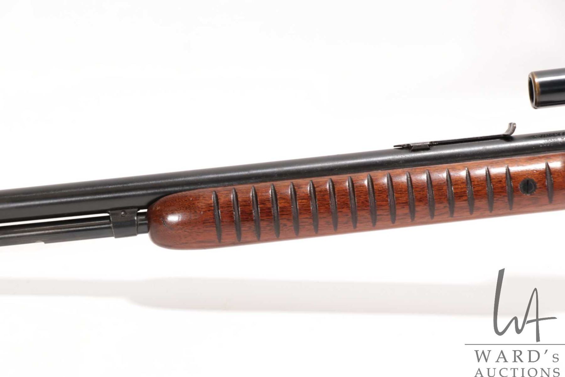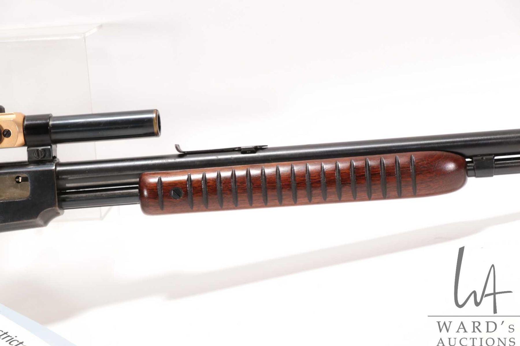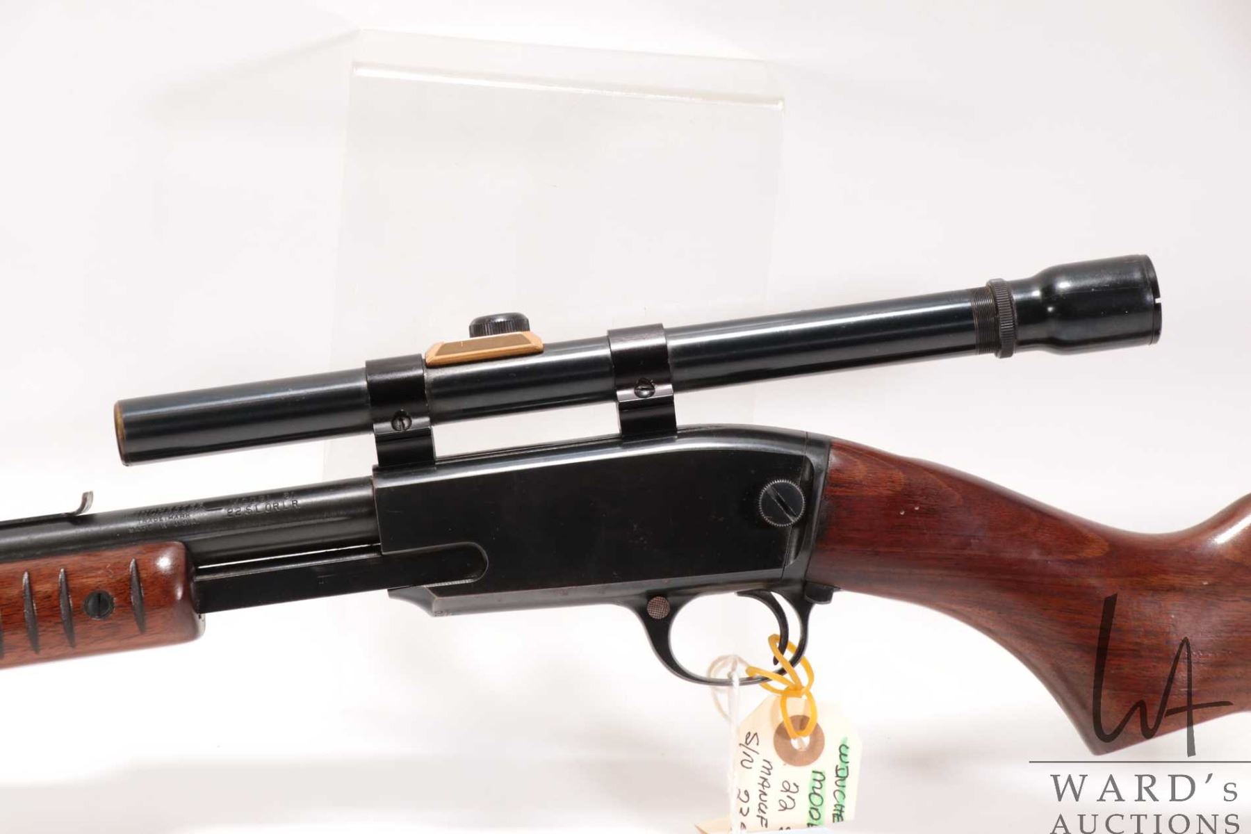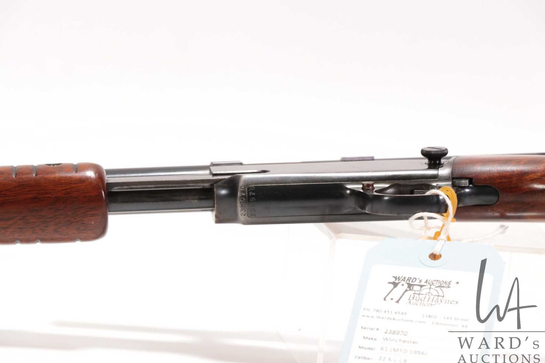 Non-Restricted rifle Winchester model 61 (circa 1956), .22 S, L & LR pump action, w/ bbl length 24" [Blued barrel and receiver. Fixed front and adjustable rear sight with ramp missing. Fitted with J.C. Higgins Rifleman 4X scope. Smooth wooden stock with checkered metal butt plate. Mechanically appears near excellent. Minor bluing wear and some isolated areas of light surface rust and other minor use, handling and storage marks.] serial # 238970, PAL required