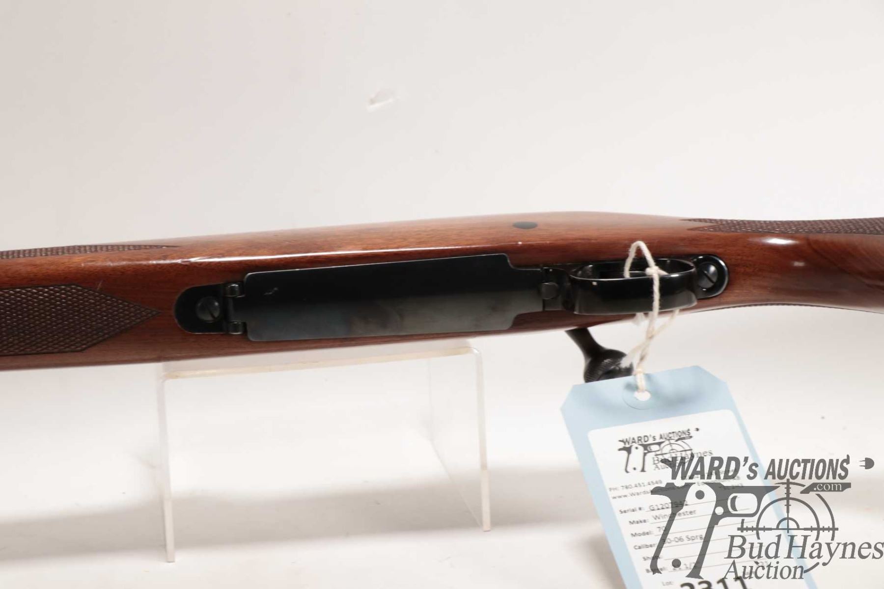 Non-Restricted rifle Winchester model 70, 30-06 Spring bolt action, w/ bbl length 21 1/2" [Blued barrel and receiver. Fixed front and adjustable rear sights. Fitted with scope bases. Internal box magazine. Hardwood stock with branded plastic butt plate. Mechanically appears to function well. Bluing worn in use and handling areas. Nicks and dings and other use, handling and storage marks.] serial # G1207942, PAL required