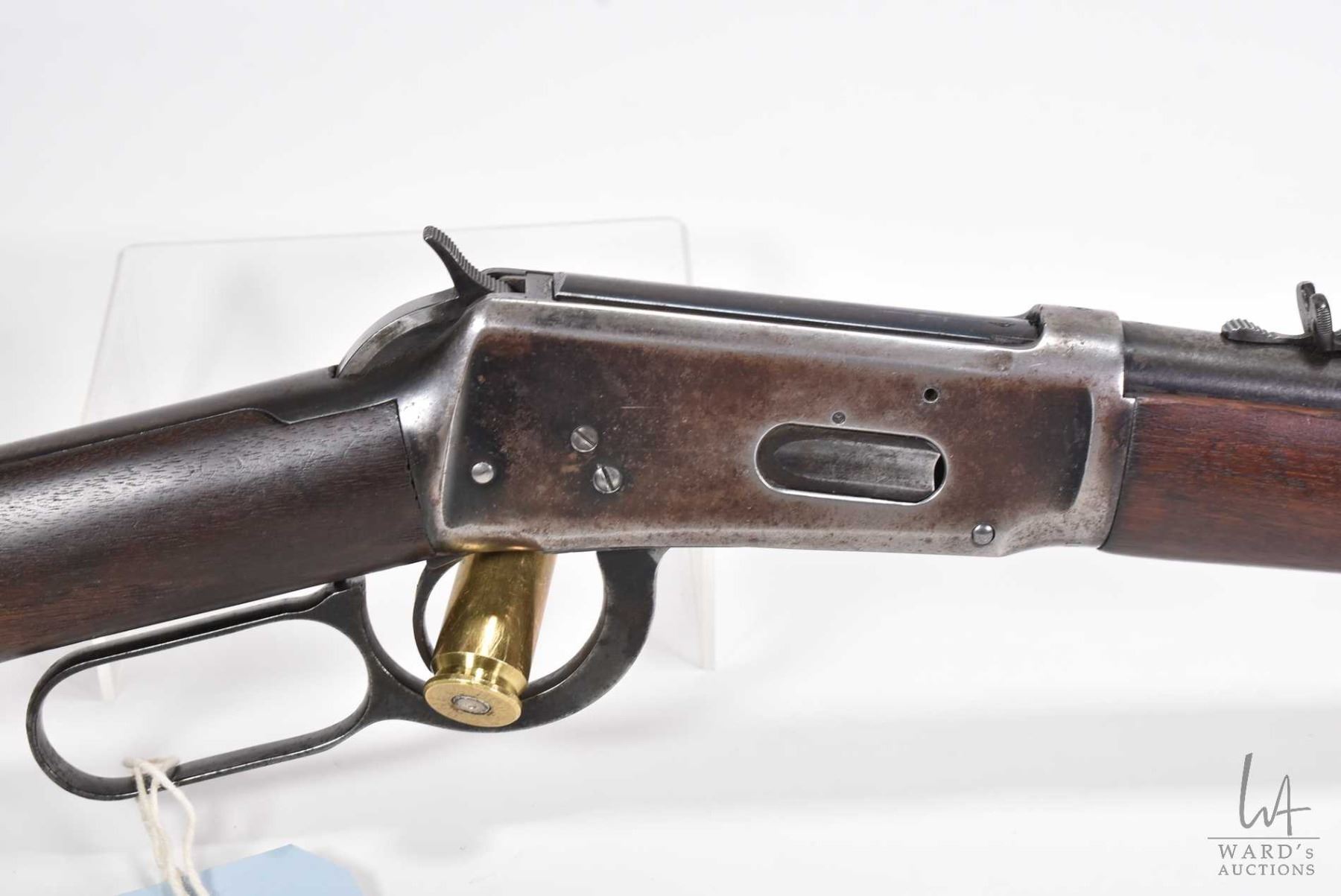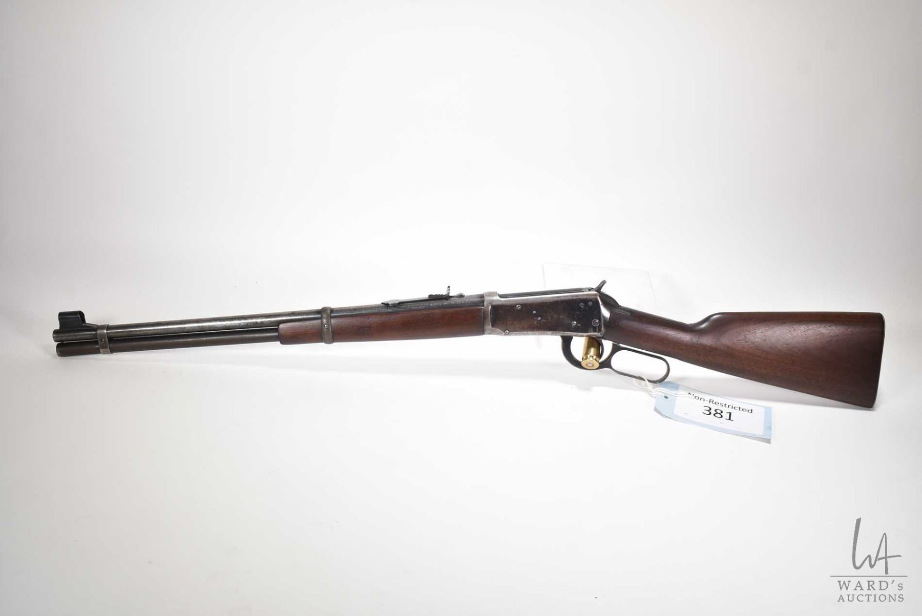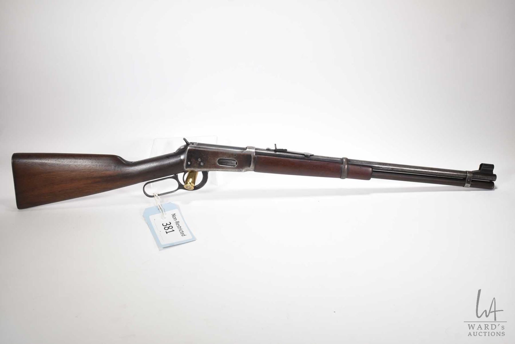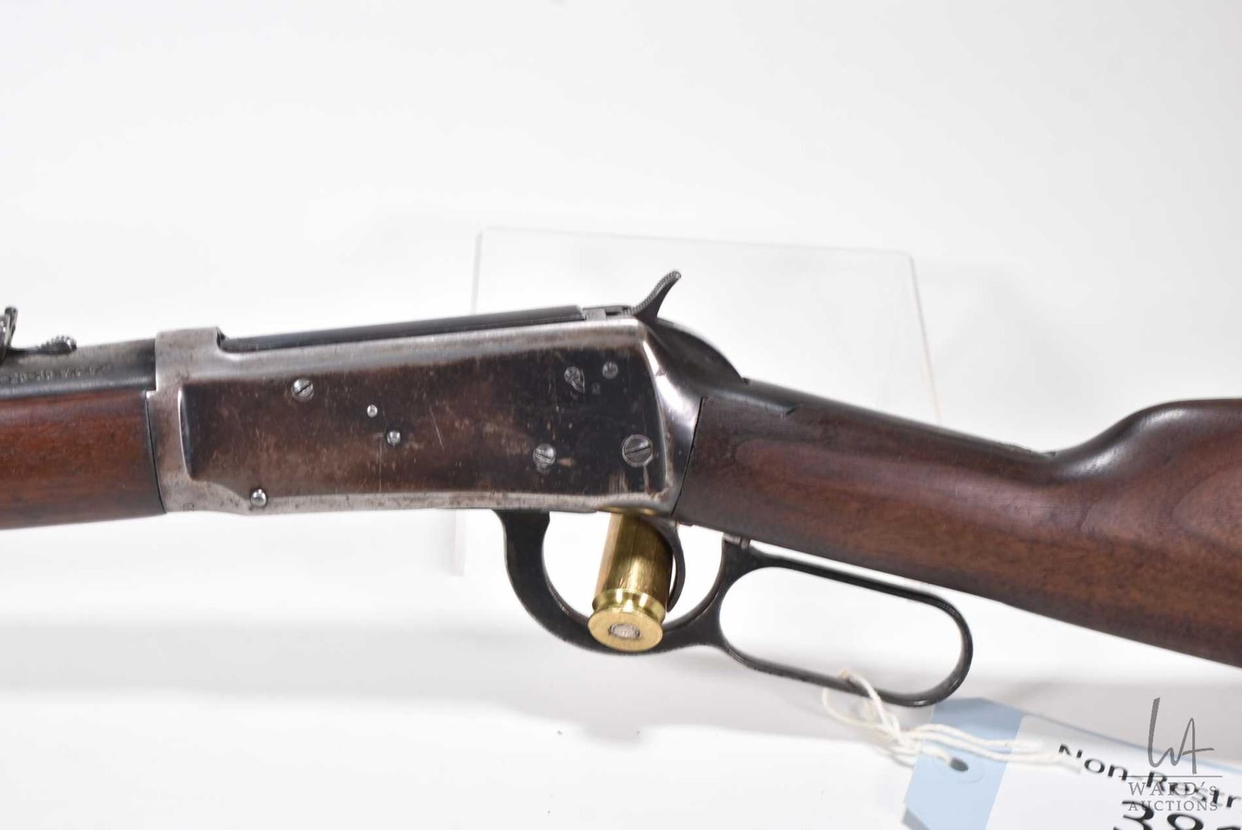 Non-Restricted rifle Winchester model 94 (1947), .25-35 WCF lever action, w/ bbl length 20" [Blued round barrel, receiver and full length tube. Hooded fixed front sight and adjustable rear Rocky Mountain sight. Smooth straight wooden stock and forend with checkered flat metal butt plate. Bluing worn in use and handling areas, otherwise turning brown gray. Magazine tube has surface rusting, possible cleaned. Note flat sided front barrel band. Action and trigger cycle fairly smoothly with use, handling and storage marks to wood and metal.] serial # 1457950, PAL required