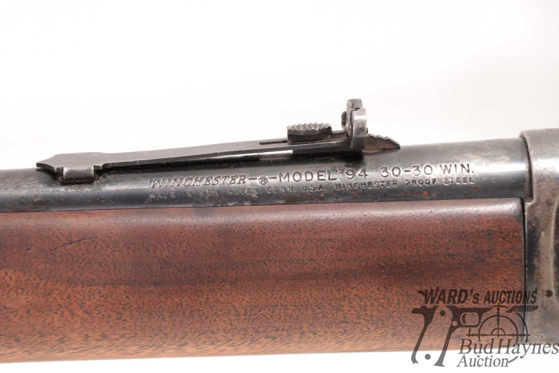 Non-Restricted rifle Winchester model 94, 30-30 Win lever action, w/ bbl length 20" [Blued barrel, receiver and full length tube. Fixed front and adjustable rear sights. Smooth wooden stock with branded recoil pad. Mechanically appears to function reasonably well. Heavy bluing wear in use and handling areas. Surface rust and pitting. Butt plate has been replaced. Nicks and dings and other use, handling and storage marks.] serial # 4656589, PAL required