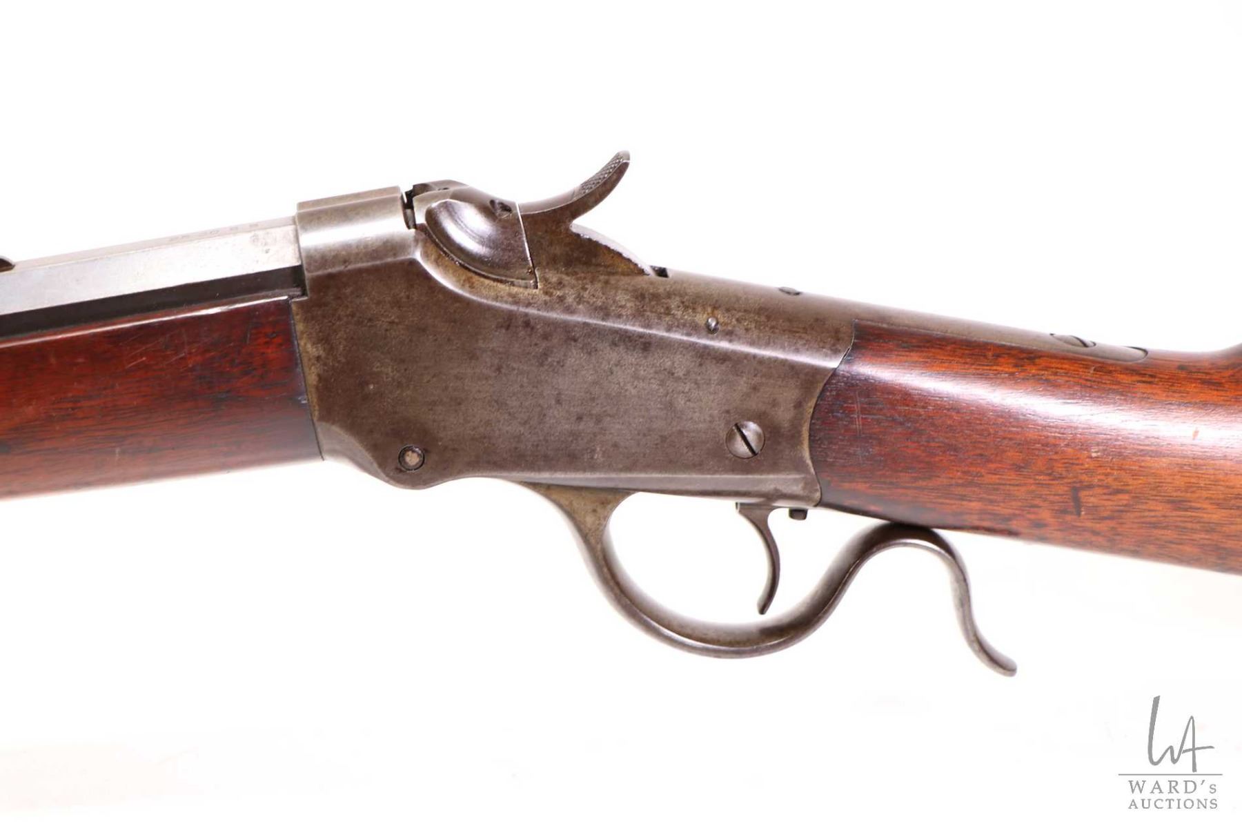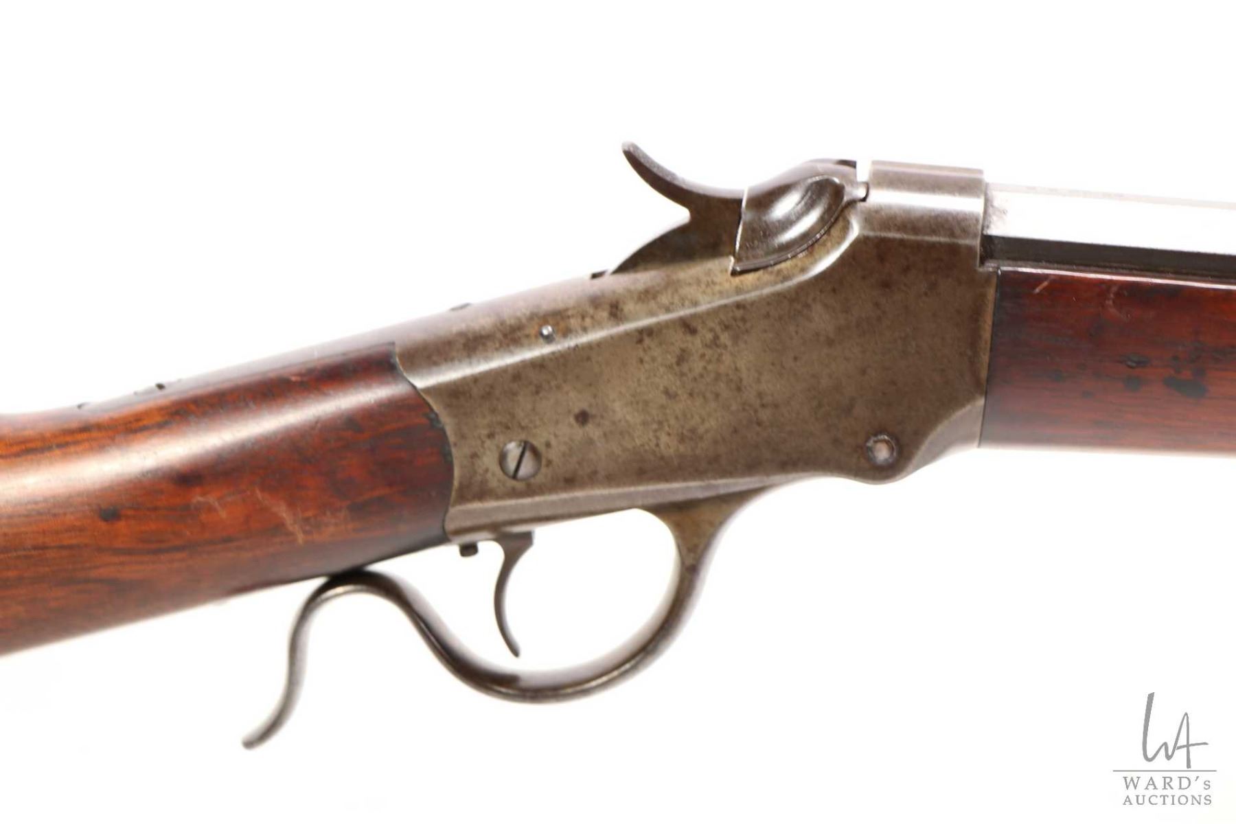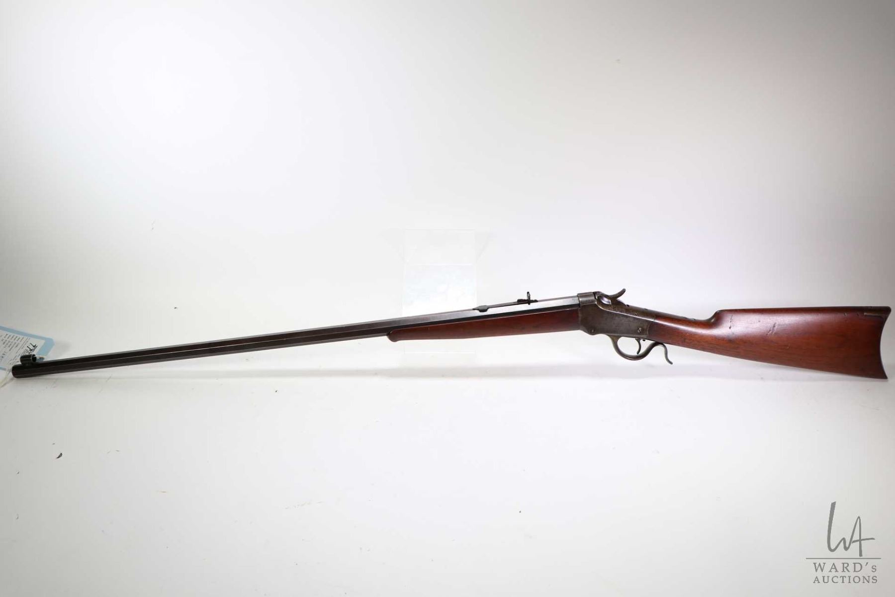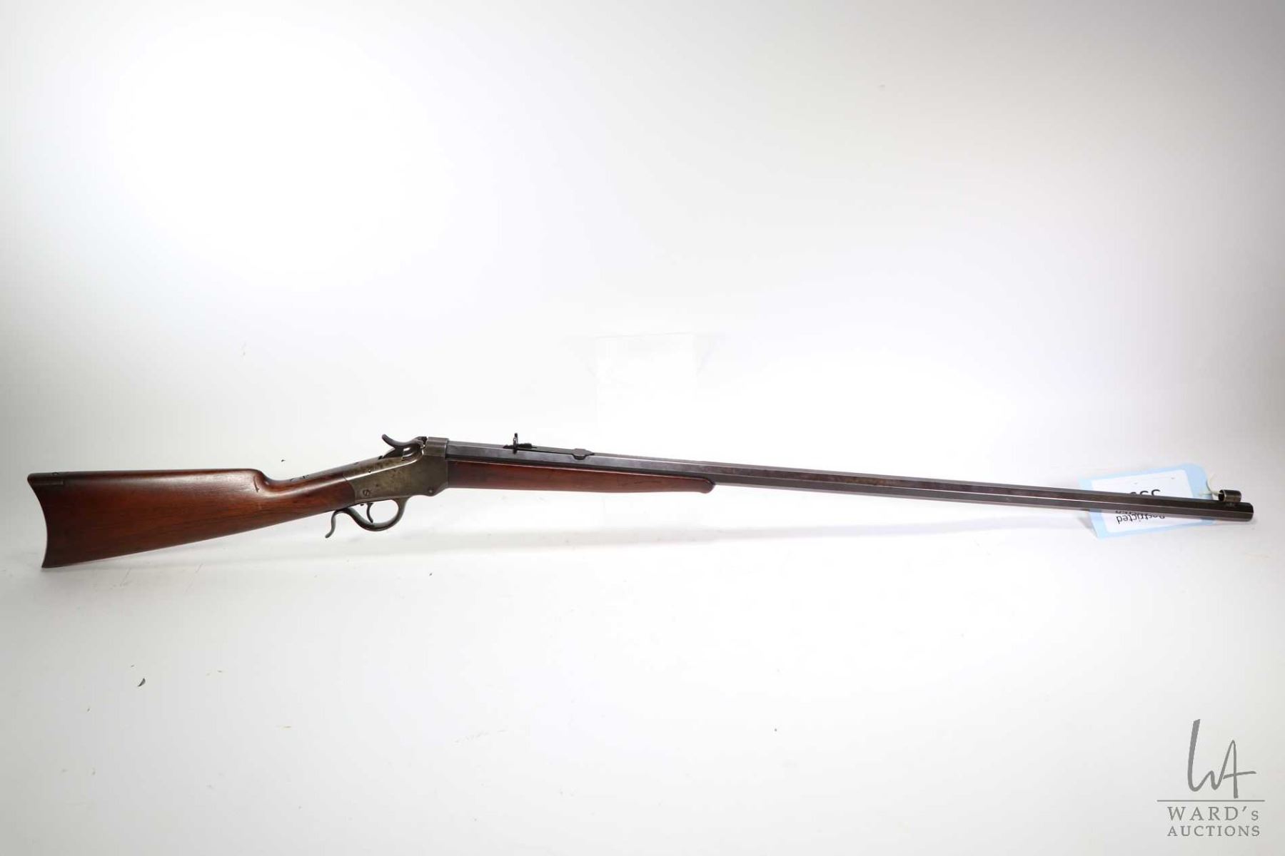 Non-Restricted rifle Winchester model Low Wall 1885, 25-20 S.S (Single Shot) Single Shot falling block, w/ bbl length 32" [Blued octagonal barrel turning brown grey. Fixed front and adjustable buckhorn sights. Smooth straight stock with metal butt plate. Lower tang stamped Pat. Oct 7th 79, followed by serial no. No stamp on upper tang. Bottom of barrel stamped with a number 1, just forward of forend. Action and trigger function very smoothly, above average. Appears to be original patina in above average condition with expected use, storage and handling marks to wood and metal.] serial # 72981,