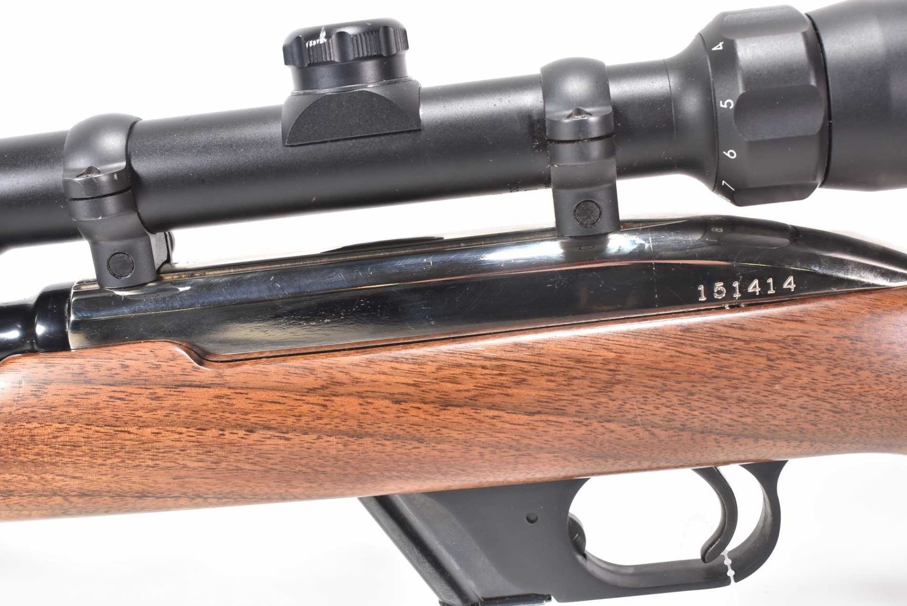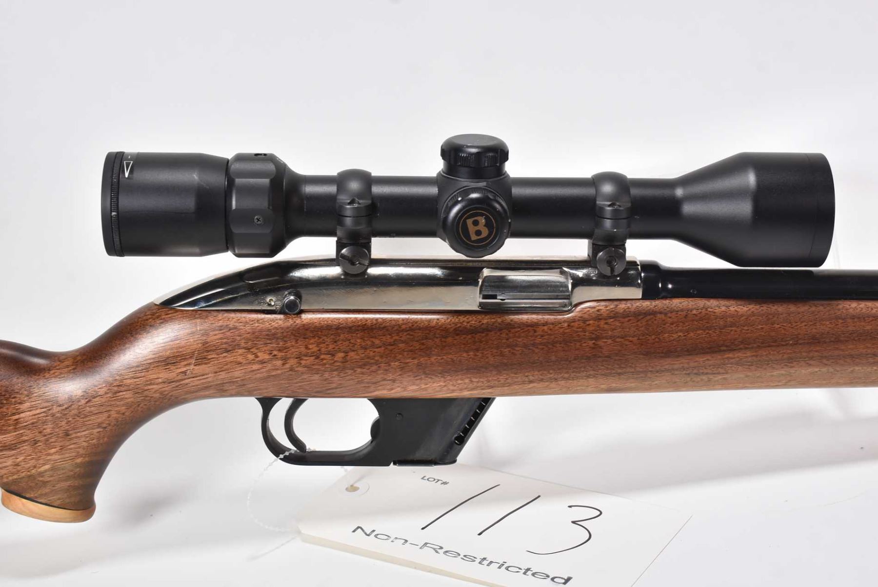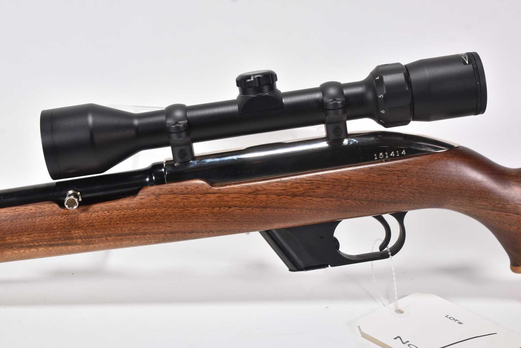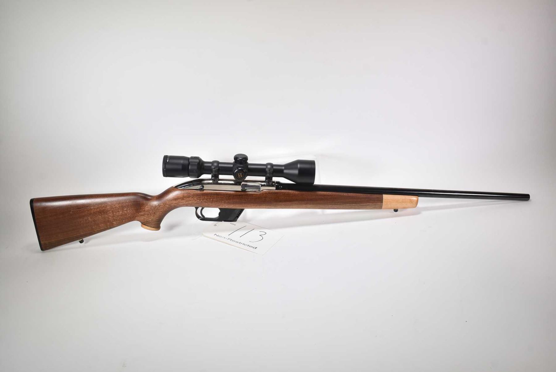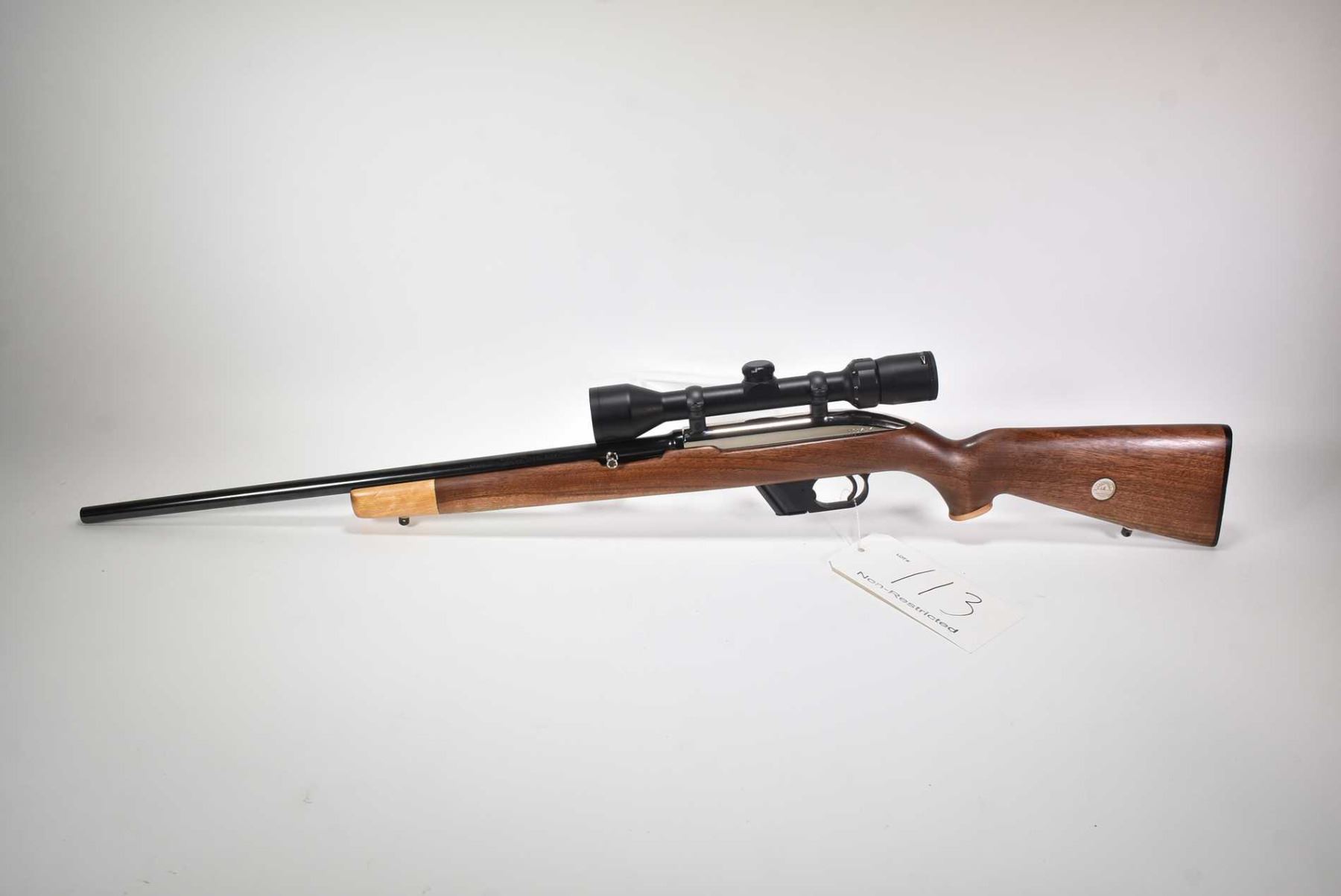 Non-Restricted rifle Winchester model Model 77, .22 LR Mag fed 10 shot semi automatic, w/ bbl length 22" [Blued barrel, chrome plated receiver. No fixed sights. Fitted with Bushnell High Contrast 3-9 scope. Two toned custom smooth wood stock with Canadian 2000 nickel inset on left sight, Winchester branded butt plate. Includes one removable box magazine. Appears to have had only light use with use, handling and storage marks on wood and metal.] serial # 151414, PAL required