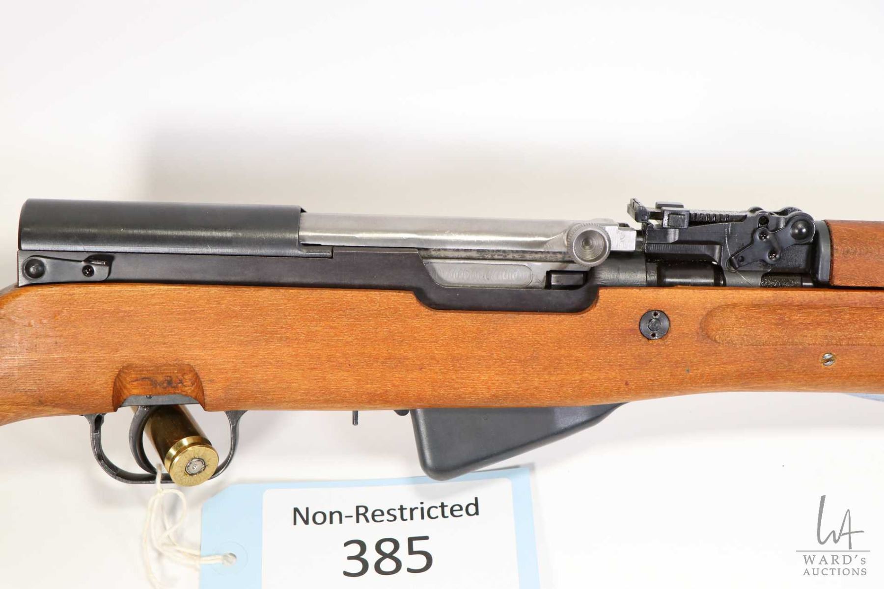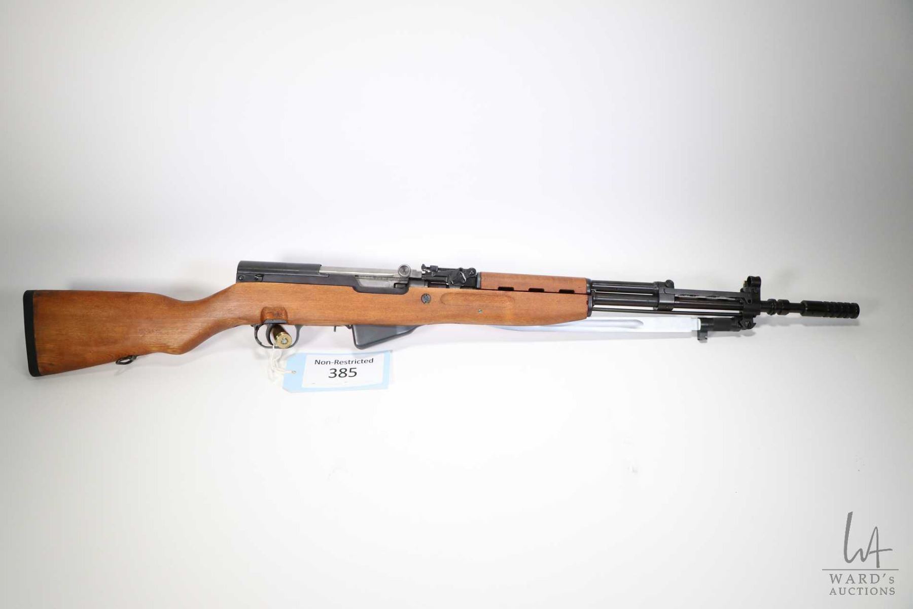 Non-Restricted rifle Yugo model SKS, 7.62 X 39mm five shots semi automatic, w/ bbl length 21" [Blued barrel and receiver. Adjustable fixed sights. Stainless bolt and smooth wooden stock with recoil pad. Includes one magazine. Folding bayonet, grenade launcher and night sights. Matching serial number on receiver, magazine, bolt and stock. Note grenade launcher uses a blank cartridge to launch. Electric pencil number 57892 is found in front of trigger and on underside of sight block. Appears in near 100% surplus condition with only minor use and handling marks.] serial # R644268, PAL required