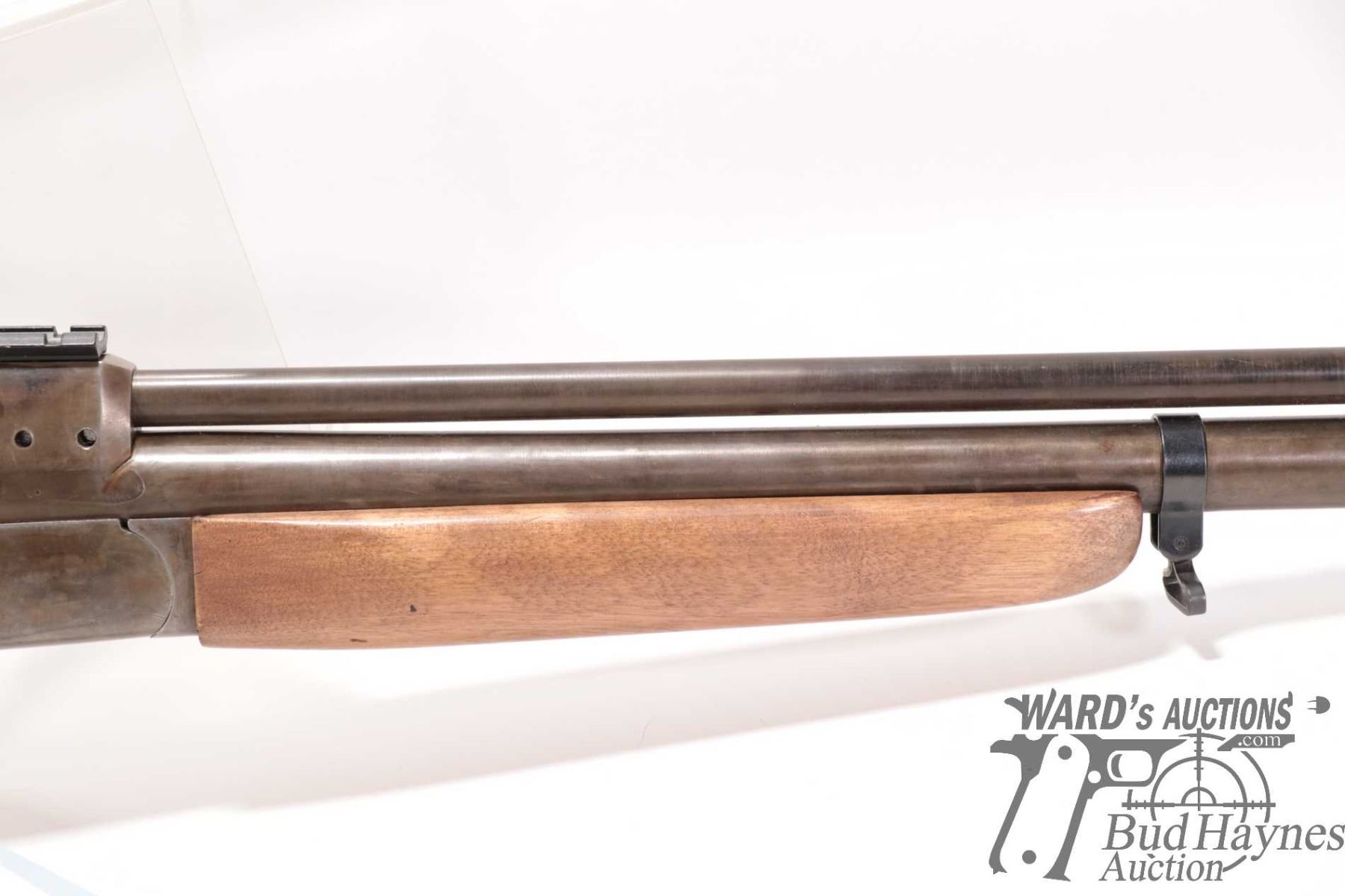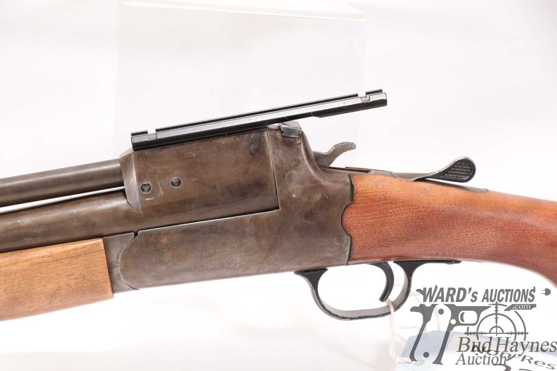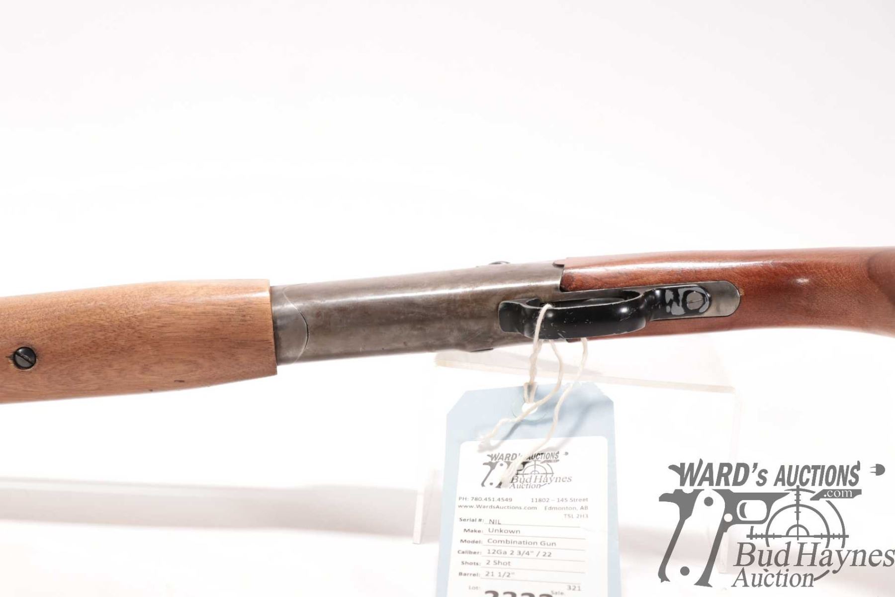 Non-Restricted rifle/shotgun Unknown model Combination gun, 12 ga. 2 3/4", 22 Hornet? Two shot hinge break, w/ bbl length 21 1/2" [Re-cold blued finish over stripped metal. Fixed front sight and no rear sight. Fitted with non-original scope base. Smooth wooden stock with broken butt plate. Chambering of top barrel not confirmed, .22 cal at muzzle. Mechanically appears to function. Original bluing appears mechanically removed with tooling marks visible plus other use, handling and storage marks.] serial # NIL, PAL required