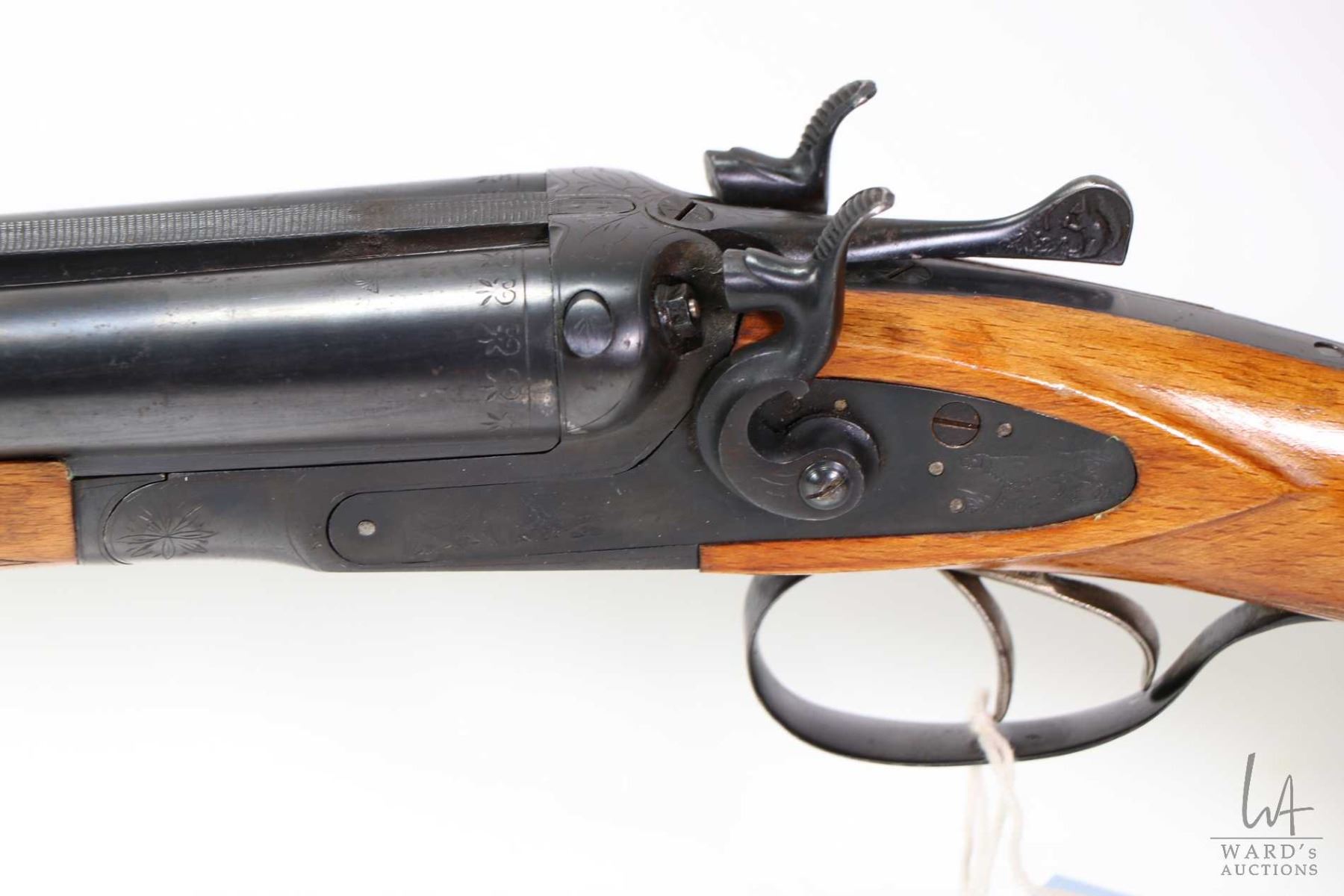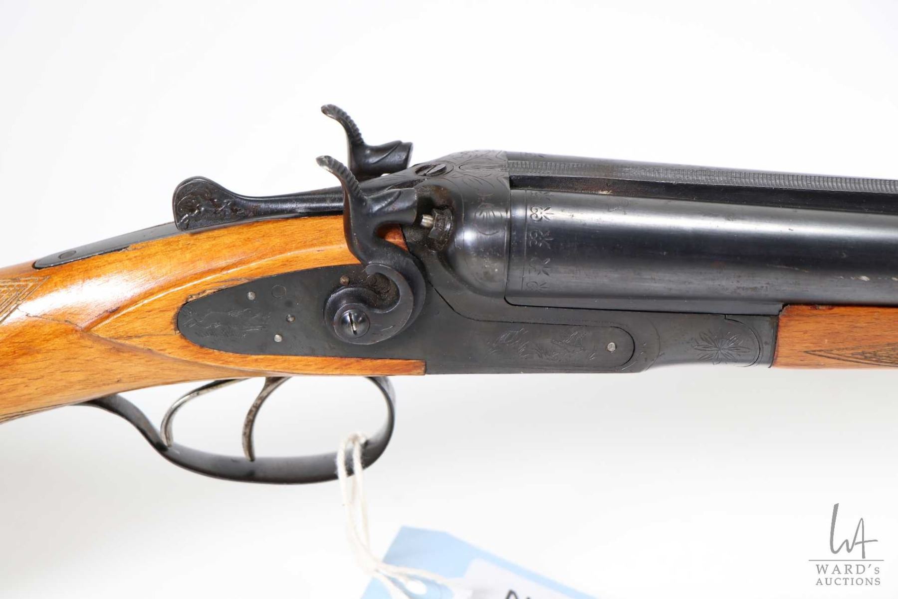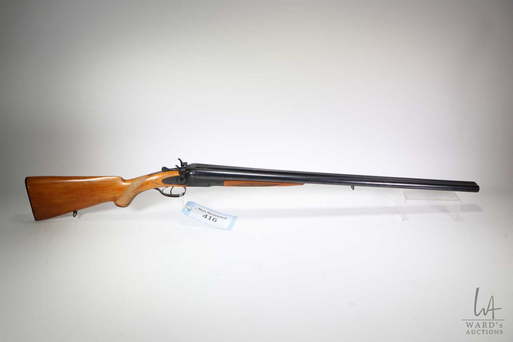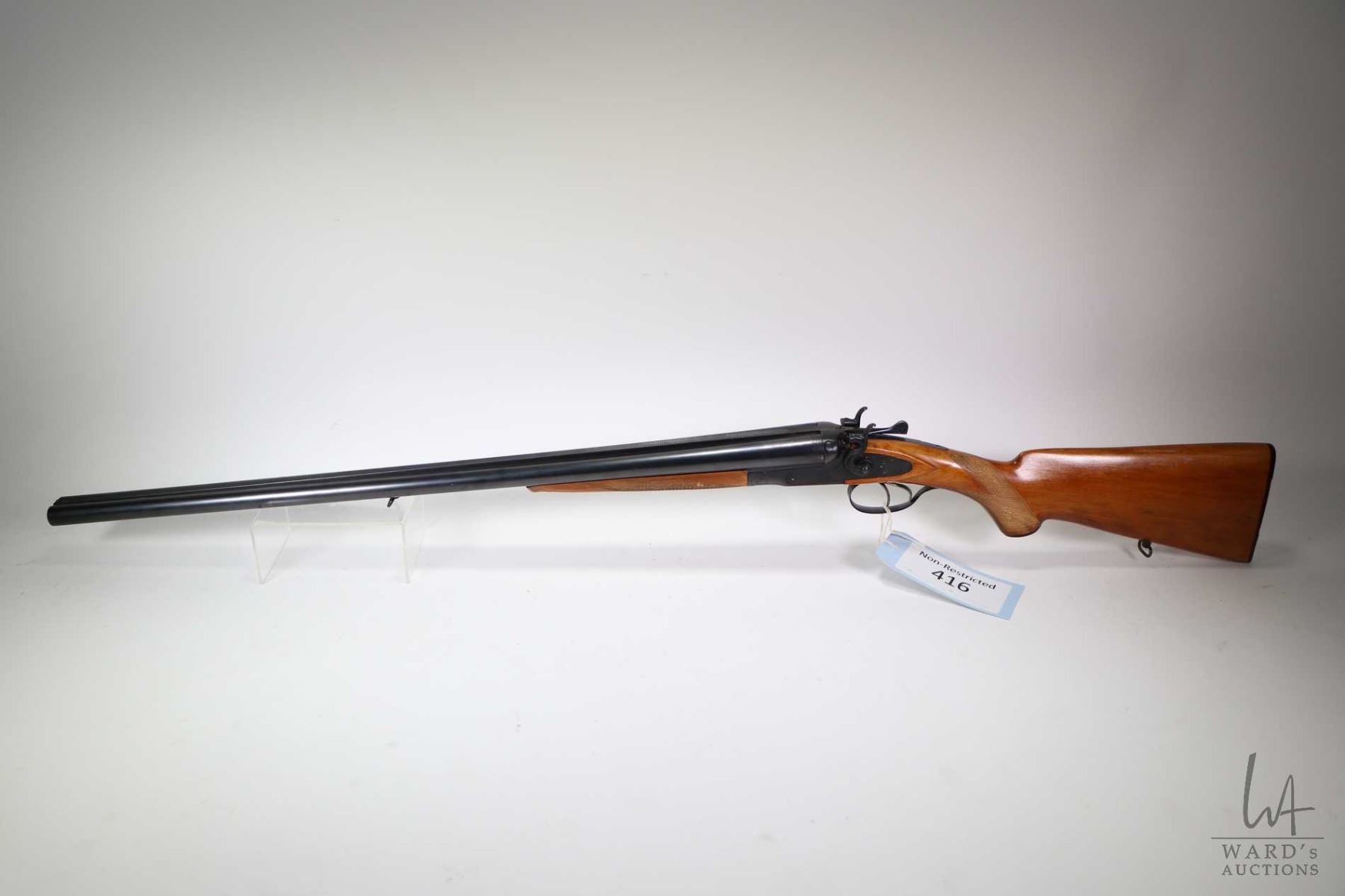 Non-Restricted shotgun Baikal model Side by Side, 16 ga. two shot hinge break, w/ bbl length 28-1/4" [Blued side X side barrel with single bead sight. Textured center strap. Blued lock/receiver with engraved scrollwork, game birds and hunting dogs. Wooden stock with checkered semi pistol grip and forend. Hinge is tight to open and right side hammer does not lock. Finish worn on pistol grip and other common areas. Use, handling and storage marks on wood and metal.] serial # BN7556, PAL required