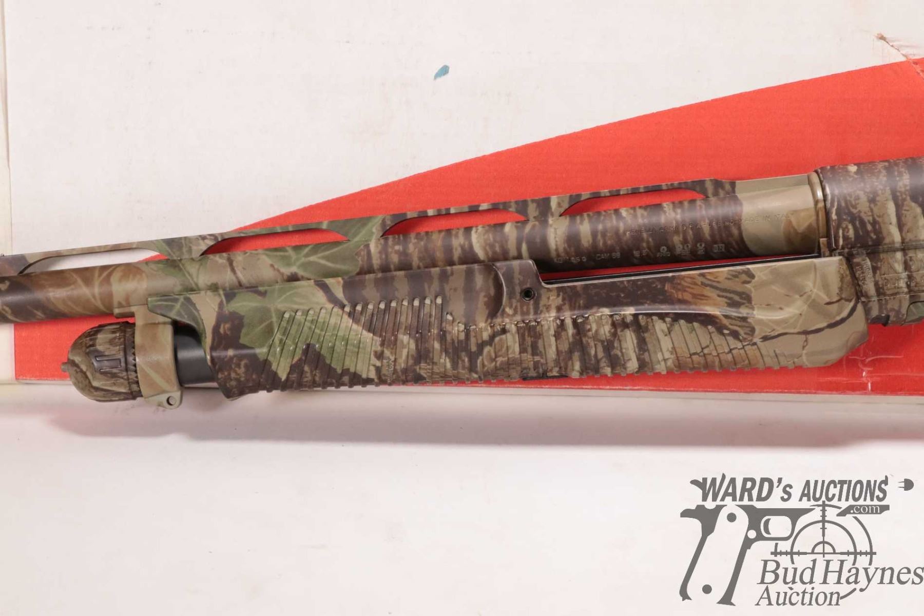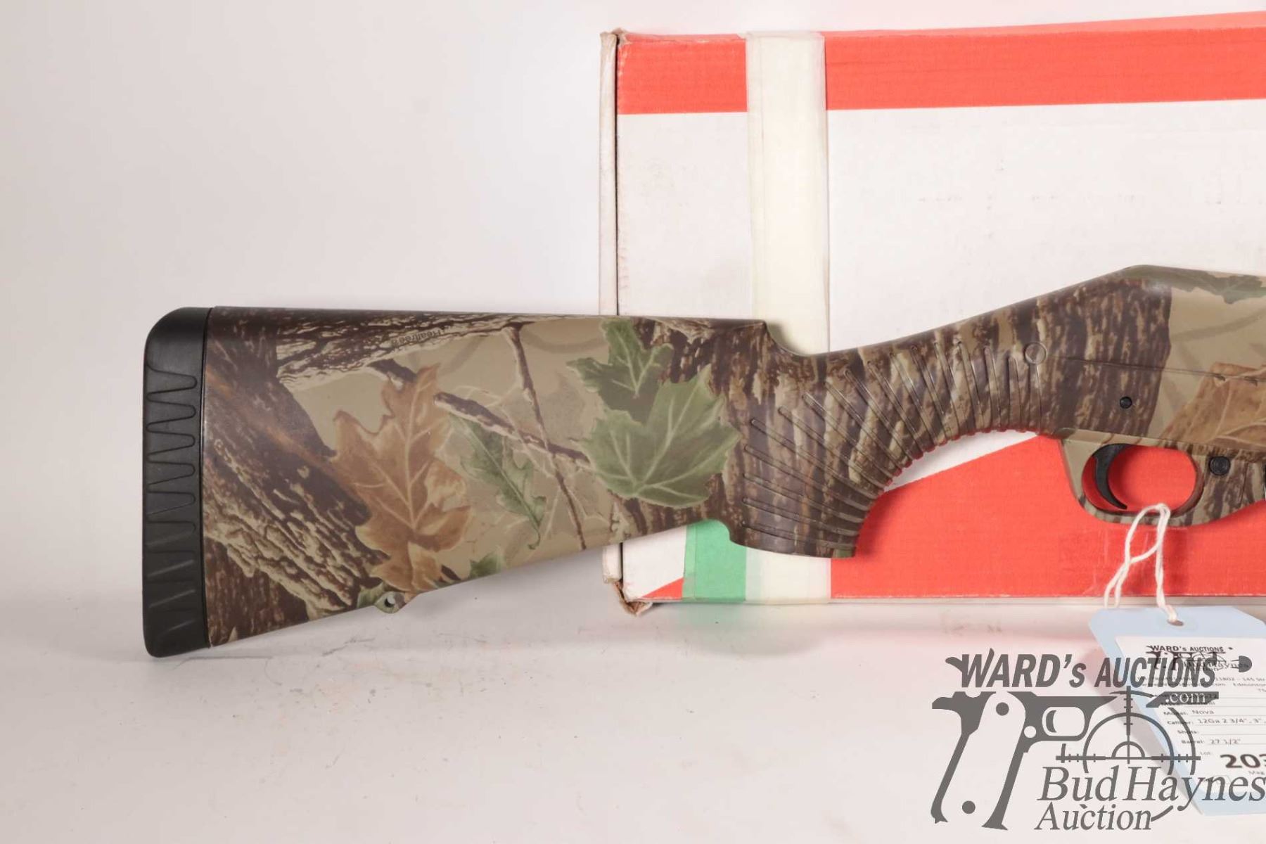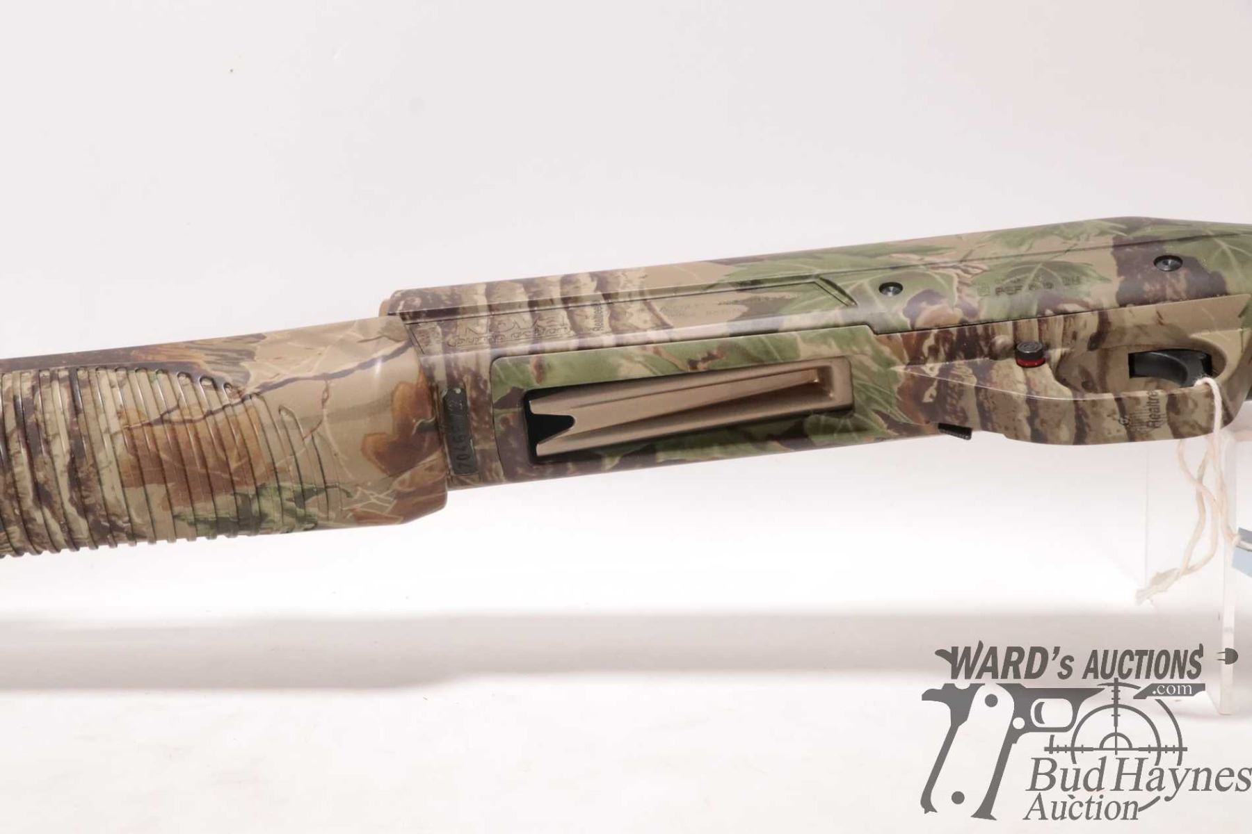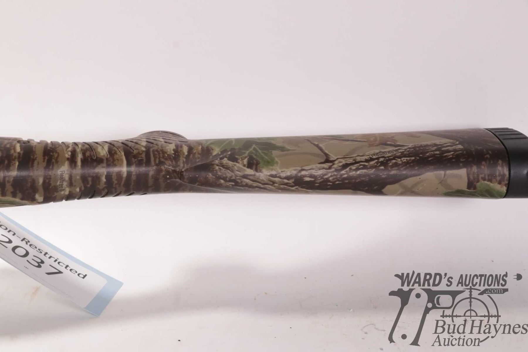 Non-Restricted shotgun Benelli model Nova, 12 ga. 2 3/4"-3 1/2" pump action, w/ bbl length 27 1/2" [RealTree Camouflage shotgun with double bead sight and fiber optic insert. Tubular magazine. Includes original box, manual and three screw in chokes. Mechanically and aesthetically appear near excellent. Possibly only factory test fired.] serial # Z046672, PAL required