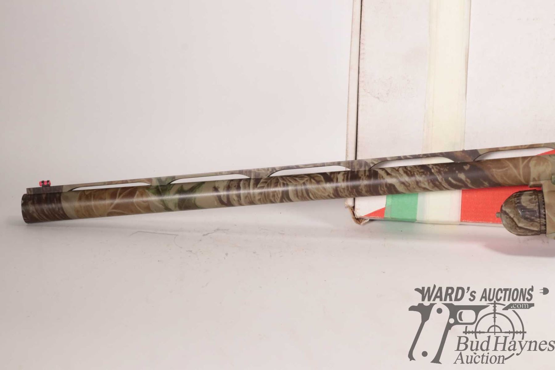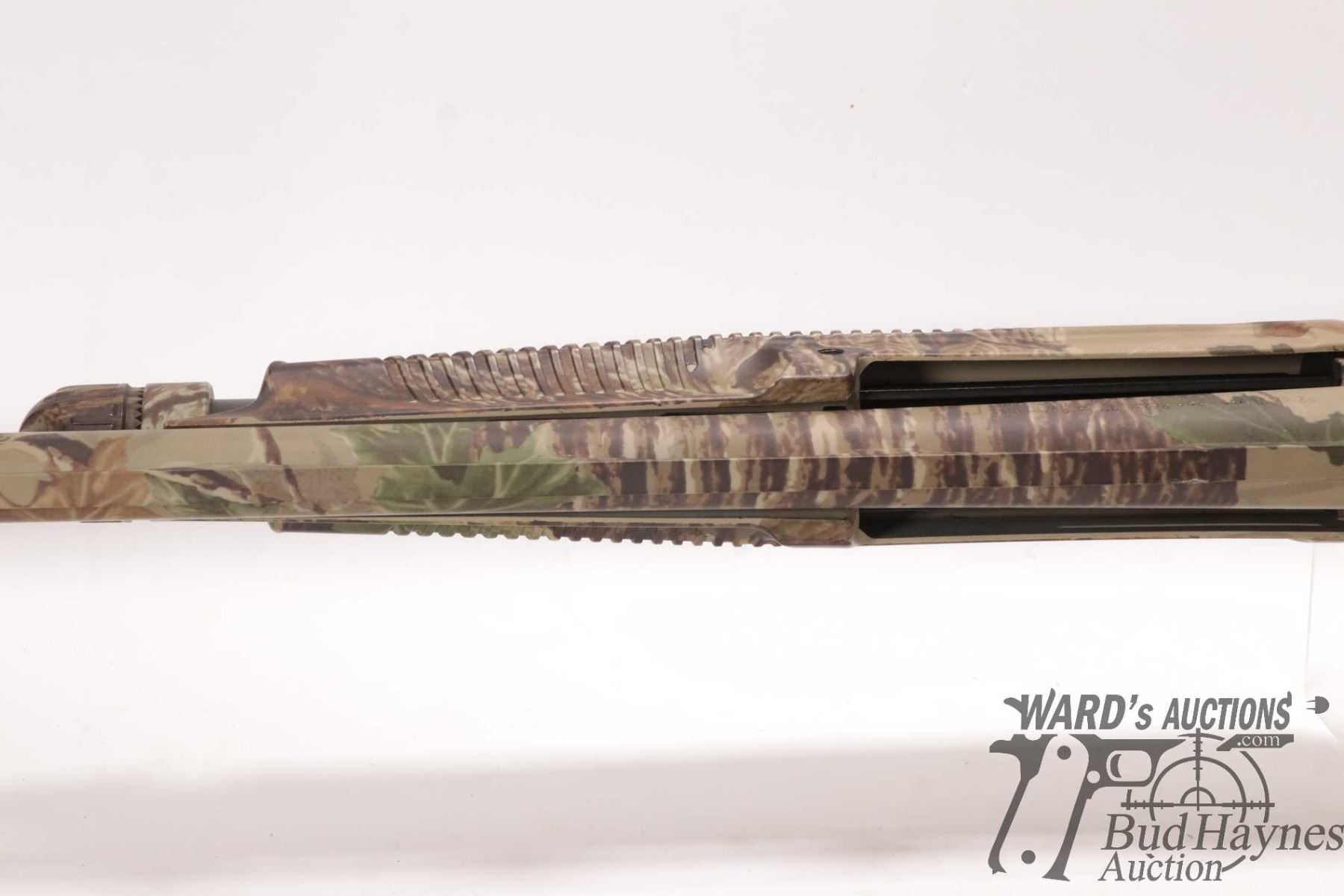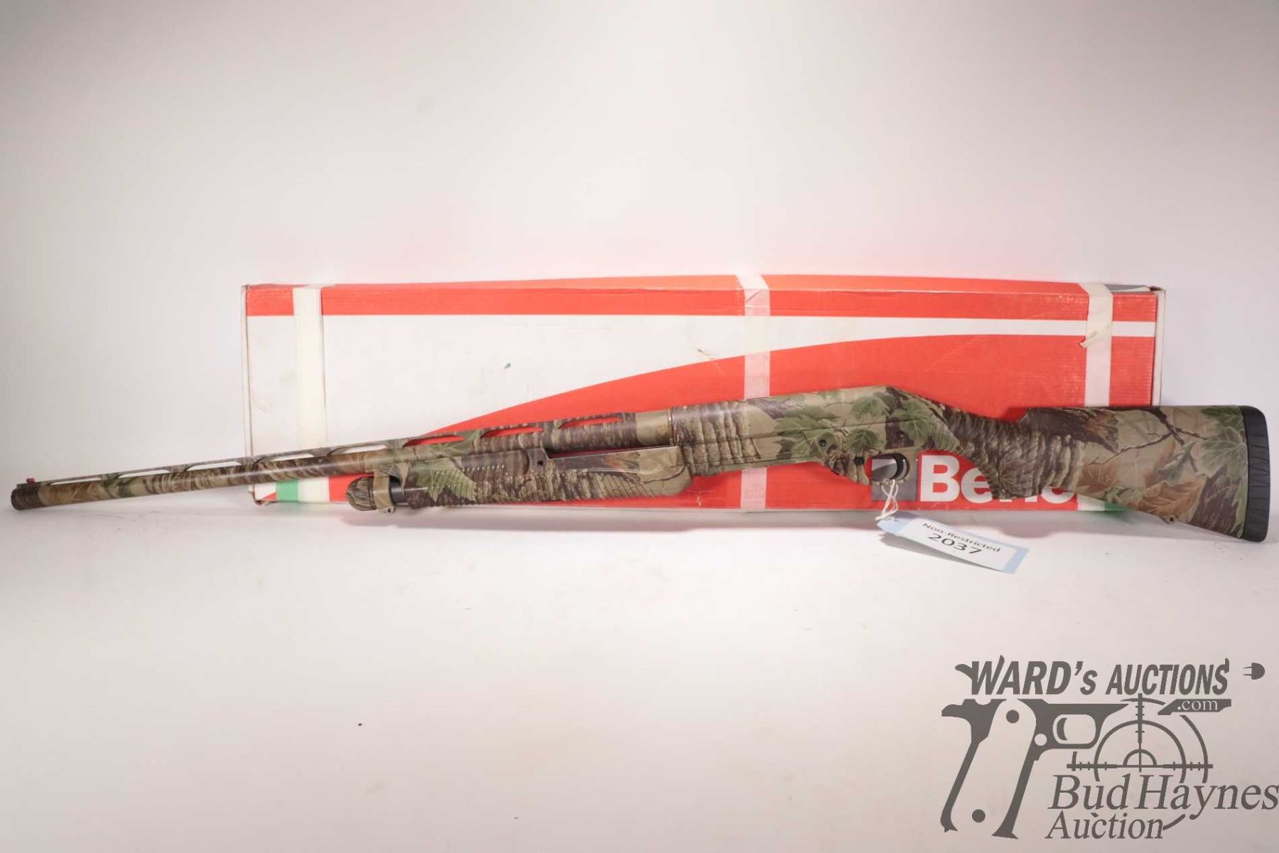 Non-Restricted shotgun Benelli model Nova, 12 ga. 2 3/4"-3 1/2" pump action, w/ bbl length 27 1/2" [RealTree Camouflage shotgun with double bead sight and fiber optic insert. Tubular magazine. Includes original box, manual and three screw in chokes. Mechanically and aesthetically appear near excellent. Possibly only factory test fired.] serial # Z046672, PAL required