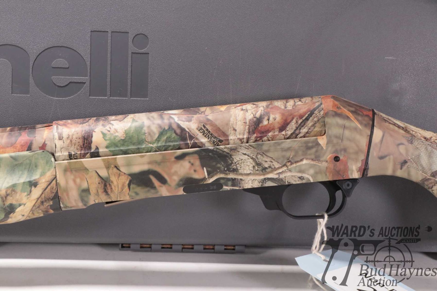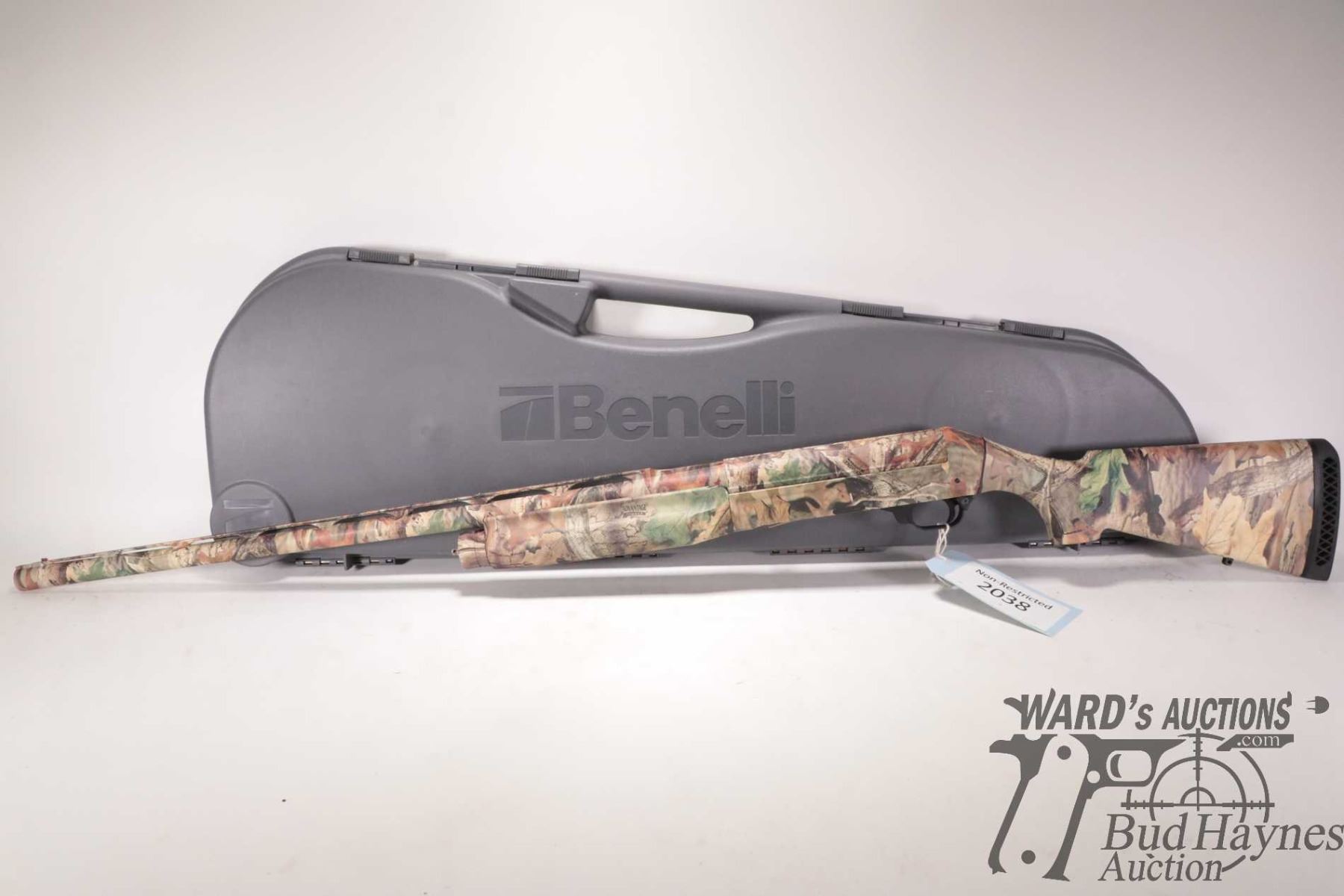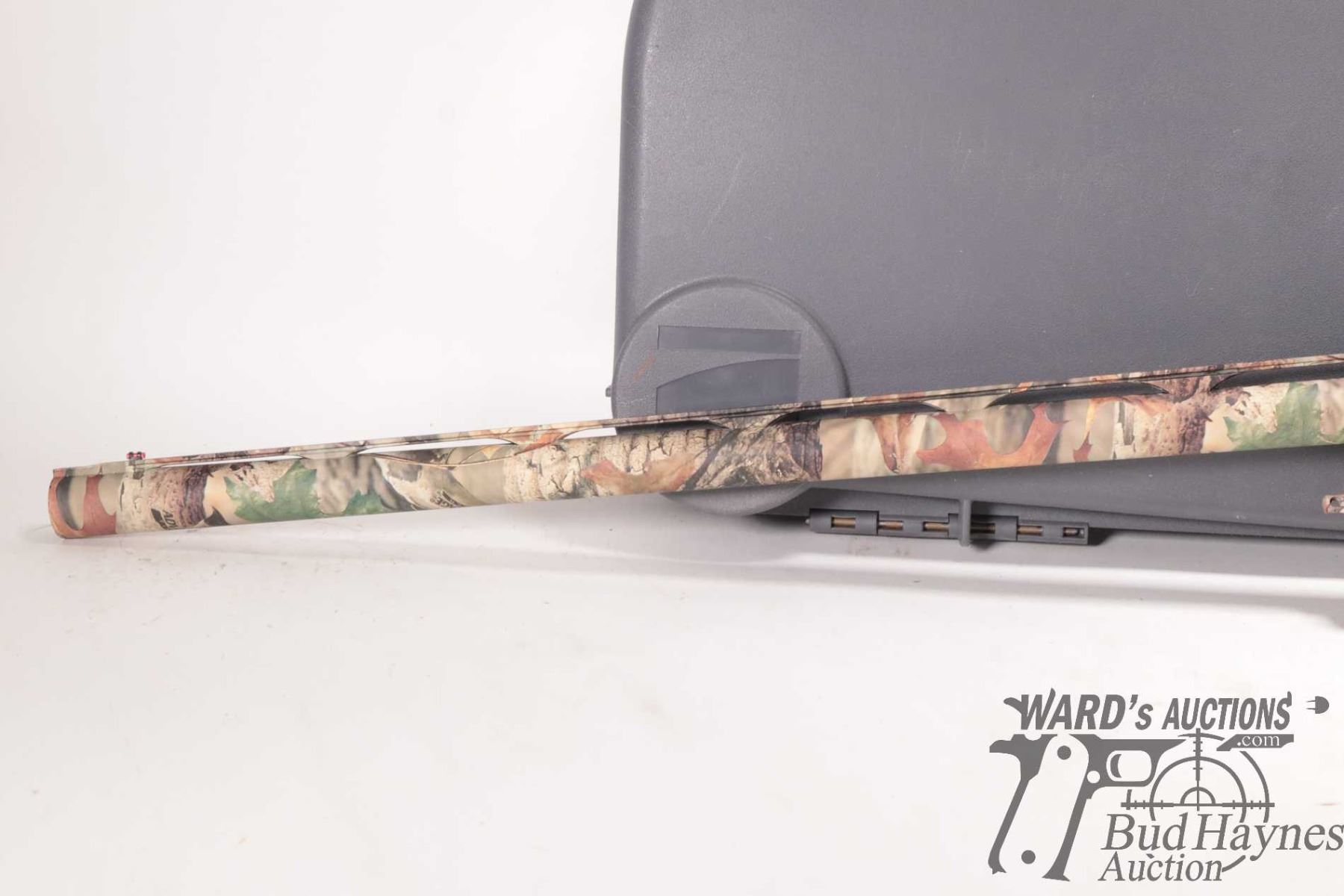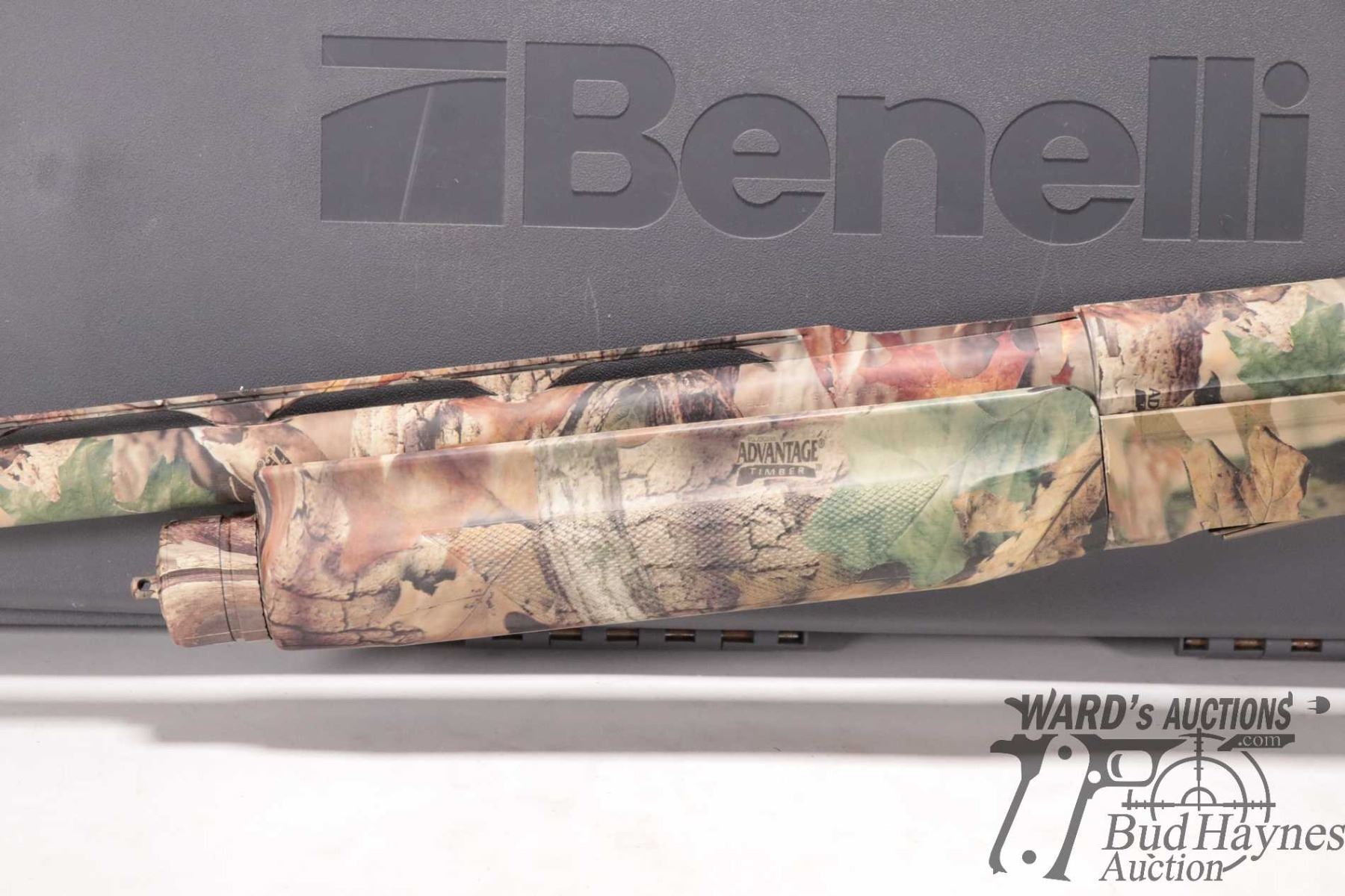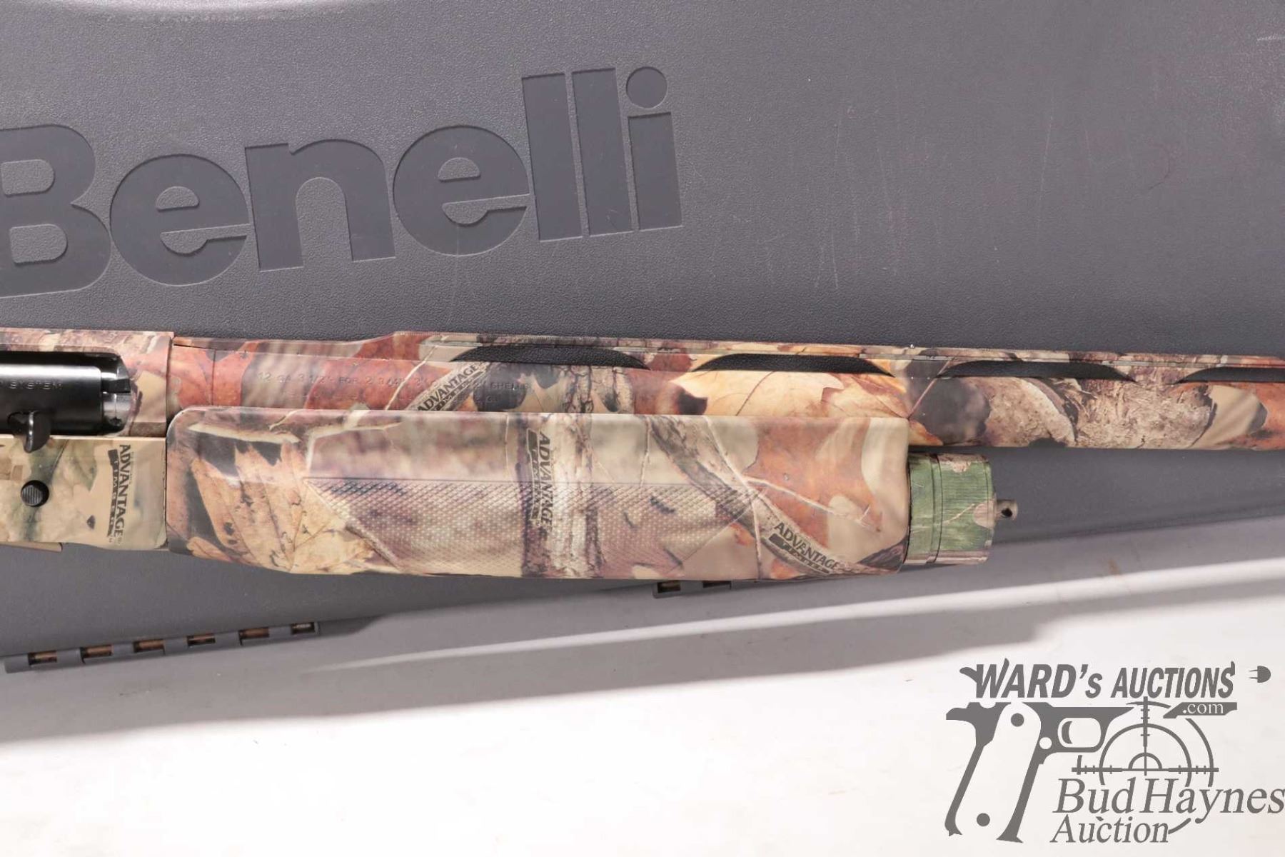 Non-Restricted shotgun Benelli model Super Black Eagle, 12 ga. 2 3/4"- 3 1/2" semi automatic, w/ bbl length 27 1/2" muzzle diameter (Threaded)] [Advantage Timber Camouflaged shotgun with ribbed barrel, double bead sight and front fiber optic insert. Tubular magazine. Includes molded plastic case, five screw in chokes etc. Mechanically and aesthetically appear excellent. Possibly only factory fired.] serial # U192969, PAL required