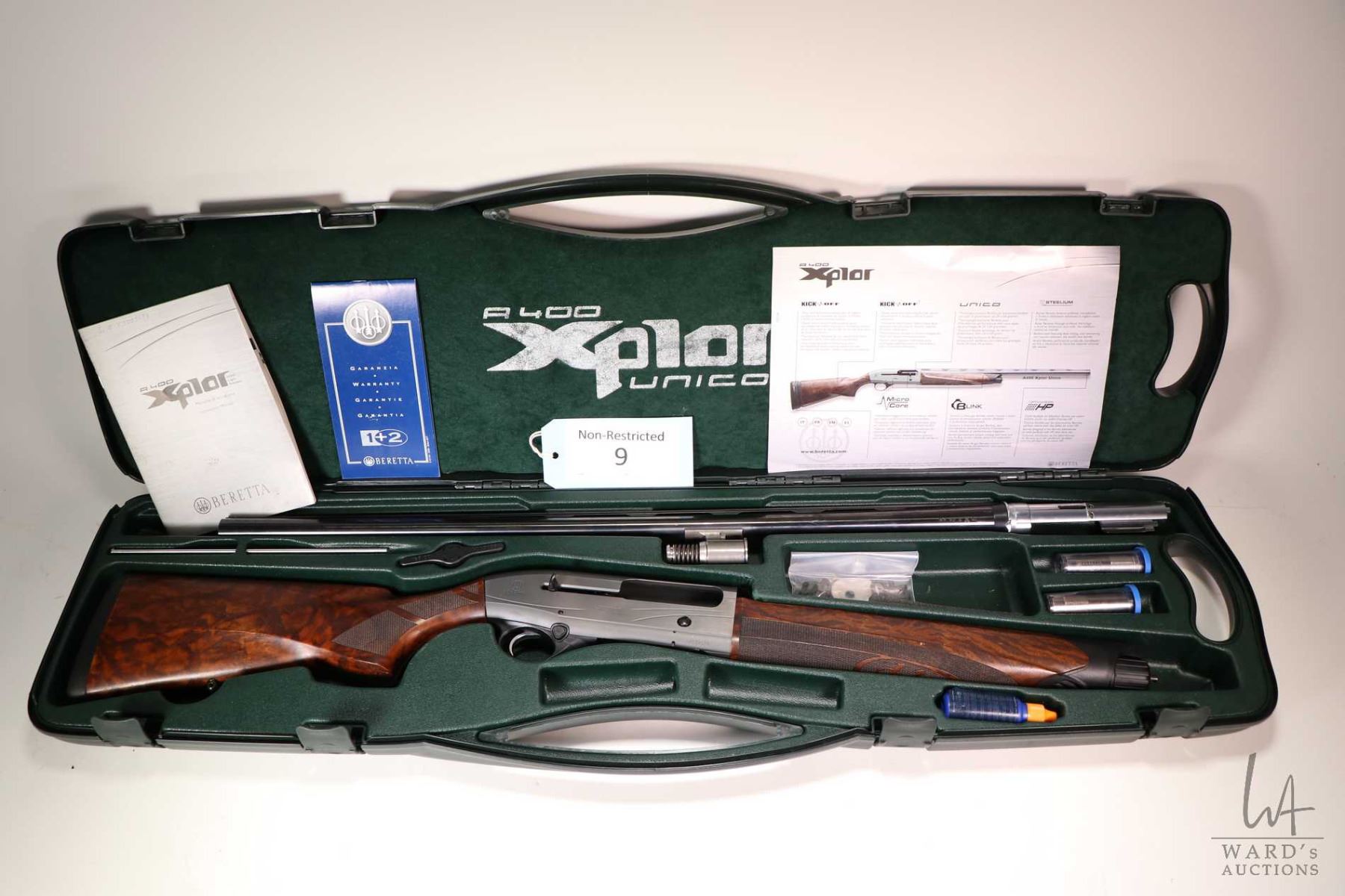 Non-Restricted shotgun Beretta model A400 XPLOR UNICO, 12 gauge 2 3/4"-3 1/2" semi automatic, w/ bbl length 28" [Blued Steelium ribbed barrel with single bead front sight. Titanium coloured alloy receiver. Deluxe wooden stock and forend with checkering. Appears to have had very little use, minor use and handling marks. Includes three removable chokes, choke tool, manuals and other accessories in fitted hard case.] serial # XAO39078, PAL required