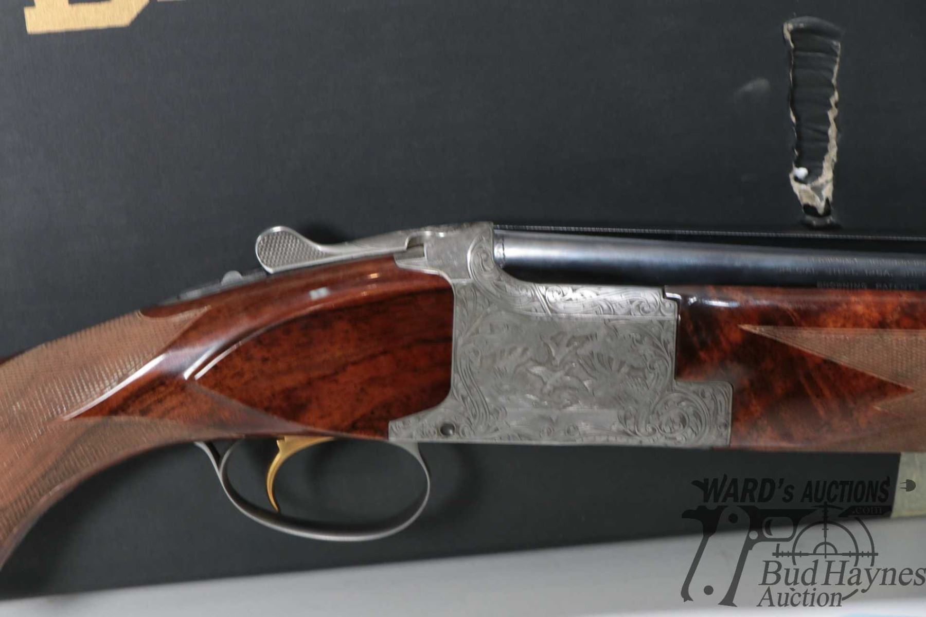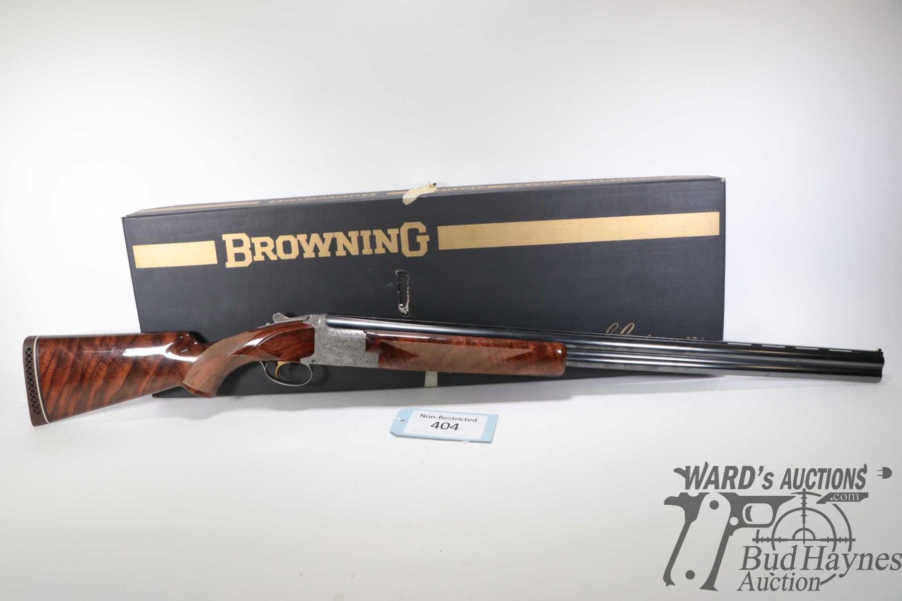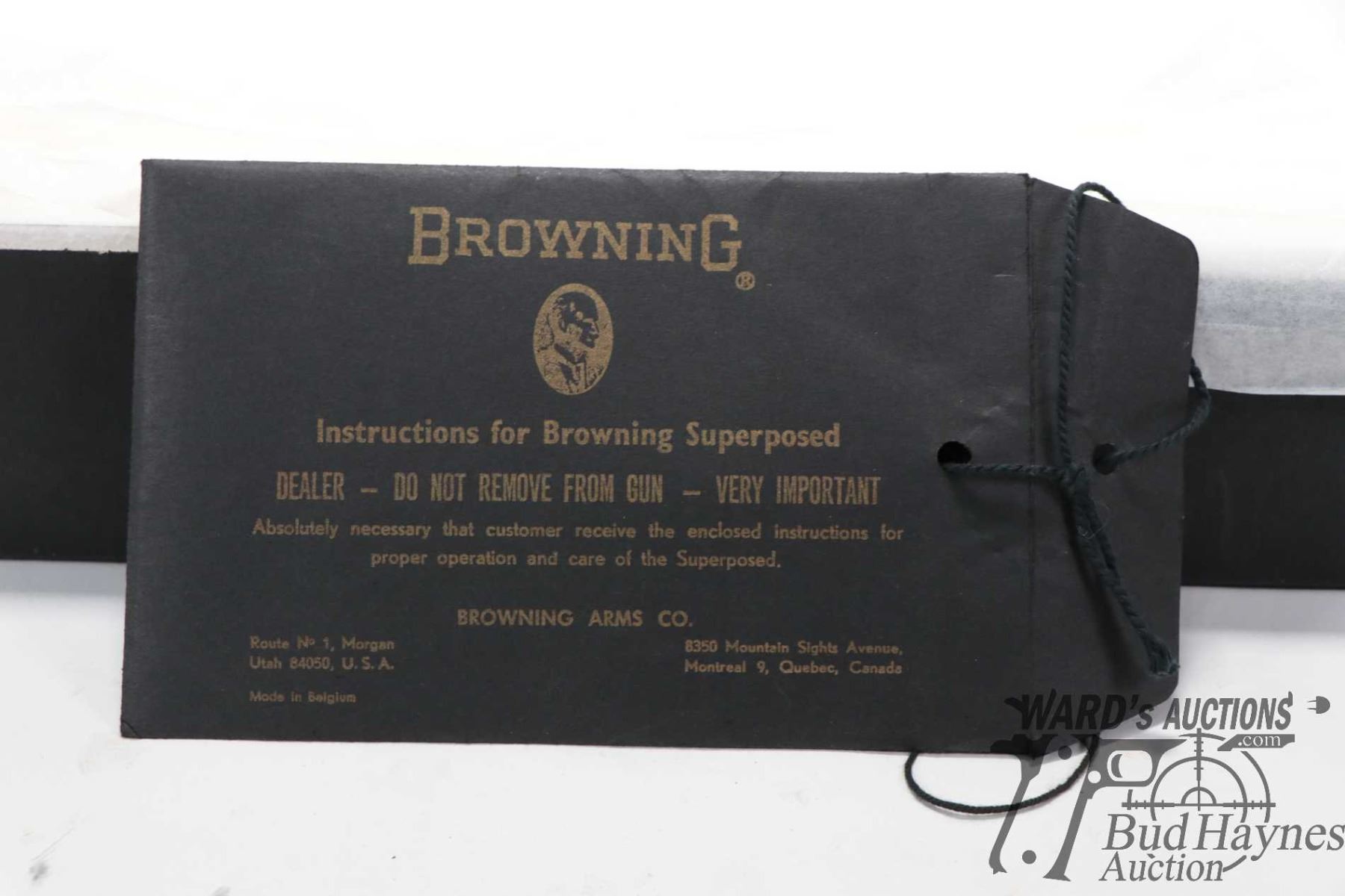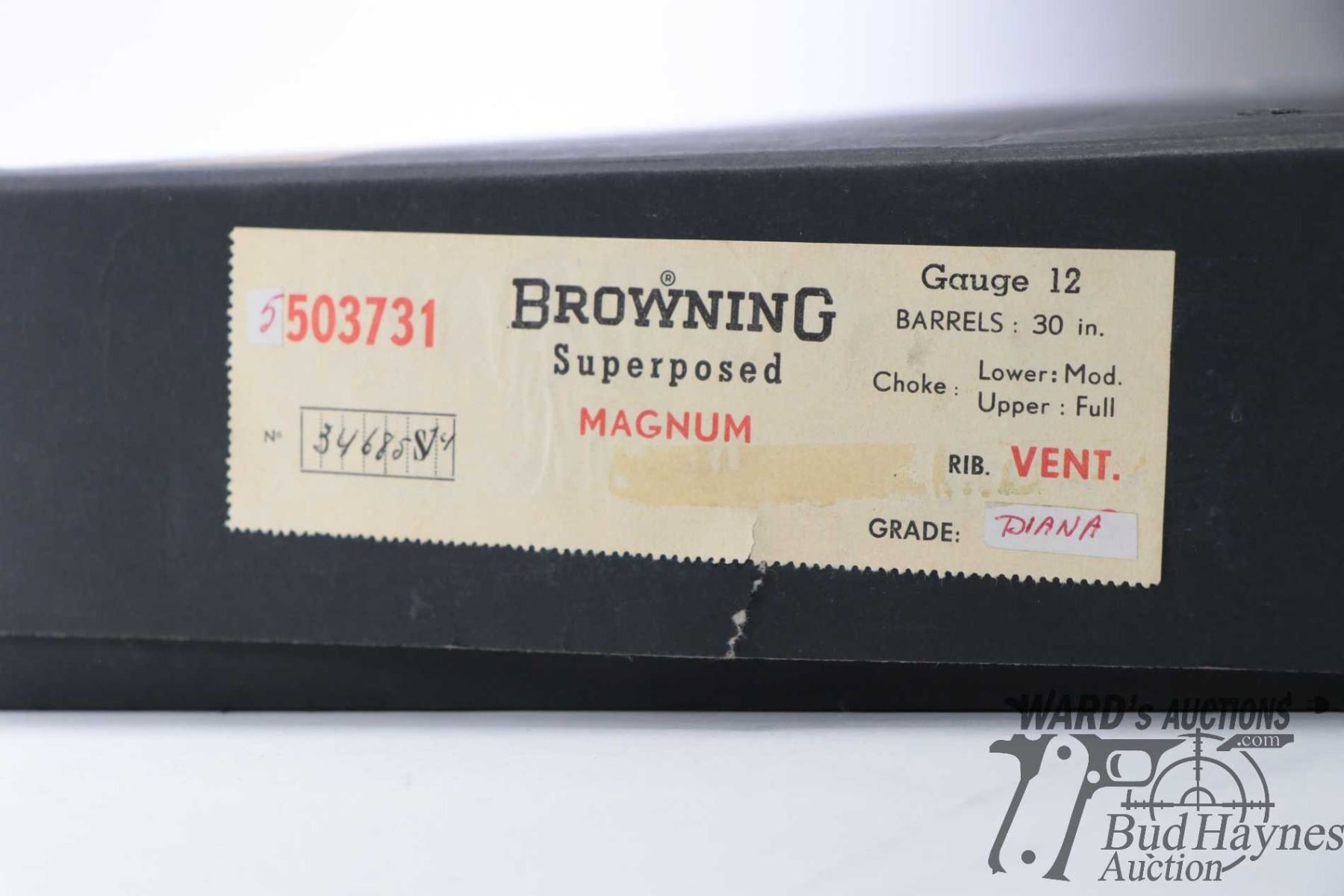 Non-Restricted shotgun Browning model Superposed (Grade Diana), 12Ga 3" Two shot hinge break, w/ bbl length 30" [Choked markings include (* & **), bore diameter as measured 6" from muzzle (Top .7225 & bottom .7215), muzzle diameter (Top .6865 & bottom .7045)] [Blued ribbed barrels with single bead sight. Beautifully engraved and antique white metal receiver featuring intricate game birds, waterfowl, rabbits and scrollwork. Semi-deluxe hardwood stock with branded recoil pad. Includes original foam lined cardboard box and documentation. Marked 'MADE IN BELGIUM'. Mechanically appears excellent and was obviously use lightly and respectfully. Only minor use, handling and storage marks.] serial # 34685S74, PAL required. Descriptions subject to change.