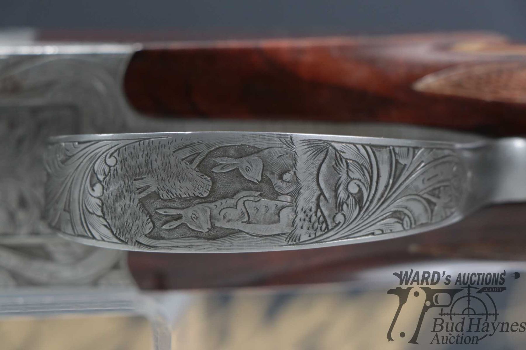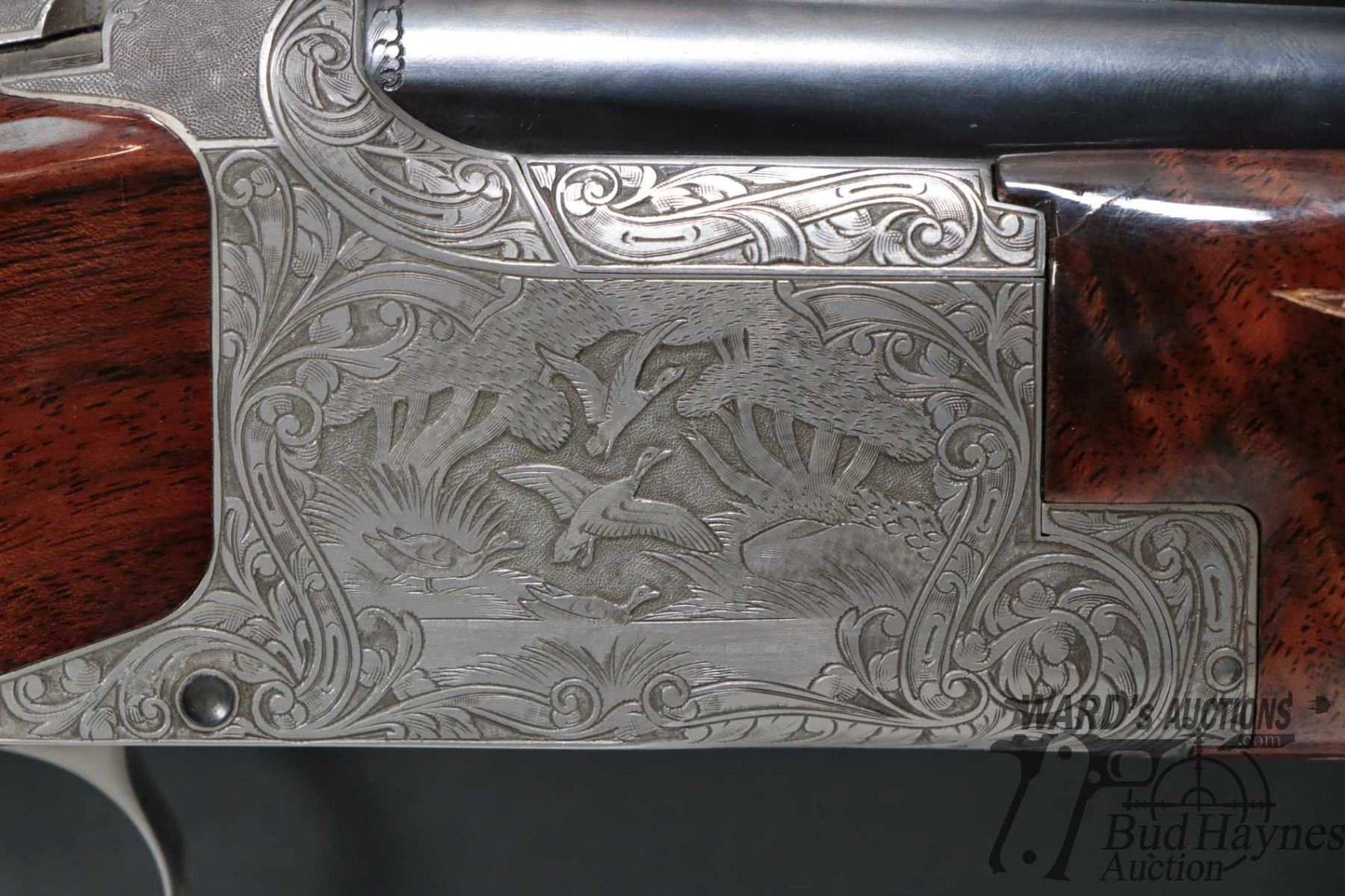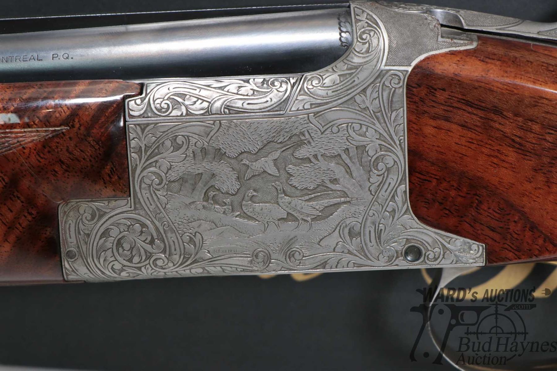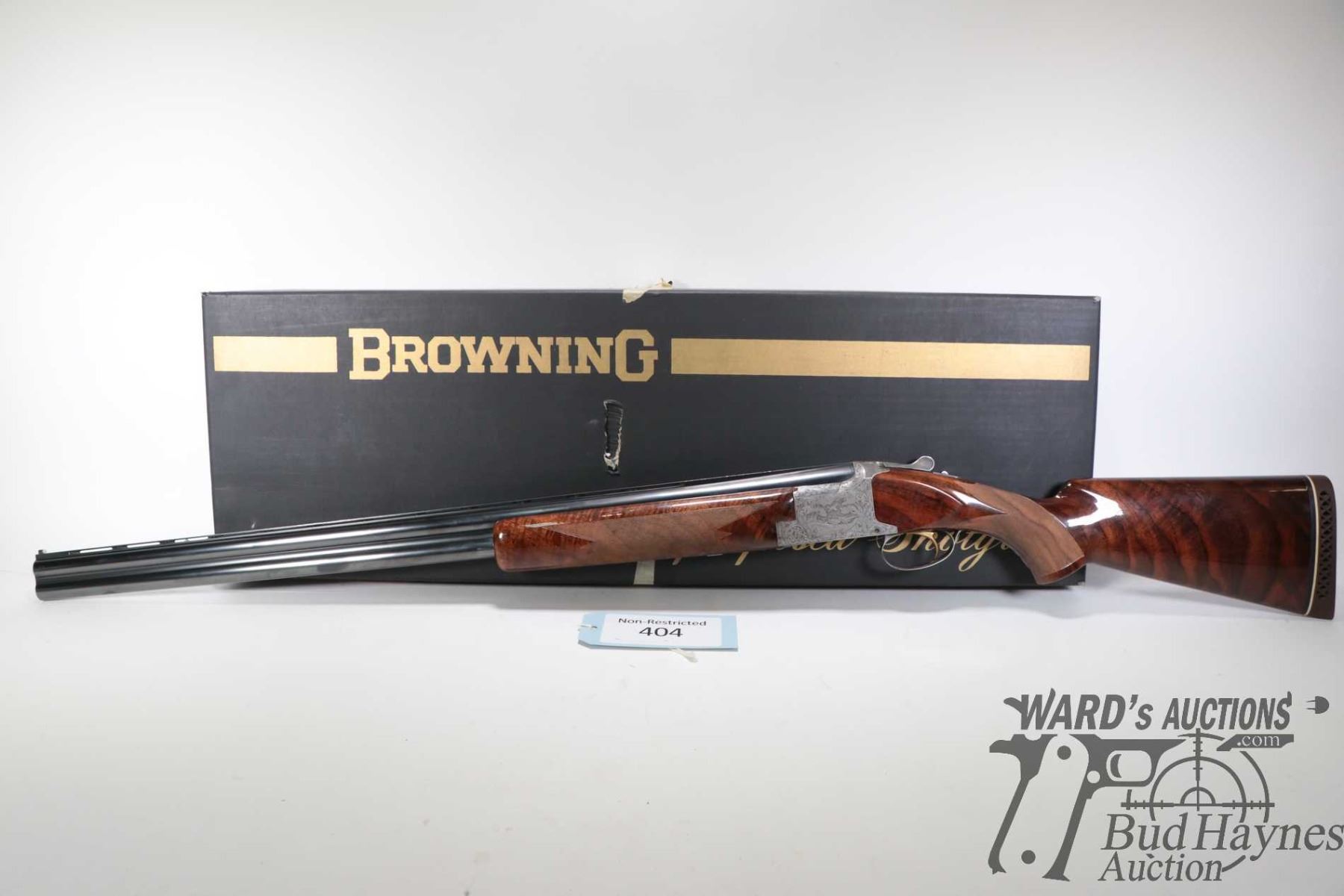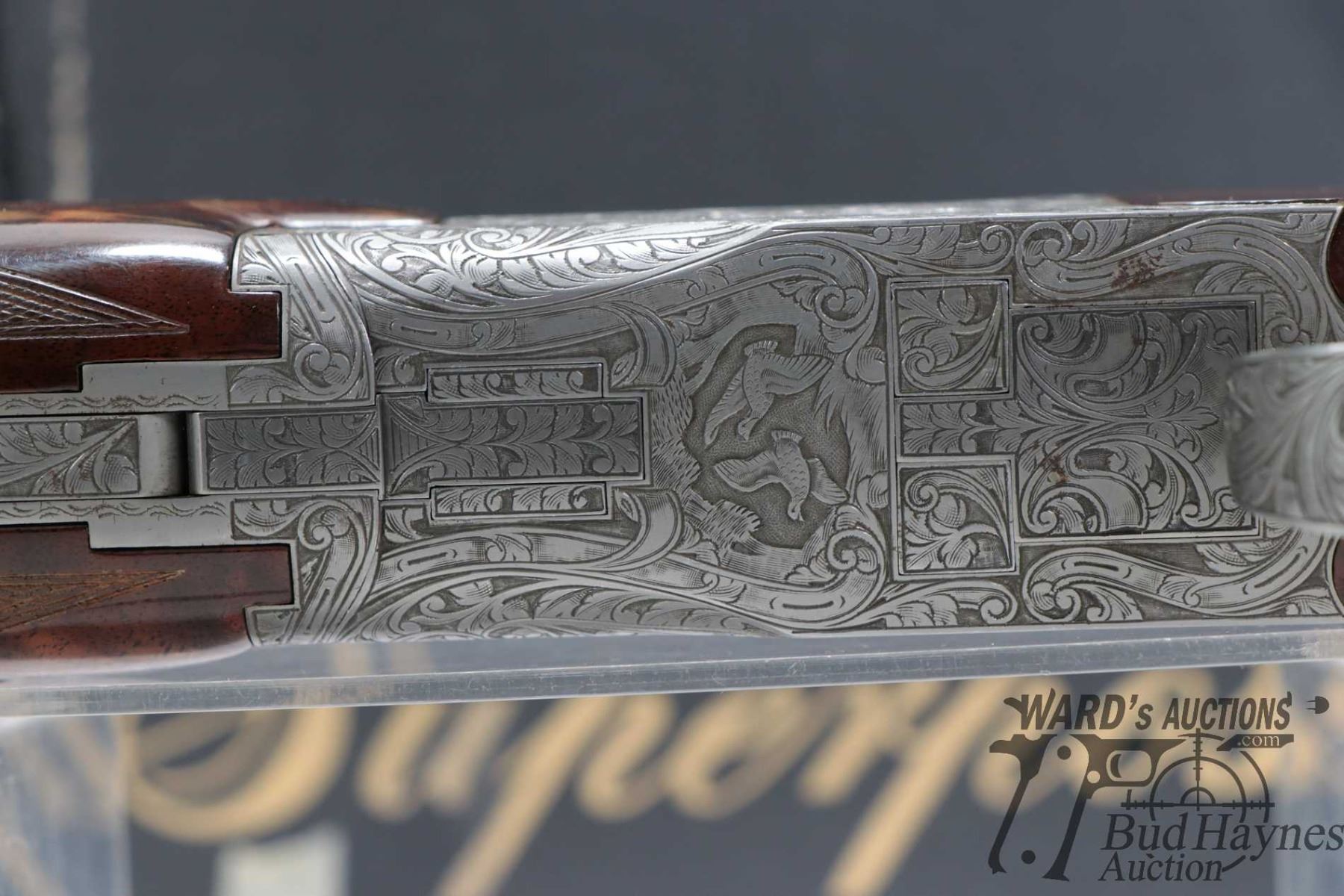 Non-Restricted shotgun Browning model Superposed (Grade Diana), 12Ga 3" Two shot hinge break, w/ bbl length 30" [Choked markings include (* & **), bore diameter as measured 6" from muzzle (Top .7225 & bottom .7215), muzzle diameter (Top .6865 & bottom .7045)] [Blued ribbed barrels with single bead sight. Beautifully engraved and antique white metal receiver featuring intricate game birds, waterfowl, rabbits and scrollwork. Semi-deluxe hardwood stock with branded recoil pad. Includes original foam lined cardboard box and documentation. Marked 'MADE IN BELGIUM'. Mechanically appears excellent and was obviously use lightly and respectfully. Only minor use, handling and storage marks.] serial # 34685S74, PAL required. Descriptions subject to change.