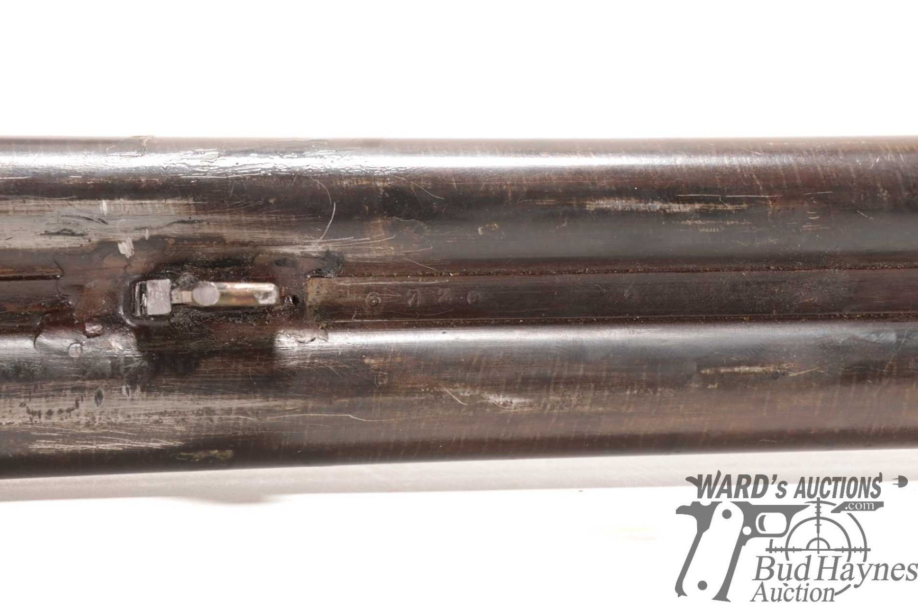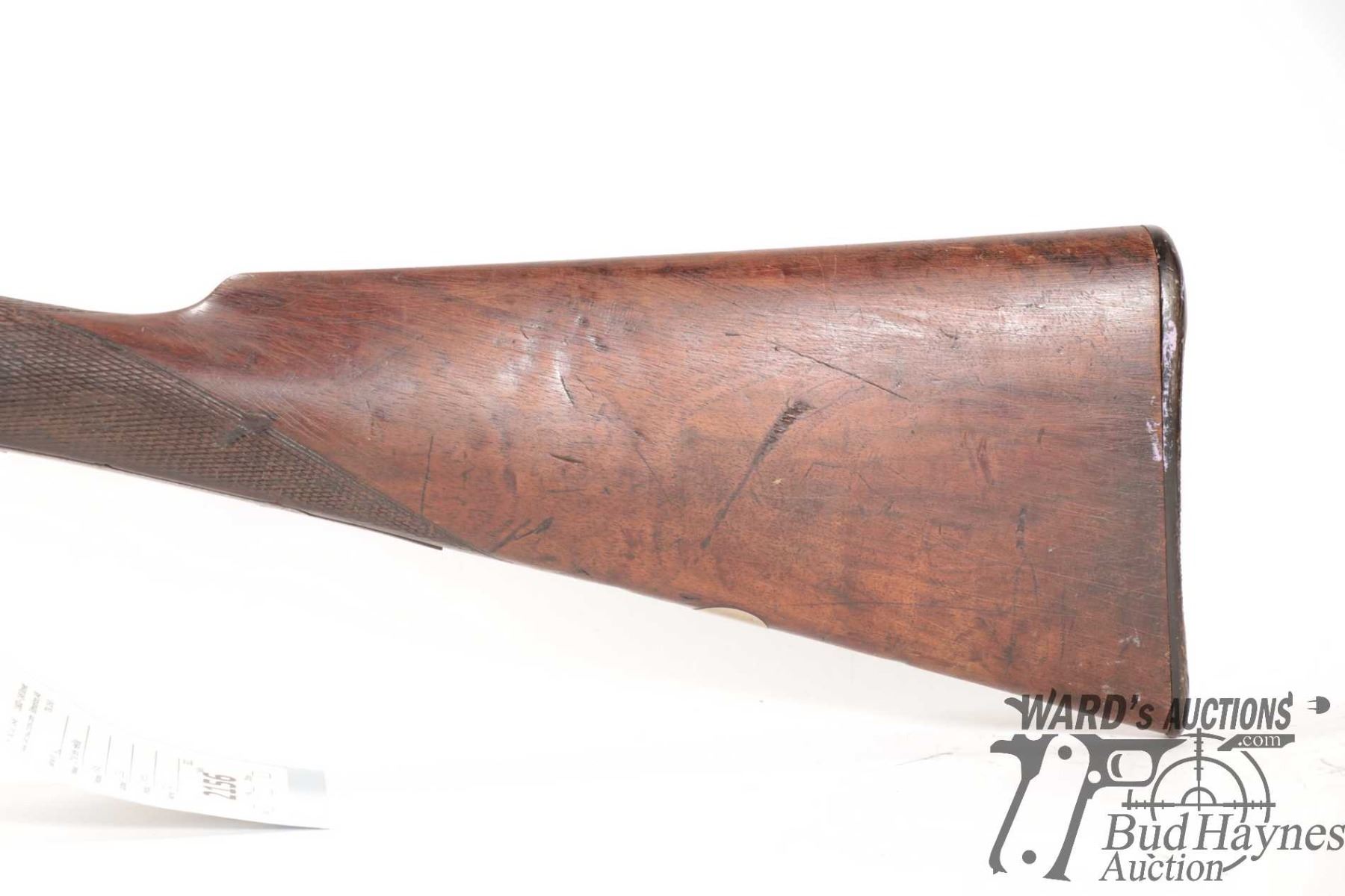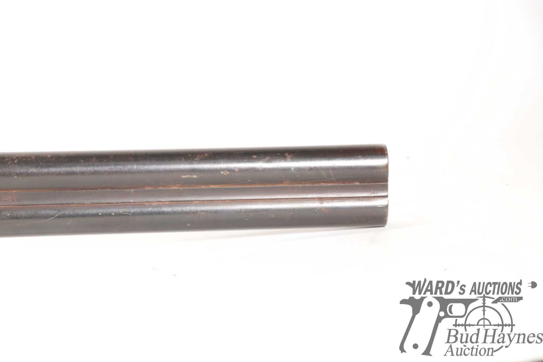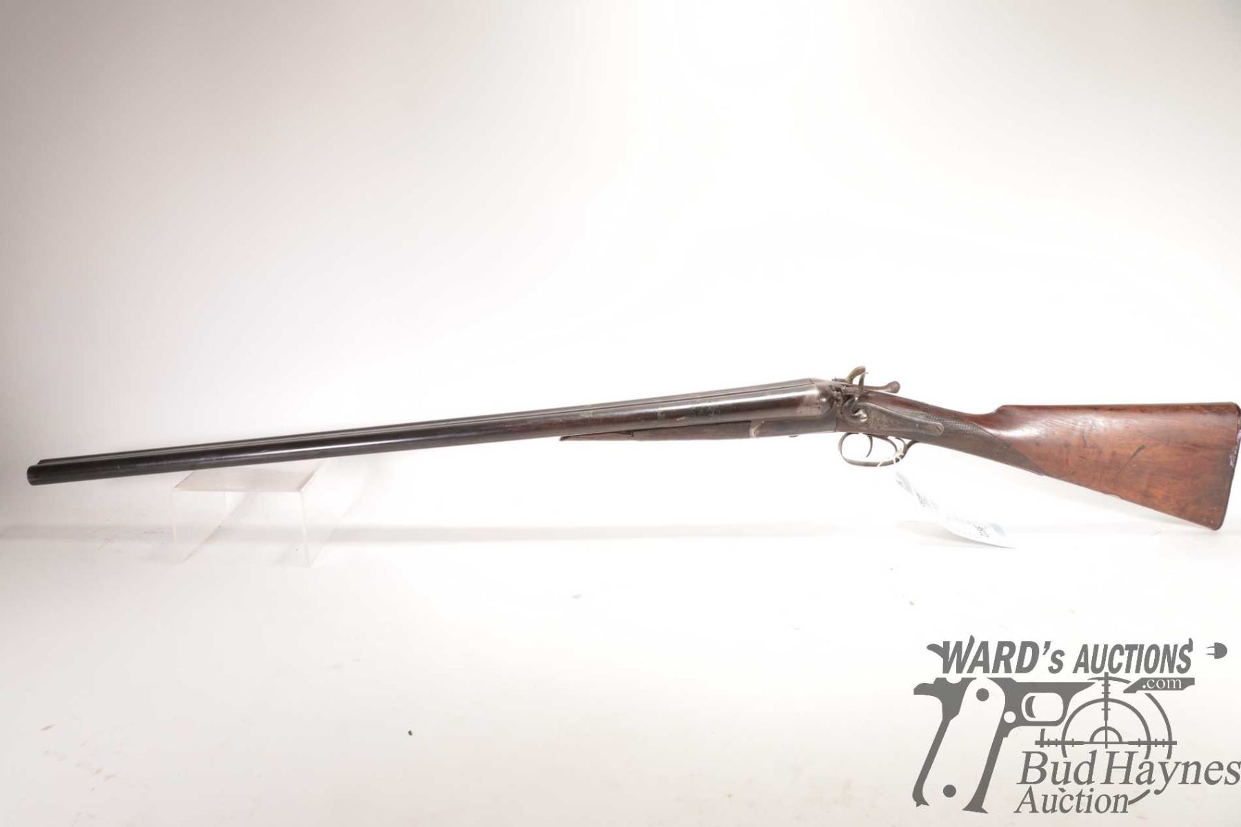 Non-Restricted shotgun Charles Hellis model SXS, 12 ga. 2 1/2" Two shot hinge break, w/ bbl length 30" [Choked markings include (NONE SEEN), bore diameter as measured 6" from muzzle (Left .7165, Right .723), muzzle diameter (Left .719, Right .725)] [Blued barrels and receiver. Single bead sight. Hardwood stock with plastic butt plate. Mechanically functions albeit in heavily used condition with repairs to right hammer spur, non-original screws, cracks in forend and stock, heavy rust etc.] serial # 6720, PAL required