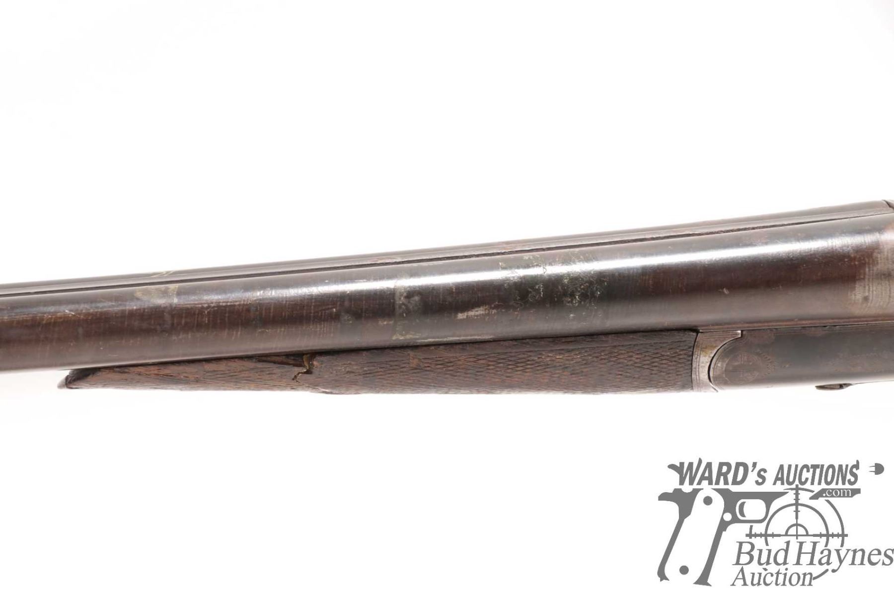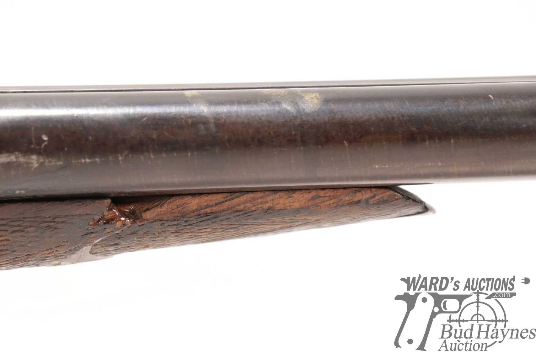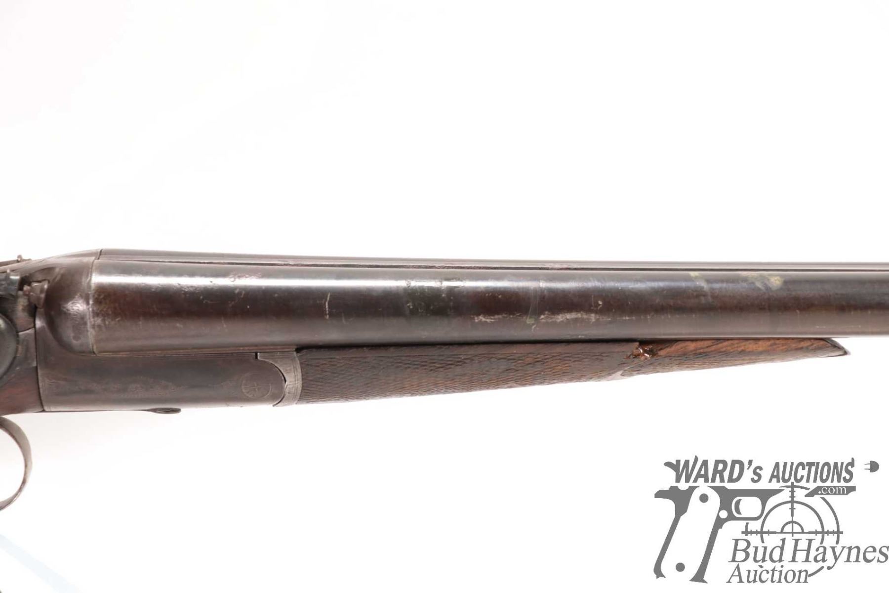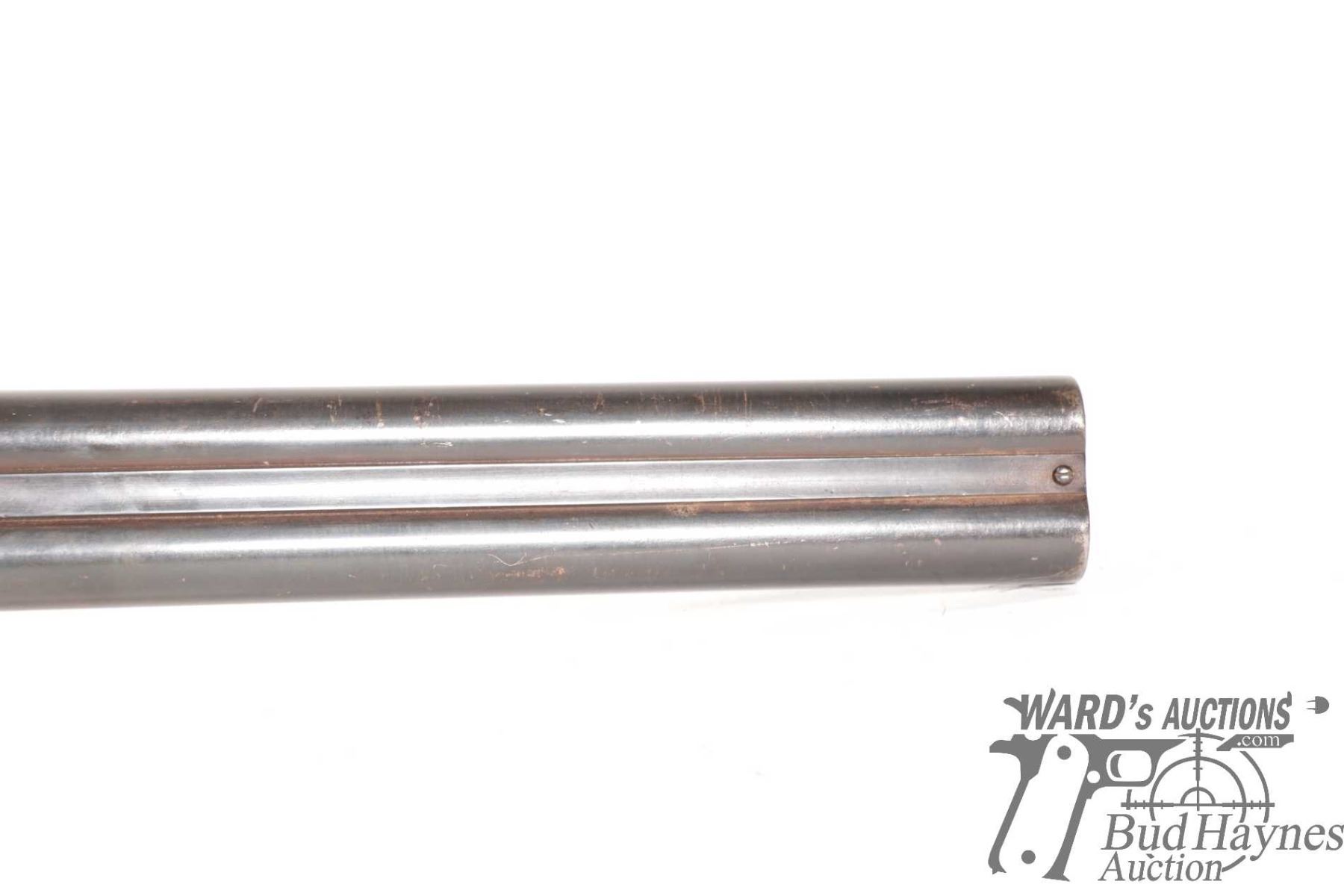 Non-Restricted shotgun Charles Hellis model SXS, 12 ga. 2 1/2" Two shot hinge break, w/ bbl length 30" [Choked markings include (NONE SEEN), bore diameter as measured 6" from muzzle (Left .7165, Right .723), muzzle diameter (Left .719, Right .725)] [Blued barrels and receiver. Single bead sight. Hardwood stock with plastic butt plate. Mechanically functions albeit in heavily used condition with repairs to right hammer spur, non-original screws, cracks in forend and stock, heavy rust etc.] serial # 6720, PAL required