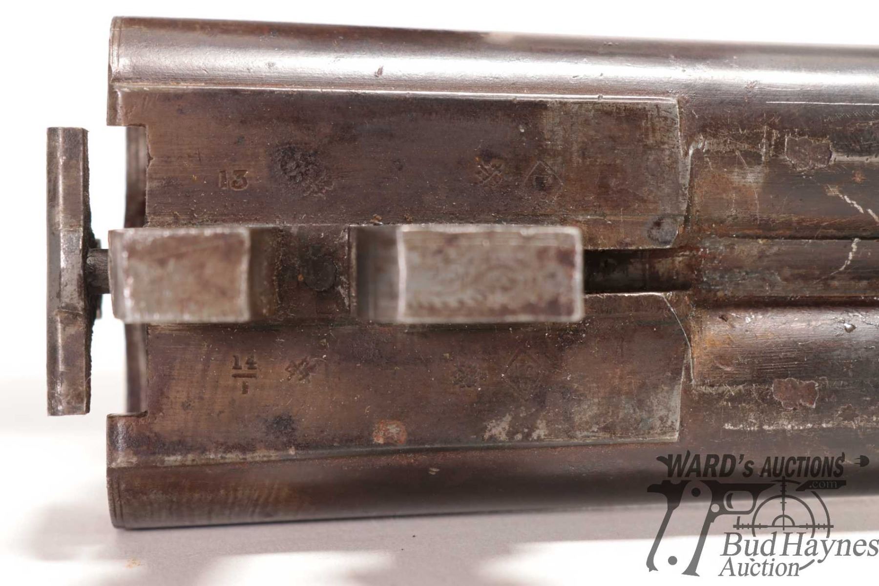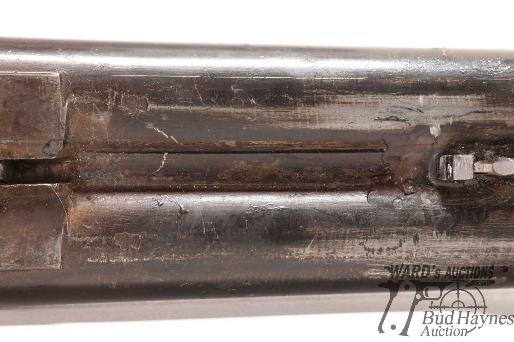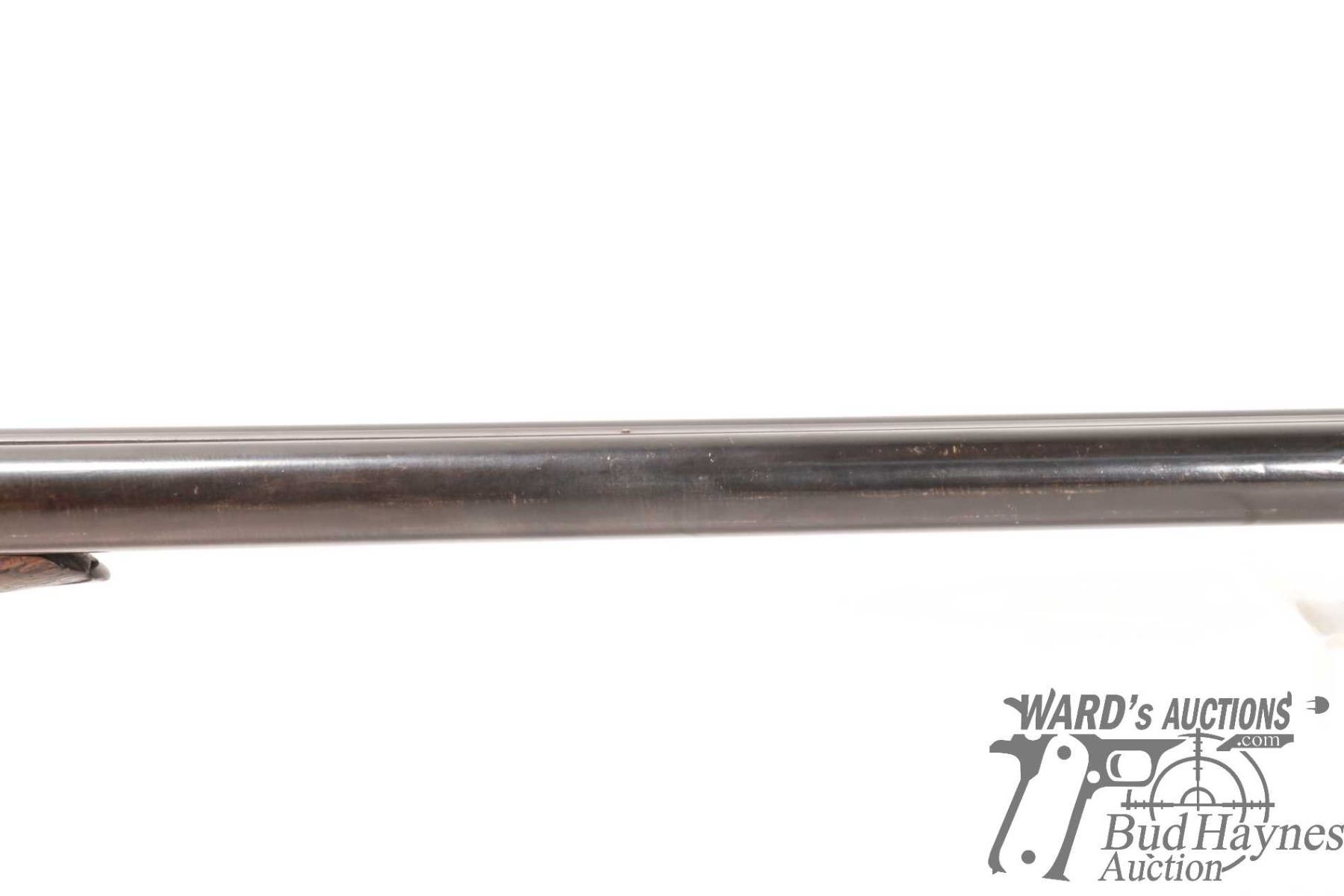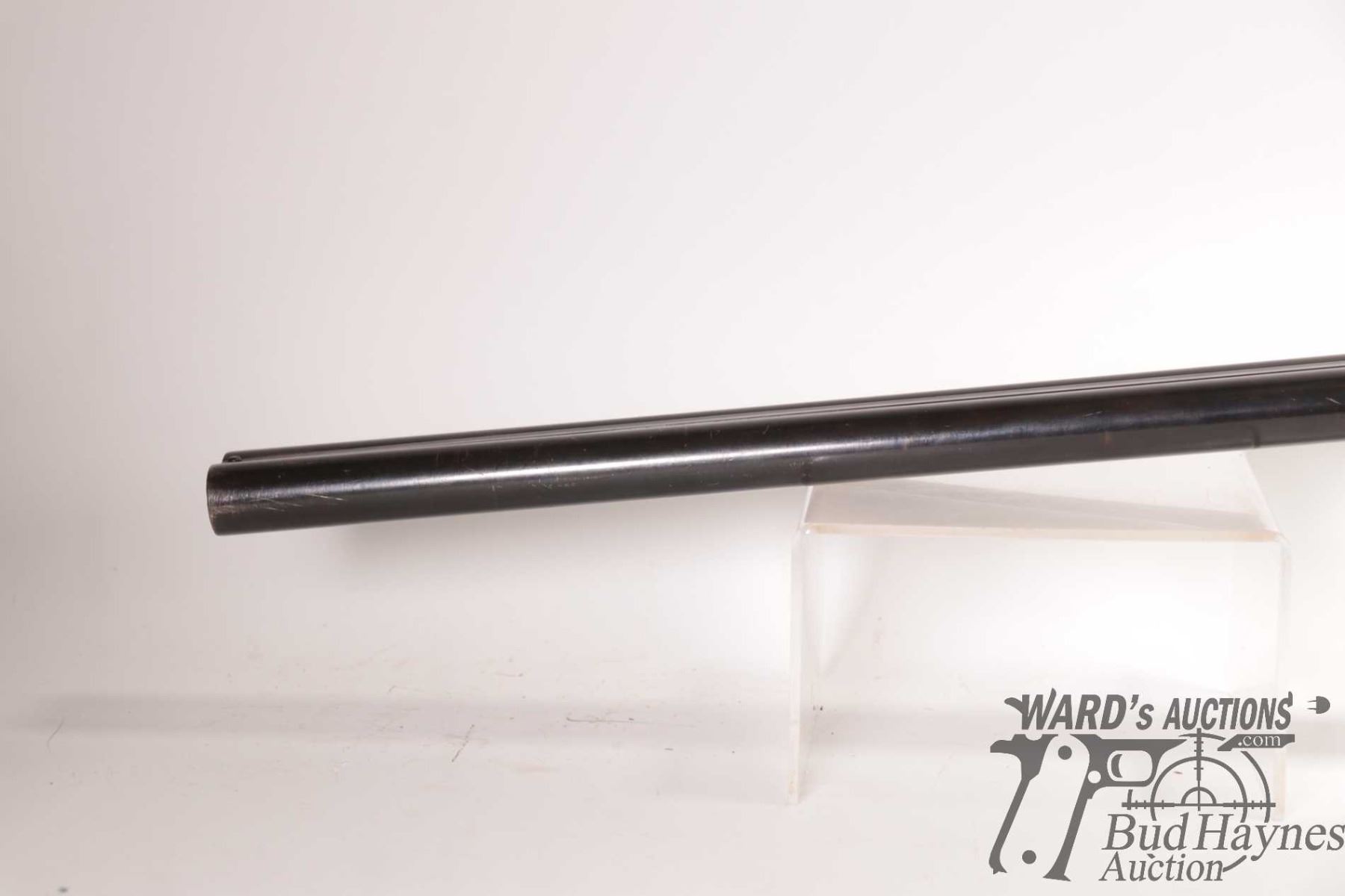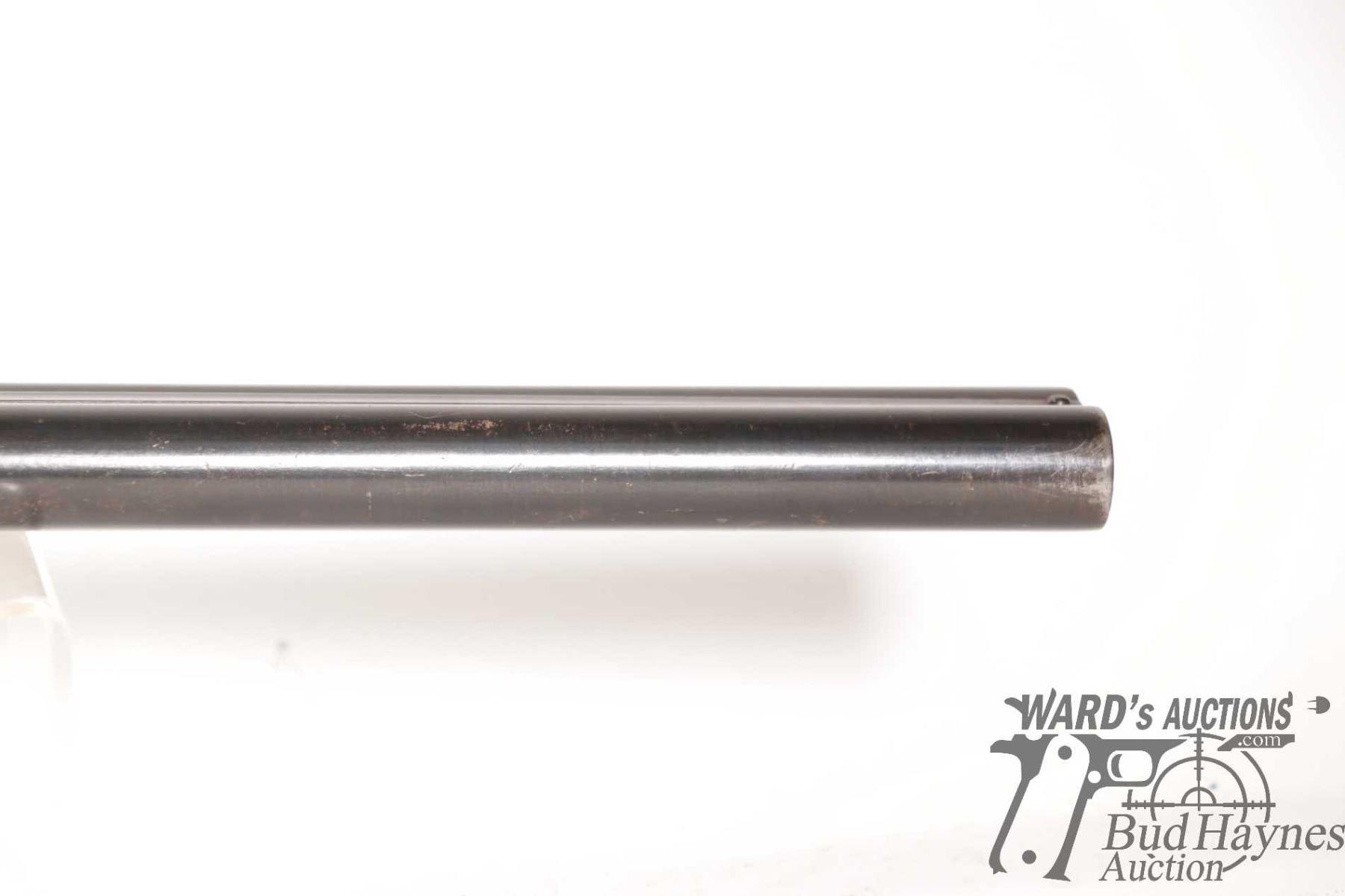 Non-Restricted shotgun Charles Hellis model SXS, 12 ga. 2 1/2" Two shot hinge break, w/ bbl length 30" [Choked markings include (NONE SEEN), bore diameter as measured 6" from muzzle (Left .7165, Right .723), muzzle diameter (Left .719, Right .725)] [Blued barrels and receiver. Single bead sight. Hardwood stock with plastic butt plate. Mechanically functions albeit in heavily used condition with repairs to right hammer spur, non-original screws, cracks in forend and stock, heavy rust etc.] serial # 6720, PAL required