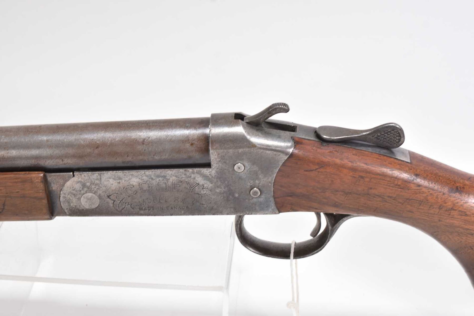 Non-Restricted shotgun Cooey model 84, 16 ga. single shot hinge break, w/ bbl length 30" [Blued full choke barrel and receiver, single bead sight. Smooth wood stock and forend. Top half inch of plastic butt plate missing, well worn on wood and metal] serial # 34517, PAL required