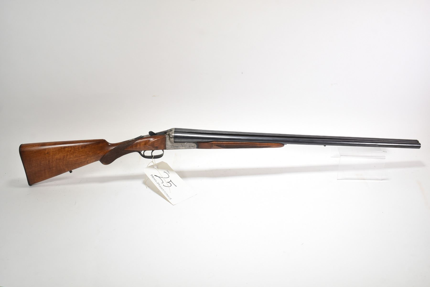 Non-Restricted shotgun Gaspar Arizaga model SXS, 20 gauge 3" magnum two shot hinge break, w/ bbl length 27 1/2" [Blued barrel with one side modified and one side full choke. Engraved stainless receiver. Hardwood stock with checkered semi pistol grip and forend. Simulated basket weave butt plate. Use, handling and storage marks on wood and metal.] serial # 136663, PAL required