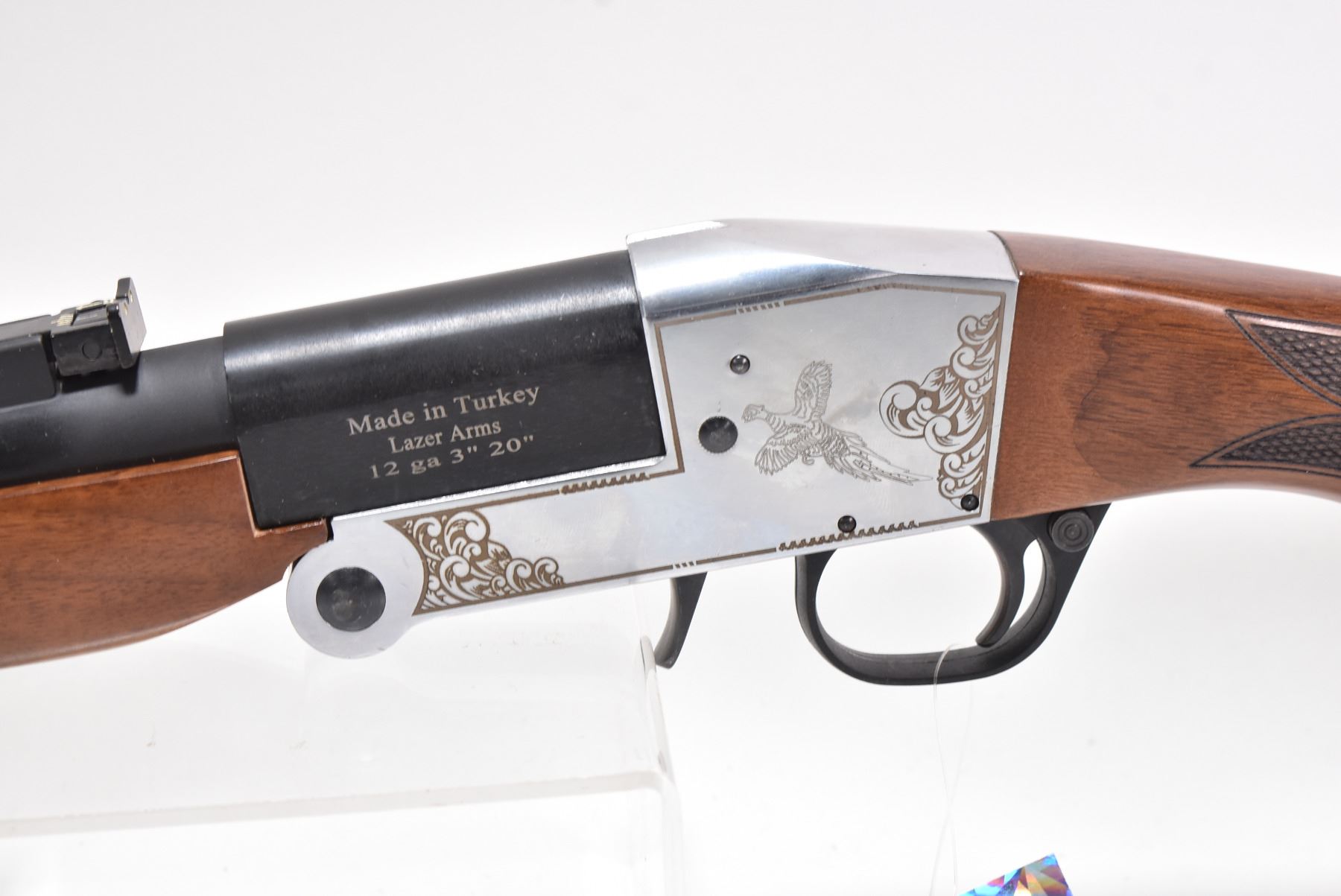 Non-Restricted shotgun Lazer Arms model XT14, 12 gauge 3" single shot hinge break, w/ bbl length 20" [Blued style barrel and chrome plated receiver. Fixed front and adjustable rear sights. Hard wooden stock with semi checkered pistol grip. Fitted with sling mounts. Includes five screw in chokes and choke too. Appears to be new and unfired with retail tag and original box.] serial # 18CASB0576, PAL required