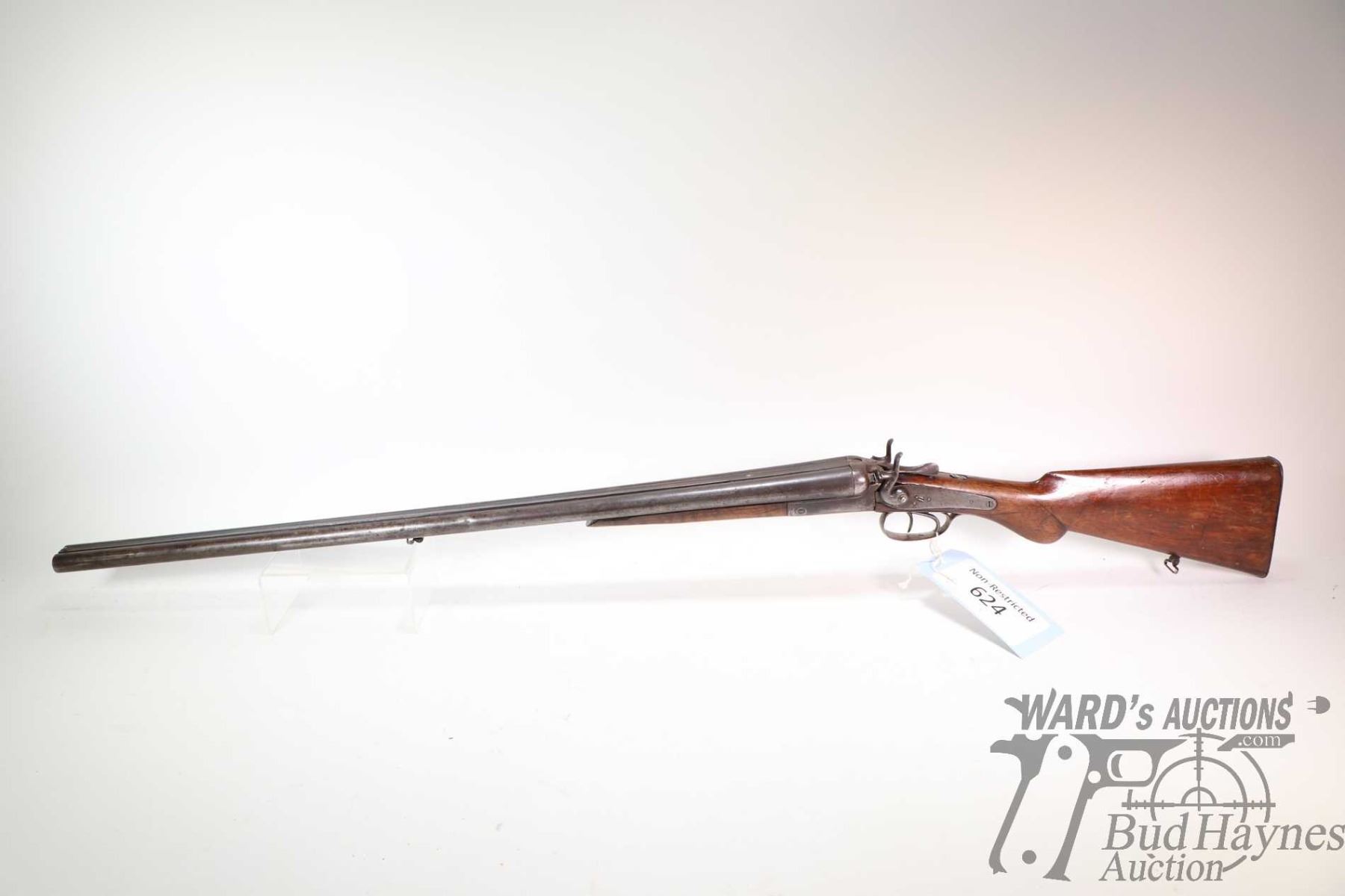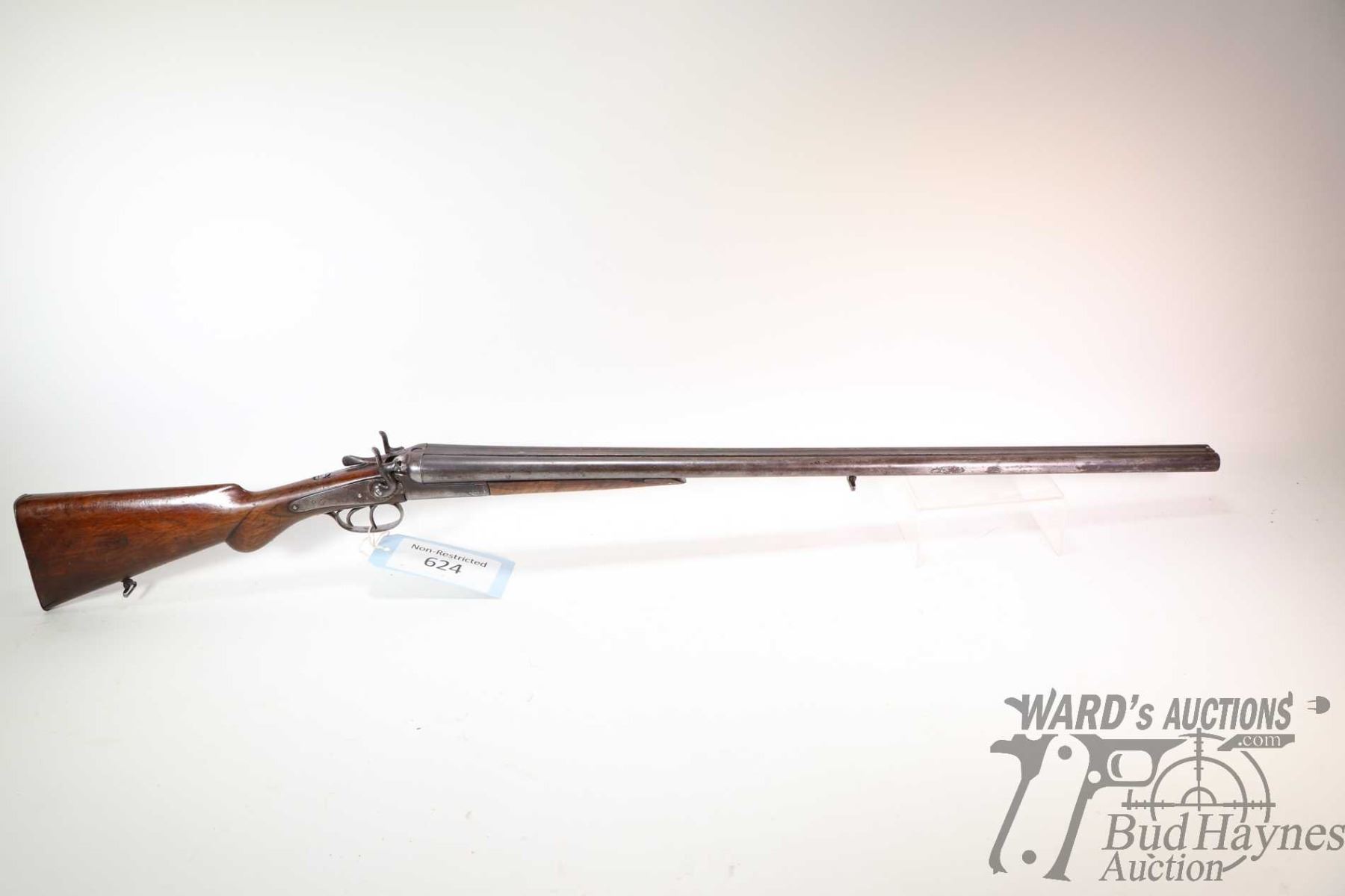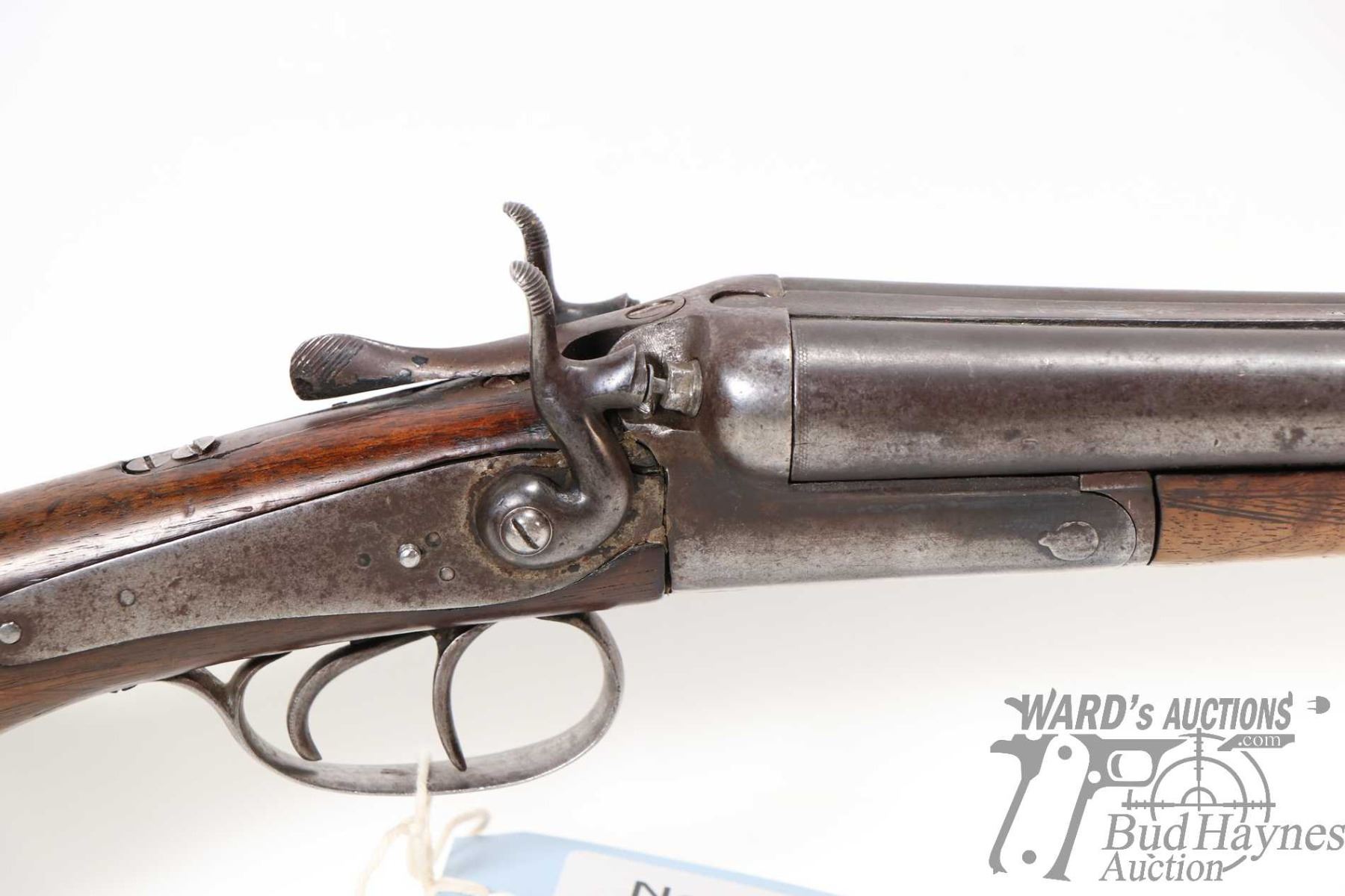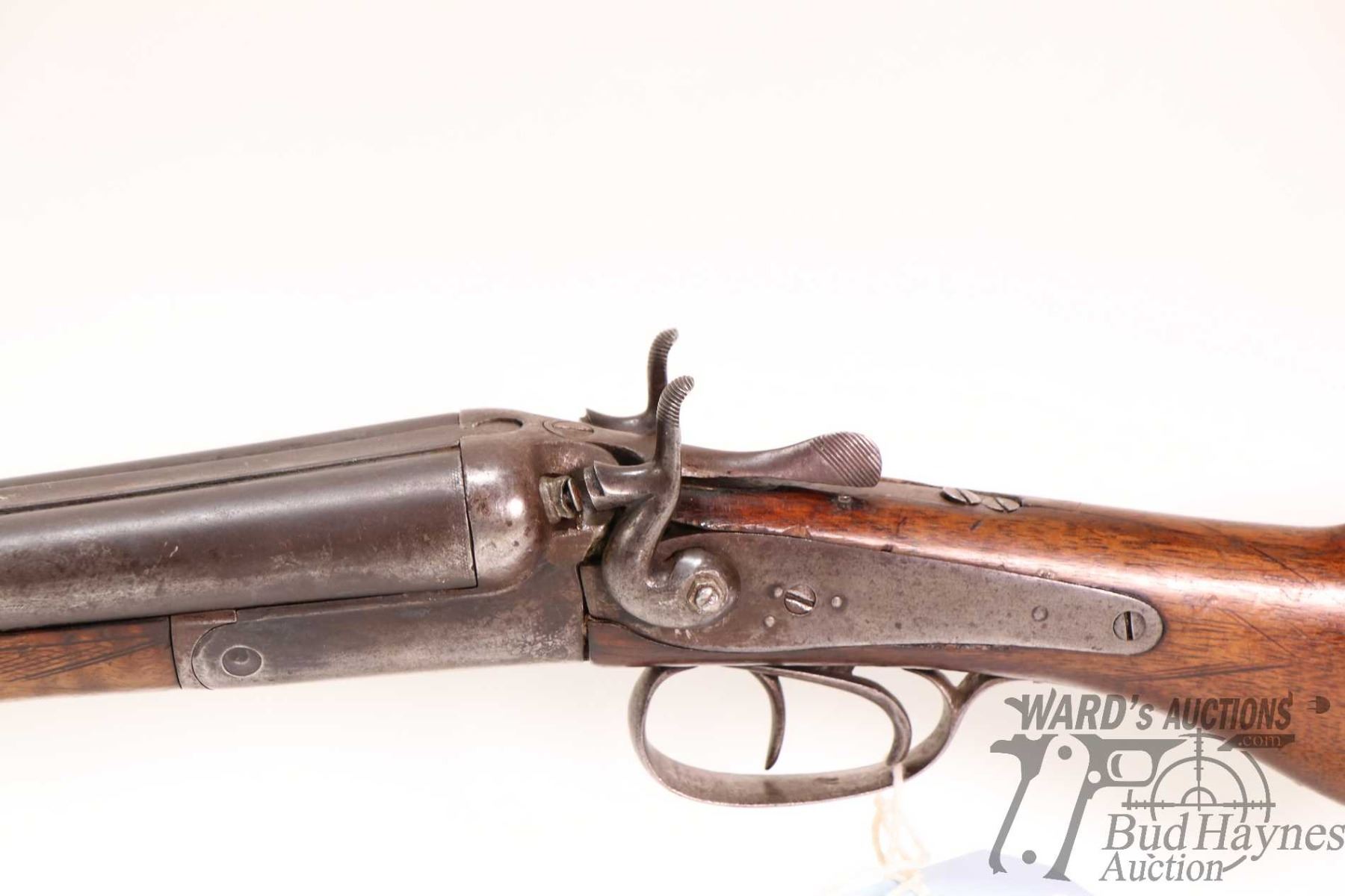 Non-Restricted shotgun Liege United Arms Co. model SXS, .16 GA two shots hinge break, w/ bbl length 30" [Damascus barrel, single bead front sight, external hammers, hardwood stock and forend. Extremely well used condition with cracks in wood, replacement screws, carpentry nails used for firing pins. Not recommended to shoot.] serial # 2598, PAL required