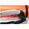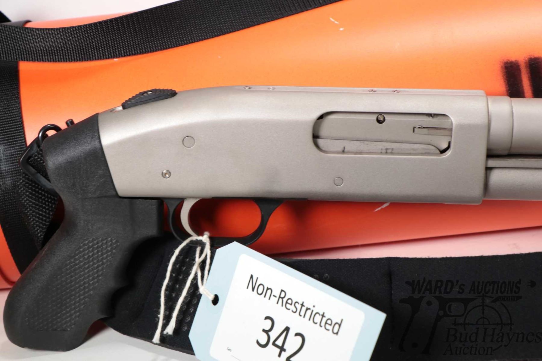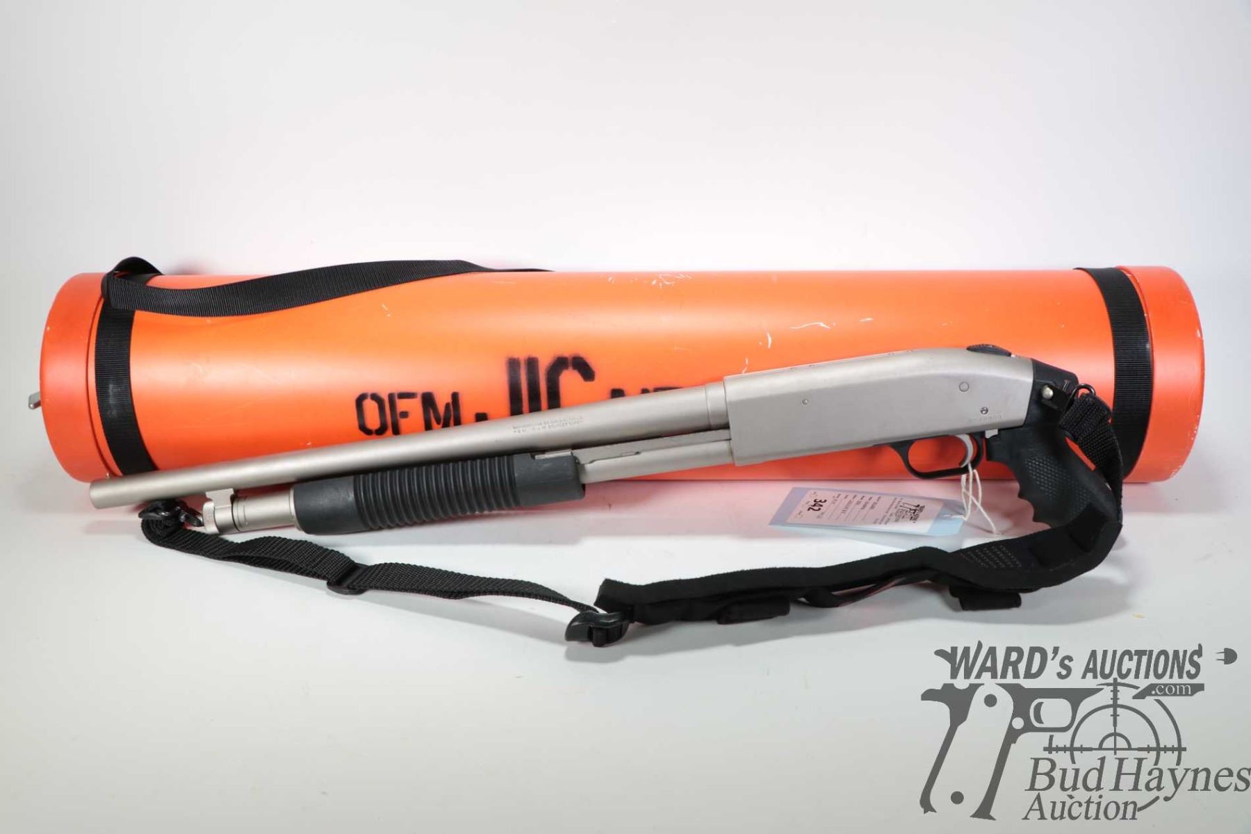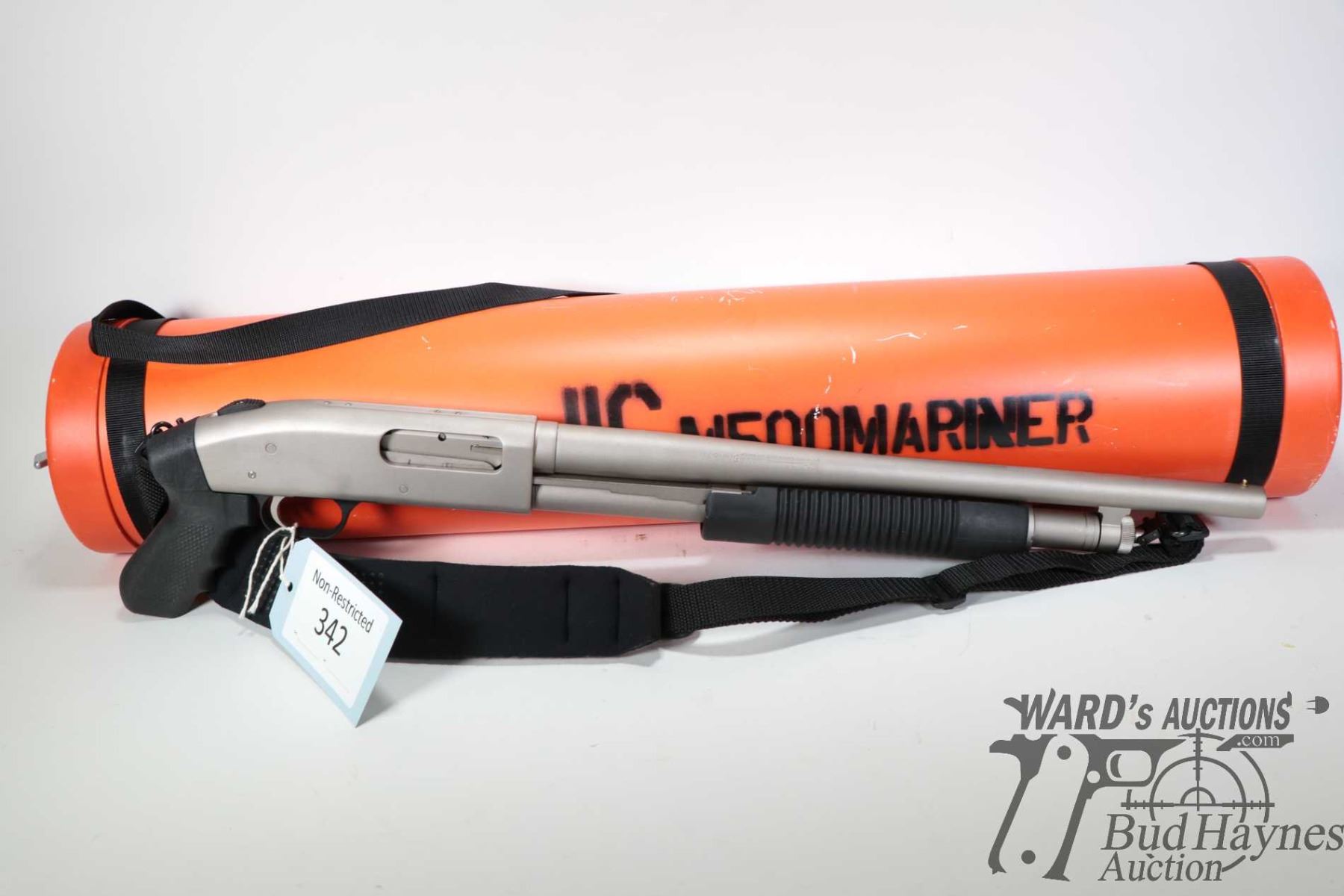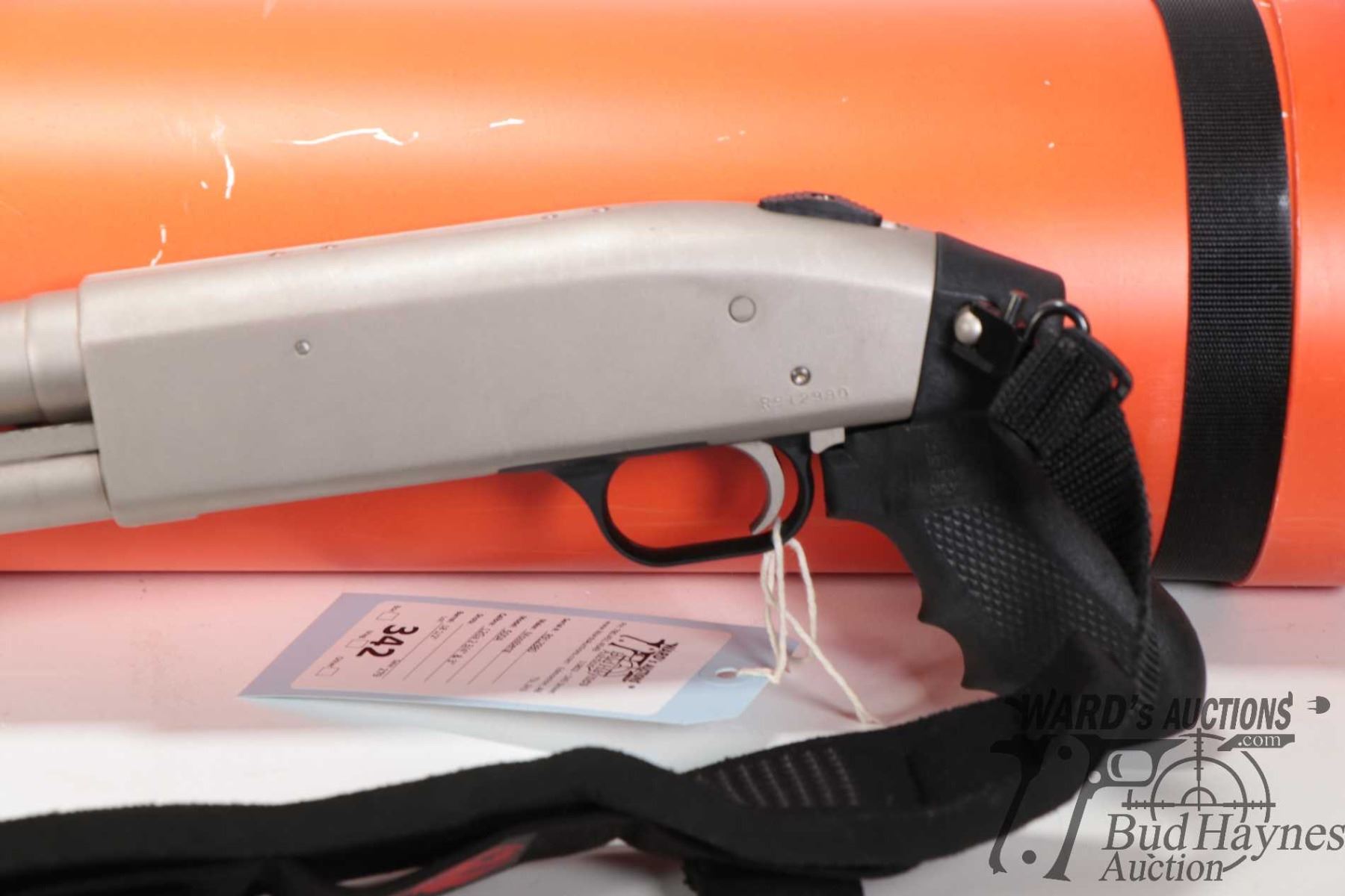 Non-Restricted shotgun Mossberg model 500A, 12Ga 2 3/4" & 3" pump action, w/ bbl length 18 1/2" [Choked markings include (CYLINDER BORE), bore diameter as measured 6" from muzzle (.730), muzzle diameter (.7295)] [Satin stainless steel. Black polymer pistol grip and corn cob forend. Designed as marine survival shot gun including water proof bright orange floating storage cylinder. Fitted with Ruger brand padded sling. Mechanically appears near excellent and likely had very little use with only minor use, handling and storage marks.] serial # R912980, PAL required. Descriptions subject to change.