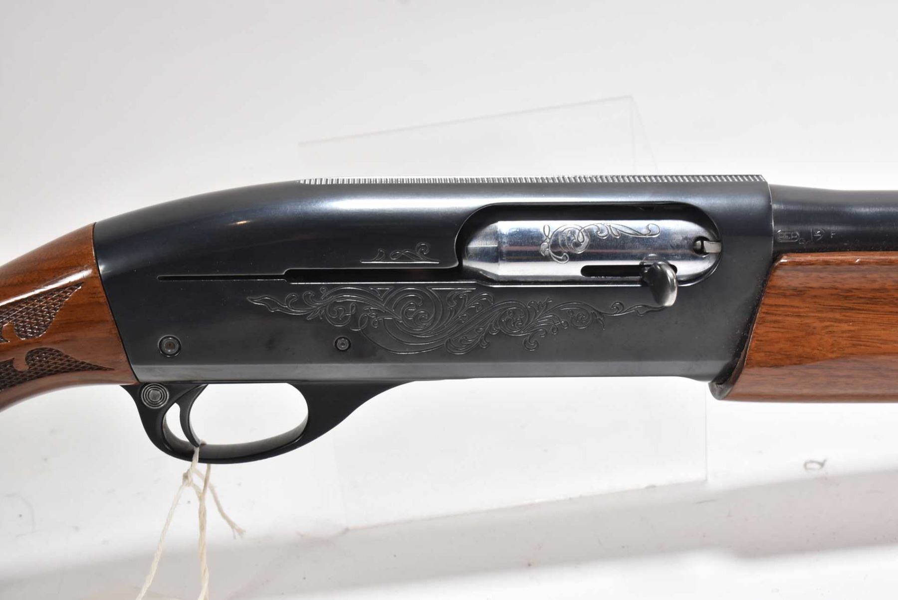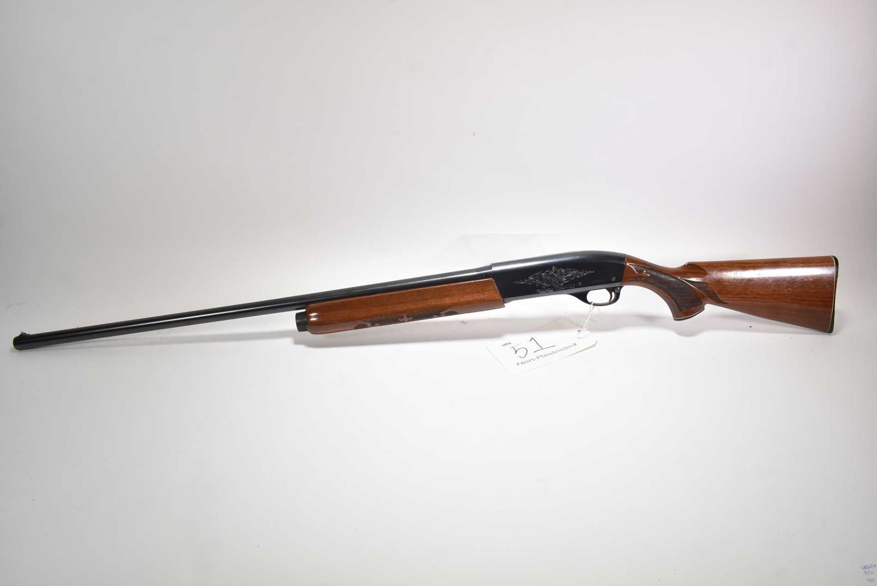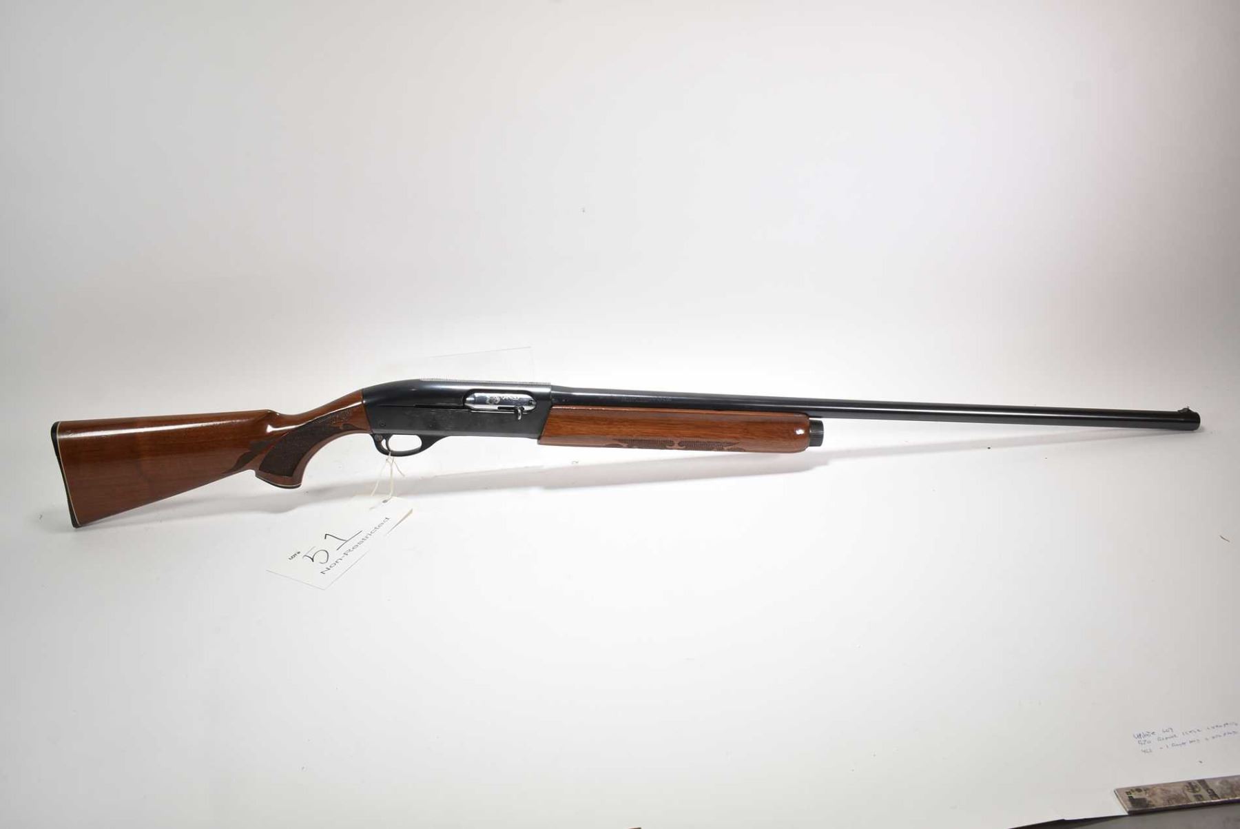 Non-Restricted shotgun Remington model 1100, 12 gauge 2 3/4" semi automatic, w/ bbl length 30" [Blued barrel and engraved receiver. Single bead front sight. Glossy hardwood stock with hard plastic butt plate and checkered glossy wooden foregrip. Overall used condition, action feel smooth. Nicks, marks and scratches to wood and metal] serial # 26271V, PAL required