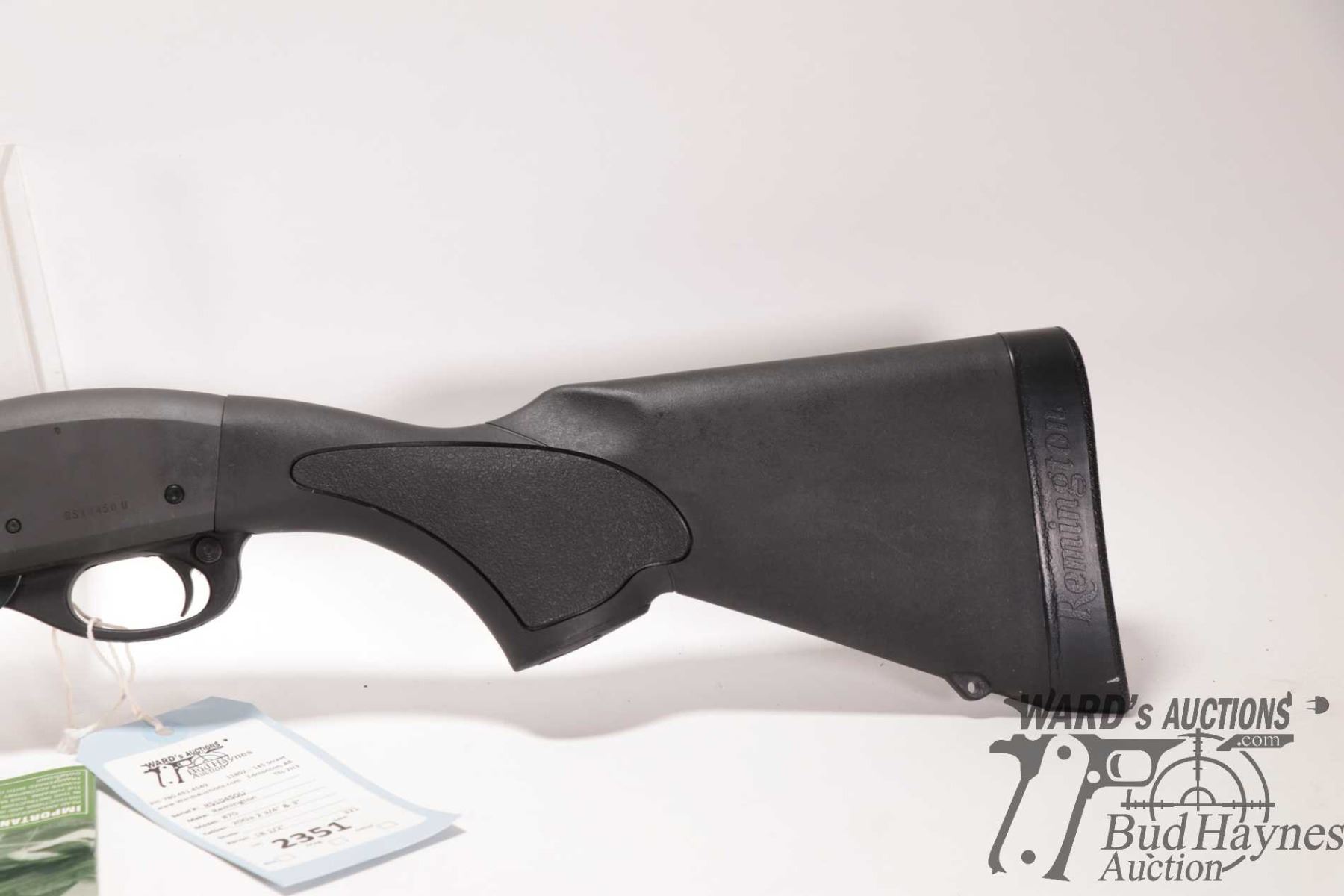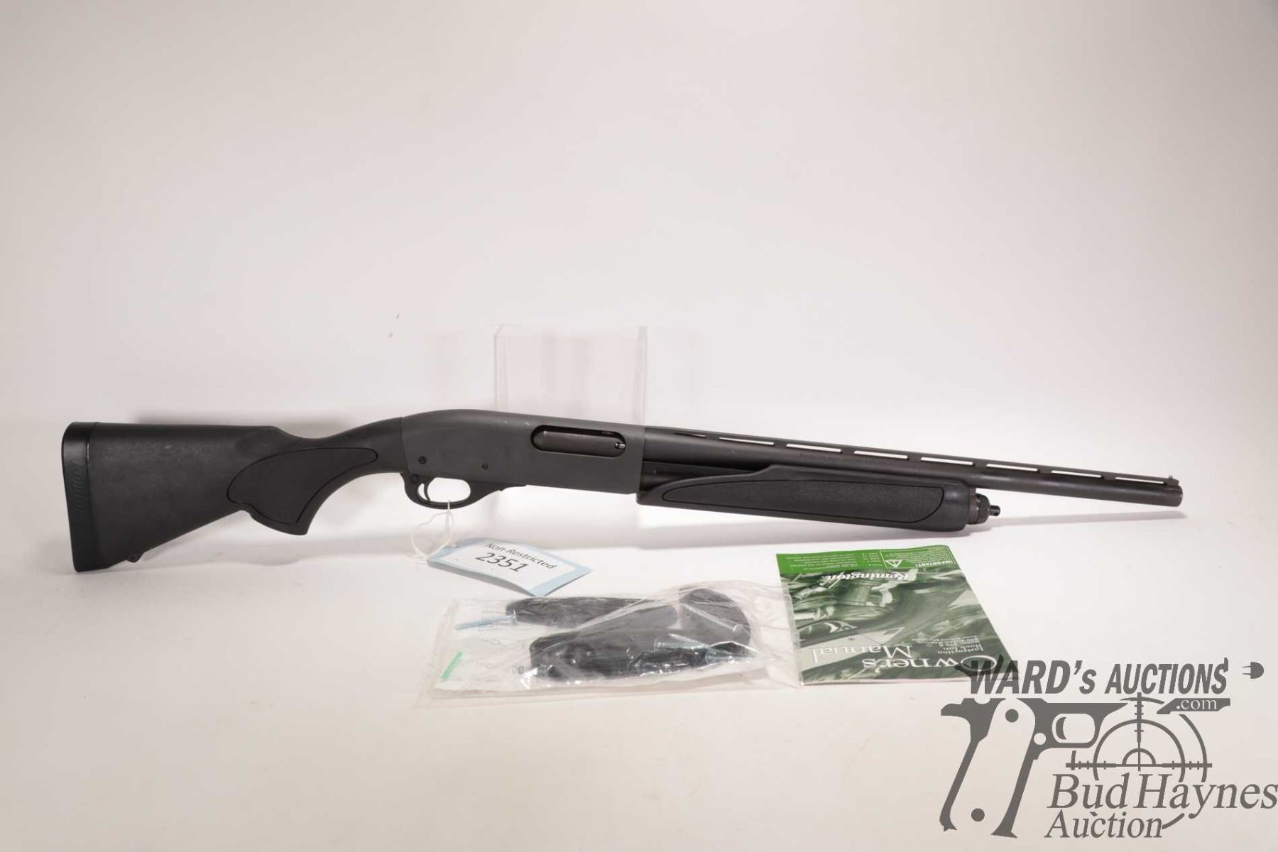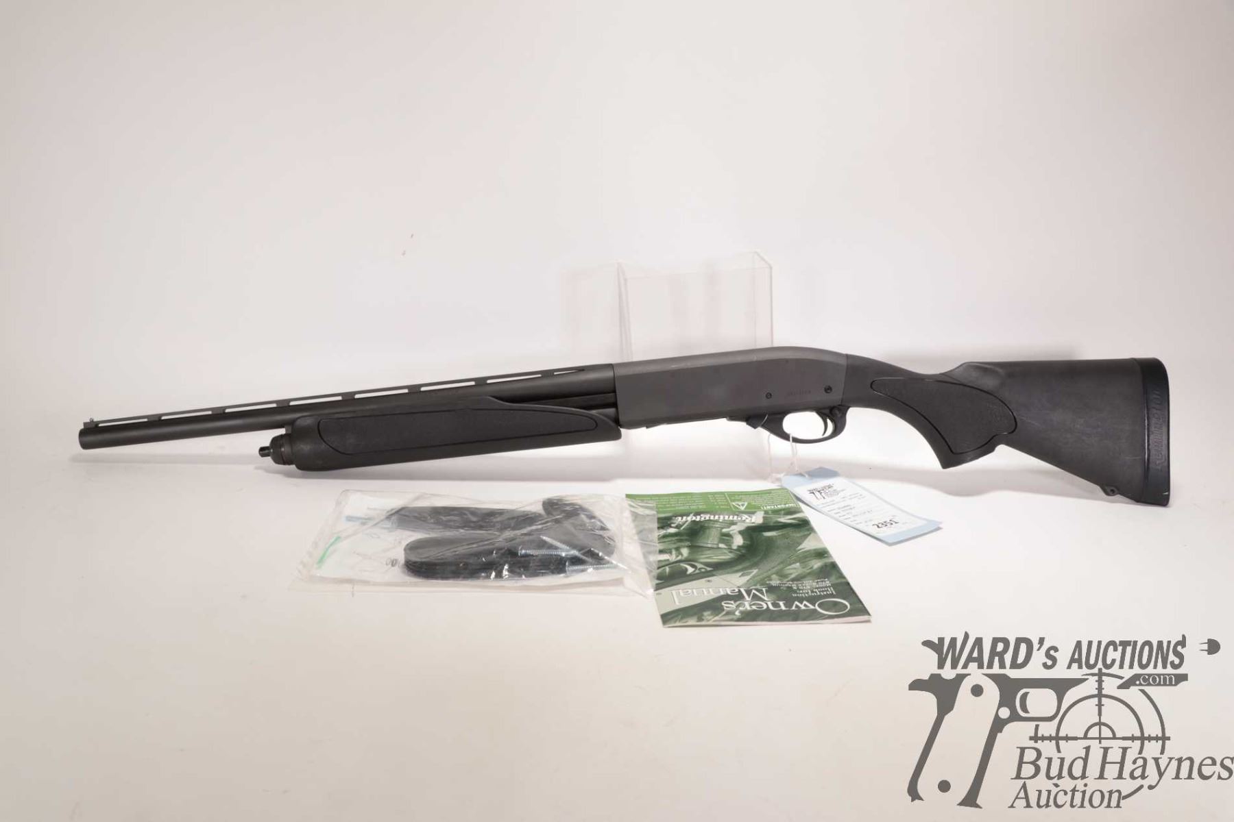 Non-Restricted shotgun Remington model 870, 20 ga. 2 3/4" & 3" pump action, w/ bbl length 18 1/2" bore diameter as measured 6" from muzzle (.616), muzzle diameter (Threaded)] [Satin black finish on ribbed barrel and receiver. Single bead sight. Tubular magazine. Includes original manual, stock spacers and one unidentified screw in choke. Mechanically appears near excellent and likely had little use with minor use, handling and storage marks and one bit of isolated surface rust at ejection port.] serial # RS10450U, PAL required