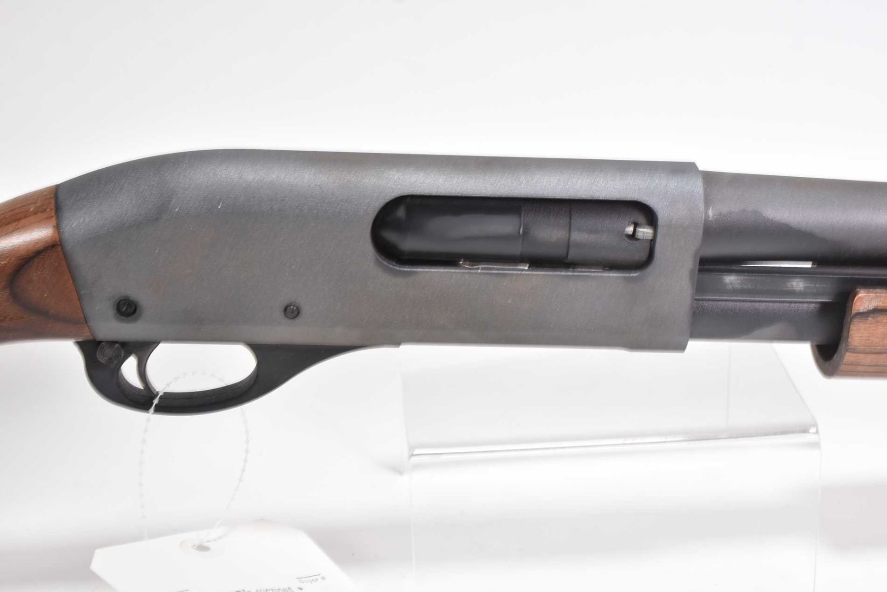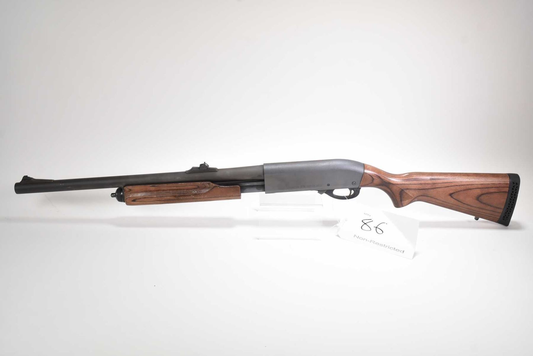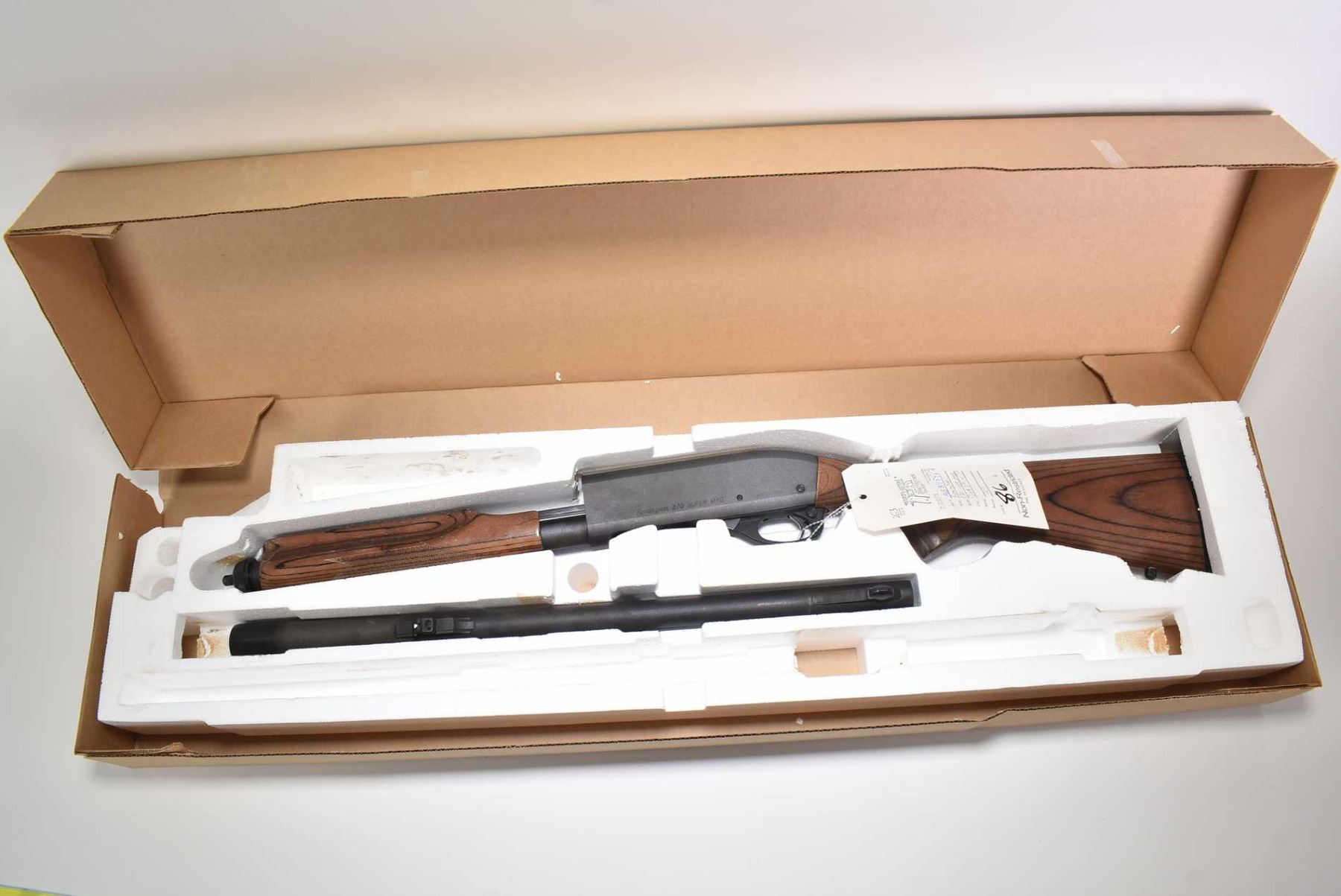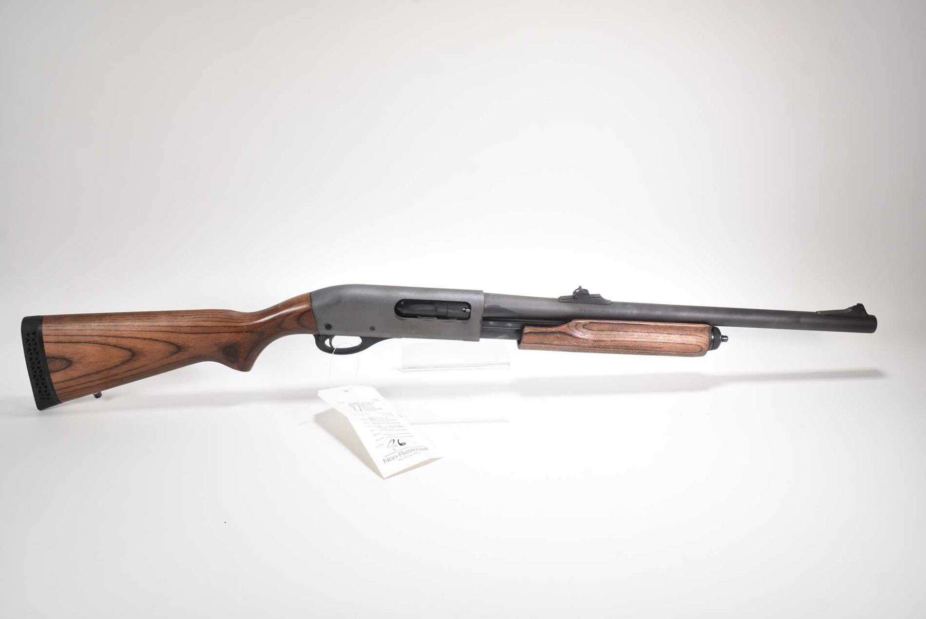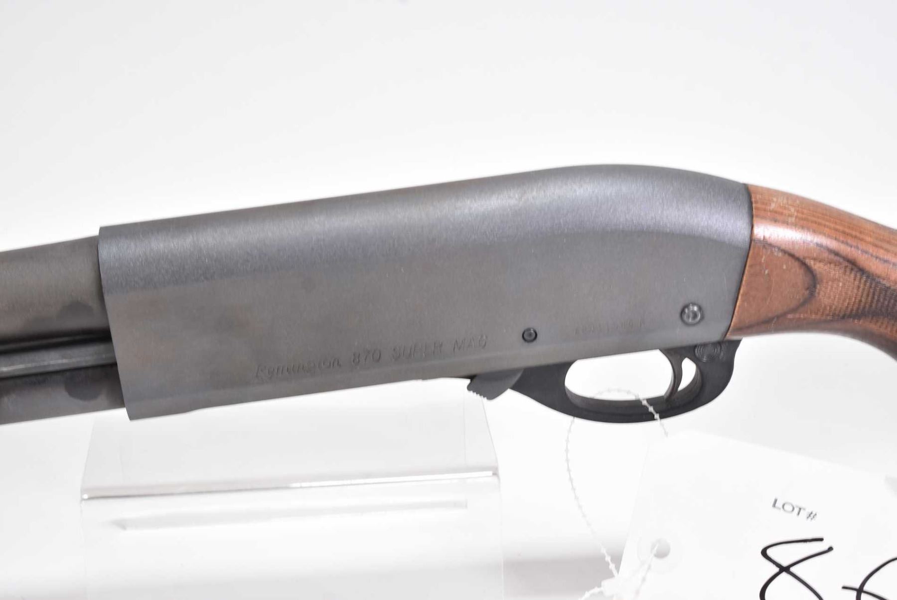 Non-Restricted shotgun Remington model 870 Super Mag, 12 ga. 2 3/4" & 3" pump action, w/ bbl length 20" [Blued style barrel and receiver, fixed front and adjustable mid barrel rear sight. Wooden stock and forend. Remington recoil pad and checkered semi pistol grip. Includes original box. Damaged finish and wood and metal surfaces, likely due to damp storage.] serial # AB811546A, PAL required