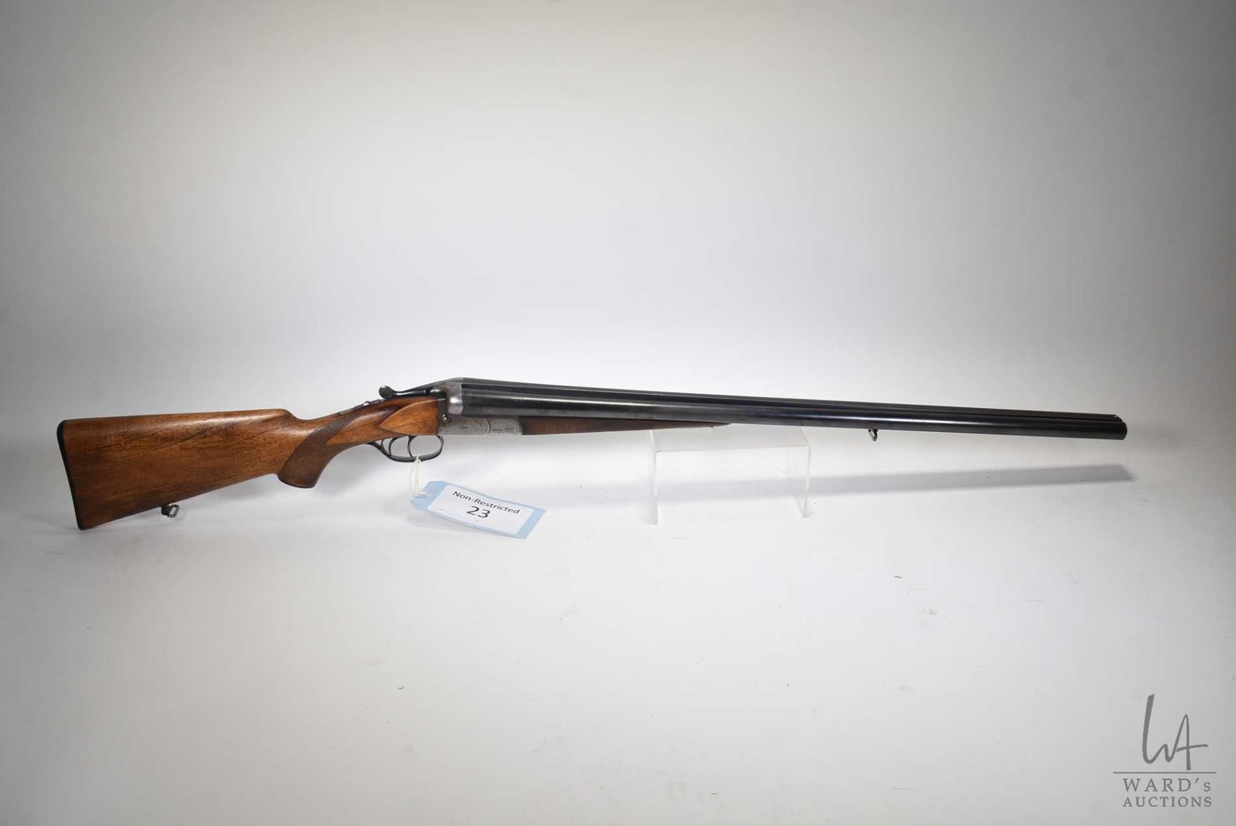 Non-Restricted shotgun Sauer & Sohn-Suhl model Special -Gewehr, 12 gauge 2 3/4" two shot hinge break, w/ bbl length 28 1/2" [Blued barrels and receiver. Single bead front sight. Walnut stock with plastic butt plate. Checkered semi pistol grip and forend. Most bluing on receiver worn off. Markings include Manufacturer on left and right side of receiver. Two unknown fixed chokes. Bottom of barrels stamped with assorted proof marks and Nitro. Barrels stamped with Manufacturer name, logo and Lauf-Stahl S.G.1. Action and trigger appear to function reasonably smoothly, lock up is tight. Use, handling and storage marks on wood and metal.] serial # 429860, PAL required
