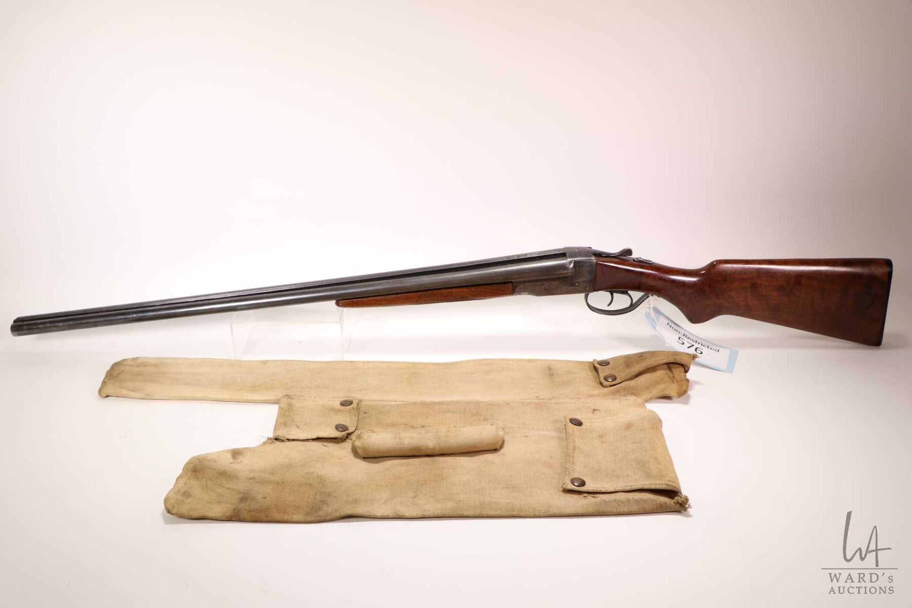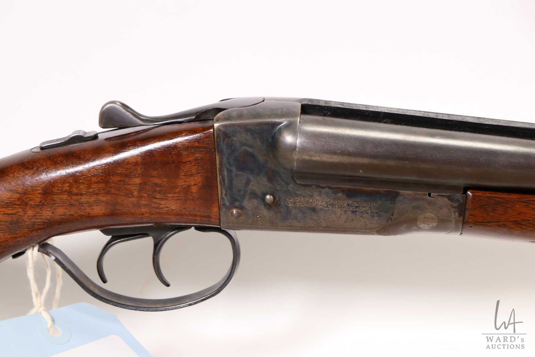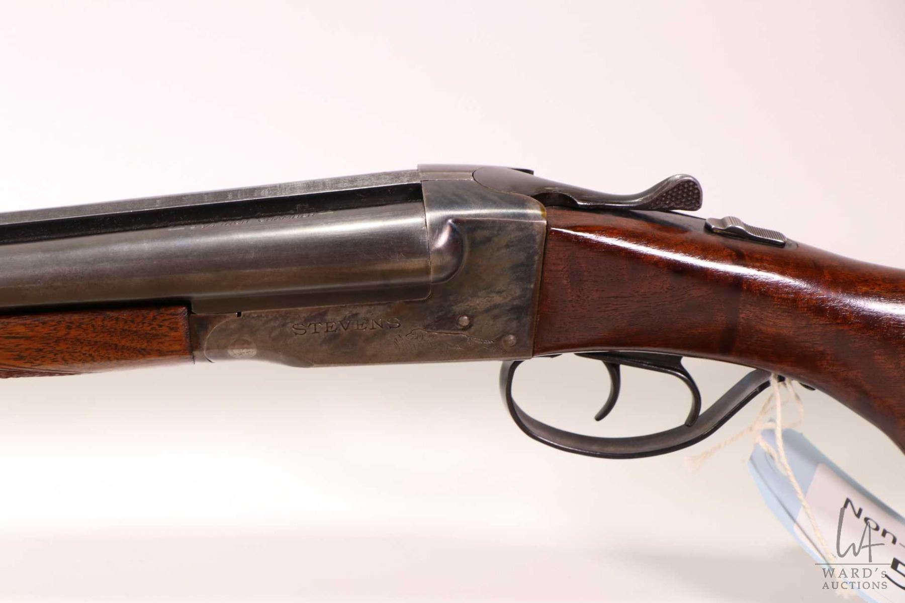 Non-Restricted shotgun Stevens model 5100, 20 gauge 2 3/4" two shot hinge break, w/ bbl length 28" [Blued barrels and case hardened receiver. Two bead sight. Smooth wooden stock with branded butt plate. Checkered forend. Mechanically seems to function smoothly and lock up is tight with use, handling and storage marks on wood and metal. Includes canvas storage bag.] serial # NIL, PAL required