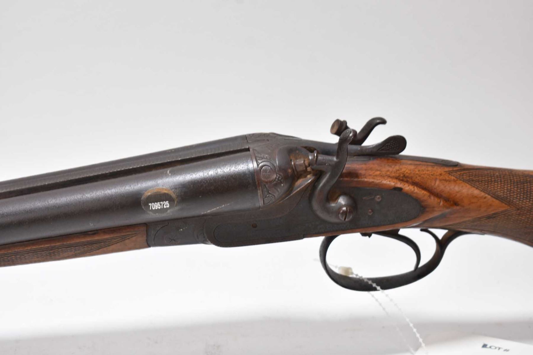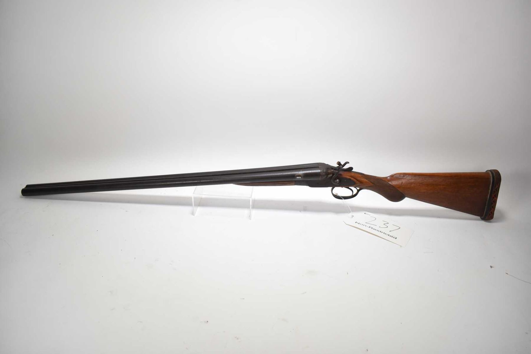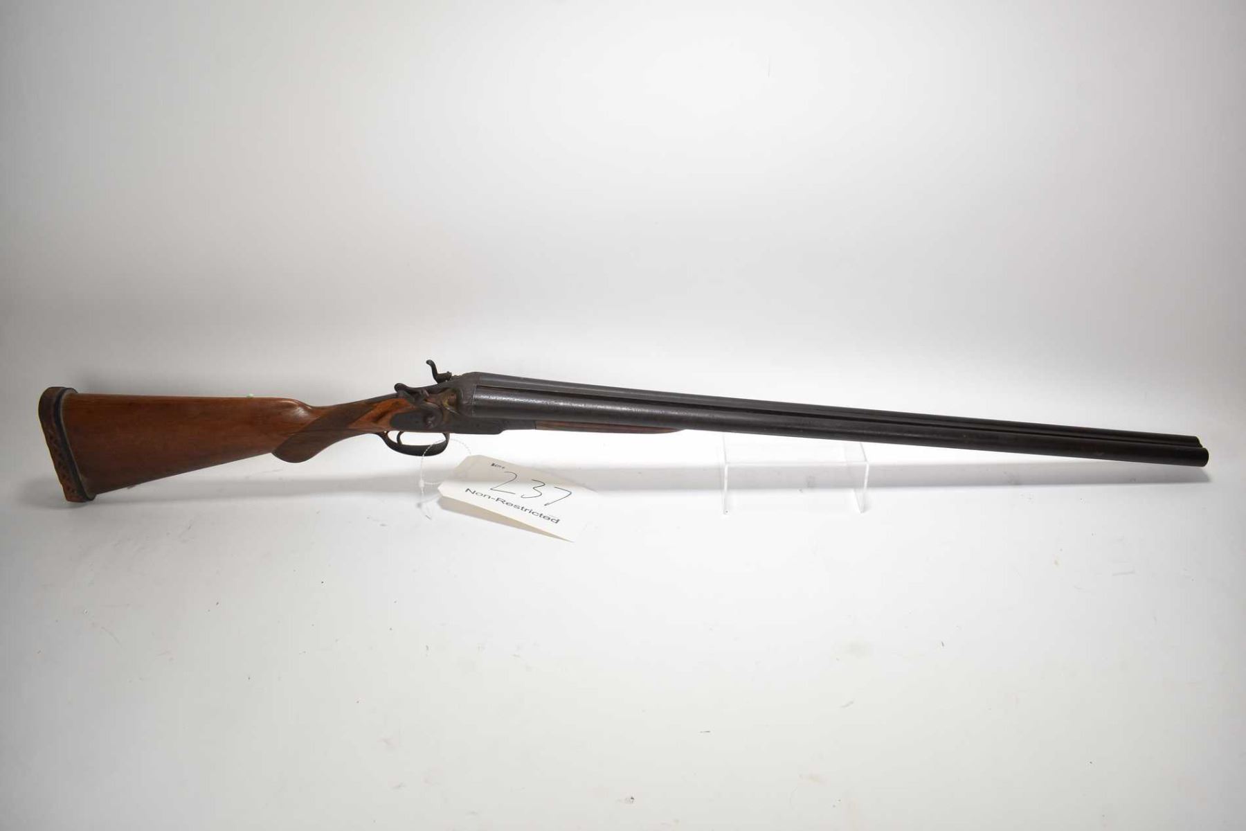 Non-Restricted shotgun Unknown Belgian model Side X Side, 12ga. two shot hinge break, w/ bbl length 29 1/2" [Blued barrel and receiver turned brown with pitting and surface rust. Engraved receiver and locks, external hammers, one trigger is broken, crudely affixed recoil pad, checkered semi pistol grip and forend. Well used condition, relegated to wall hanger.] serial # 23295, PAL required