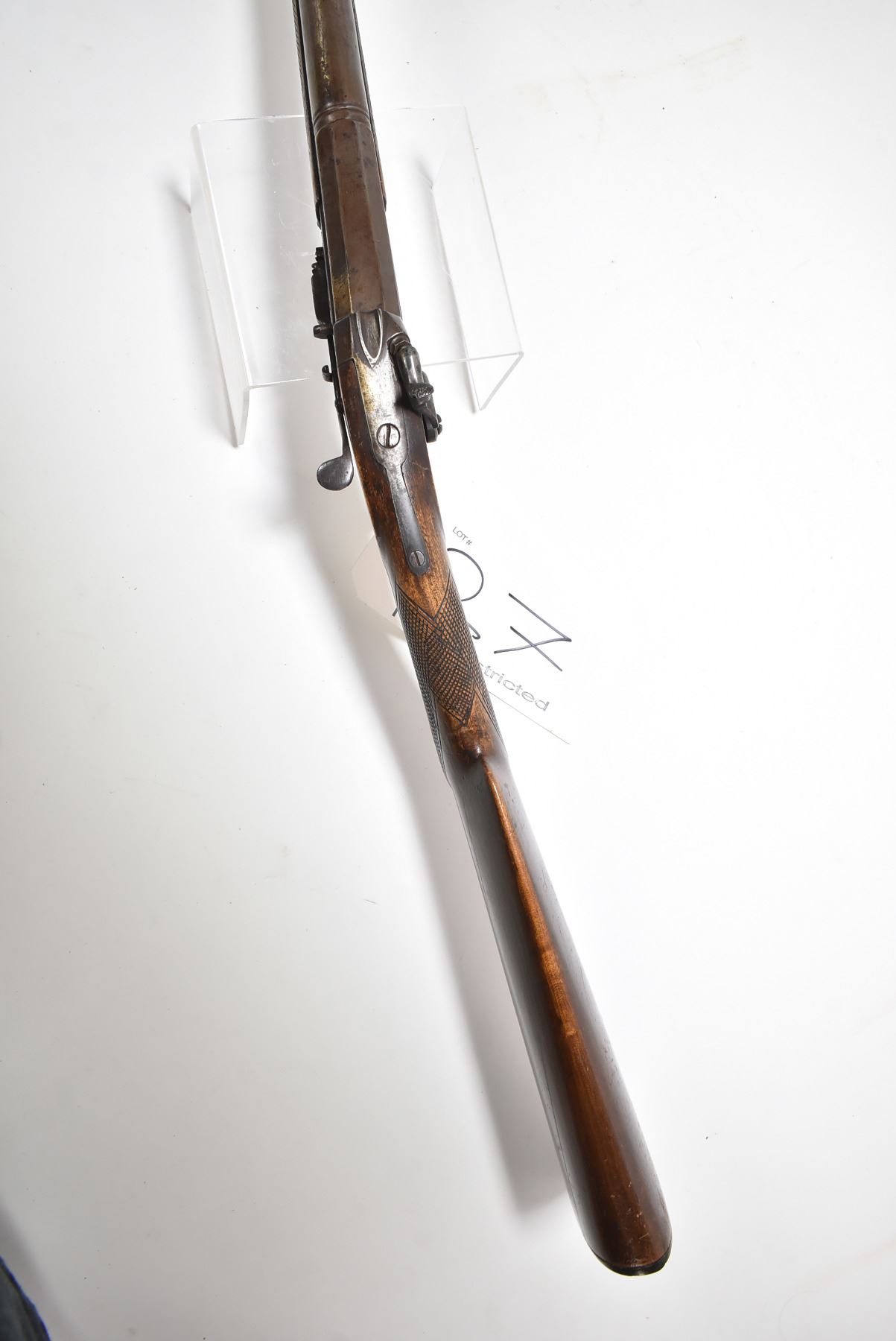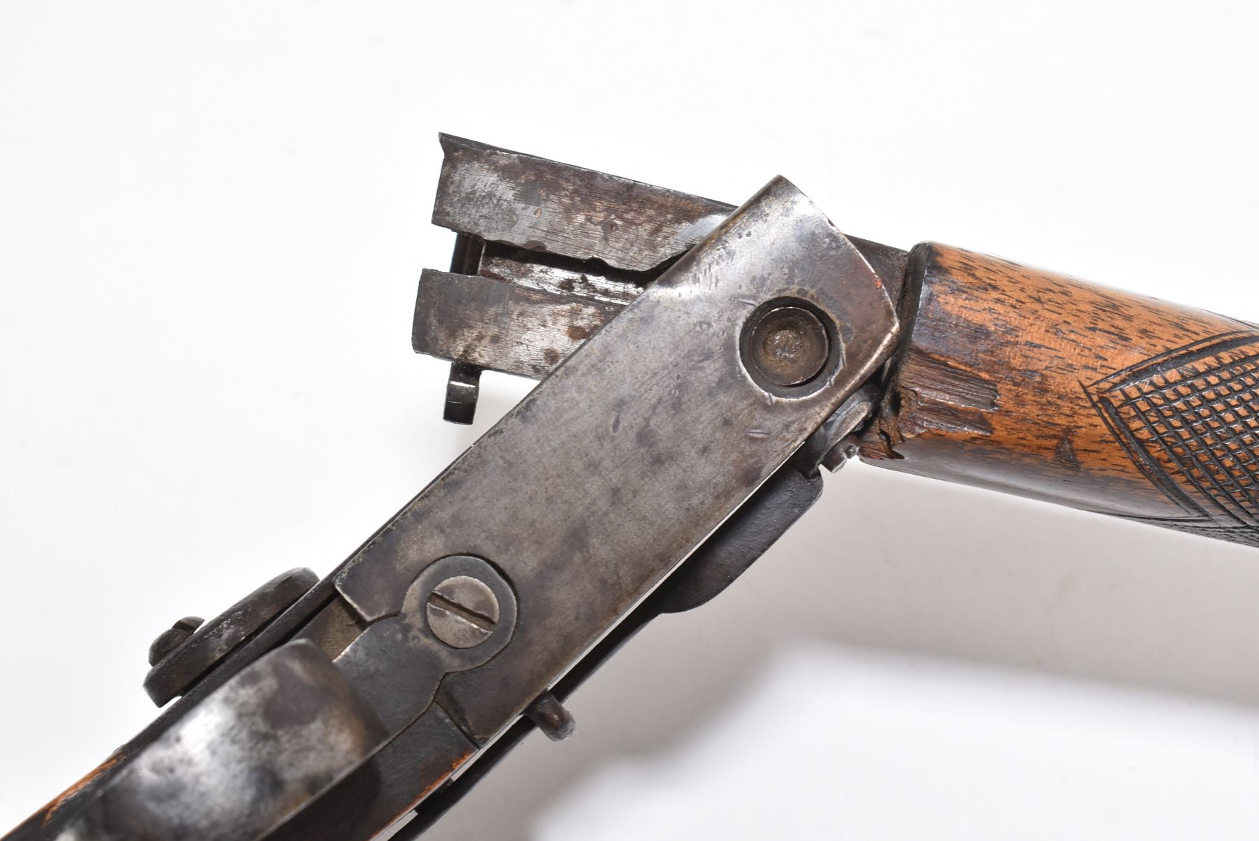 Non-Restricted shotgun Unknown model Unknown, 28 gauge (?) single shot swing hinge, w/ bbl length 25 1/2" [Blued finish turning brown gray. Front bead and grooved rear sight. Wooden stock with checkered pistol grip and forend. This unusual old firearm has a swing out style action and a off set stock likely for right hand, left eye dominant shooting. Appears to be 28 gauge. Overall in well used condition, not likely suitable for use but a great conversation piece.] serial # NIL, PAL required