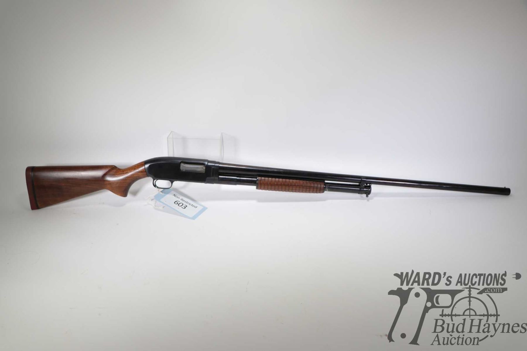Non-Restricted shotgun Winchester model 12, 12Ga Unconfirmed chamber pump action, w/ bbl length 32" [Choked markings include (FULL), bore diameter as measured 6" from muzzle (.735), muzzle diameter (.697)] [Blued barrel and receiver. Single bead sight. Smooth wooden stock. Branded recoil pad. Corn cob forend. Mechanically appears to function well. Metal and wood appear refinished. Cracks on both side of forend had been repaired prior to refinishing. Other use, handling and storage marks on wood and metal.] serial # 605311, PAL required. Descriptions subject to change.