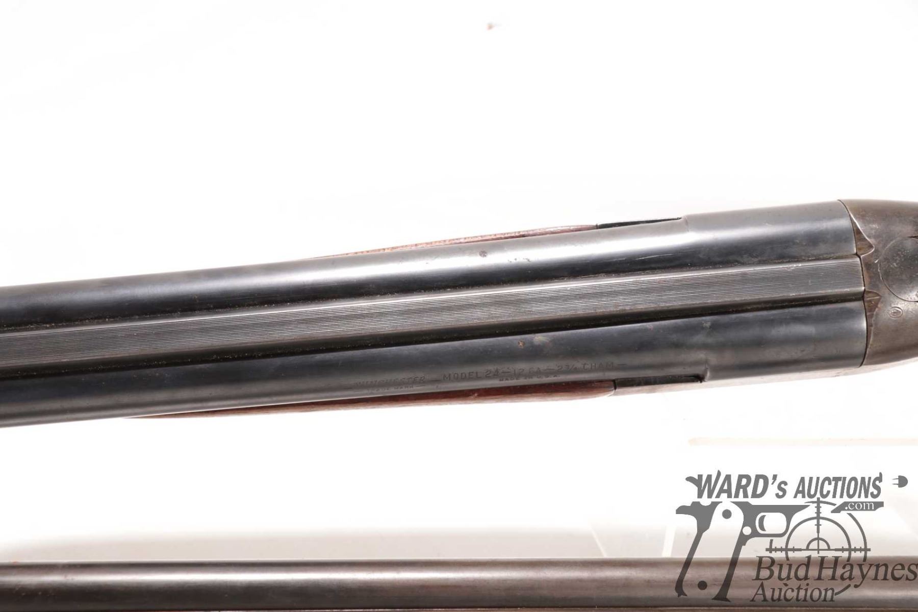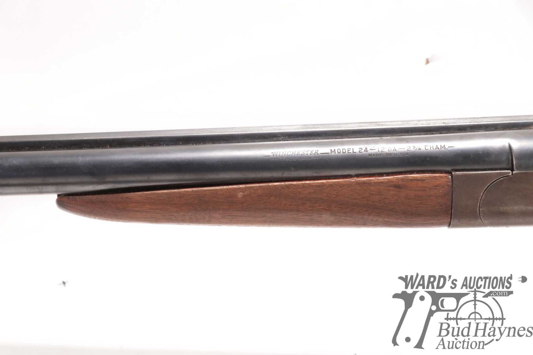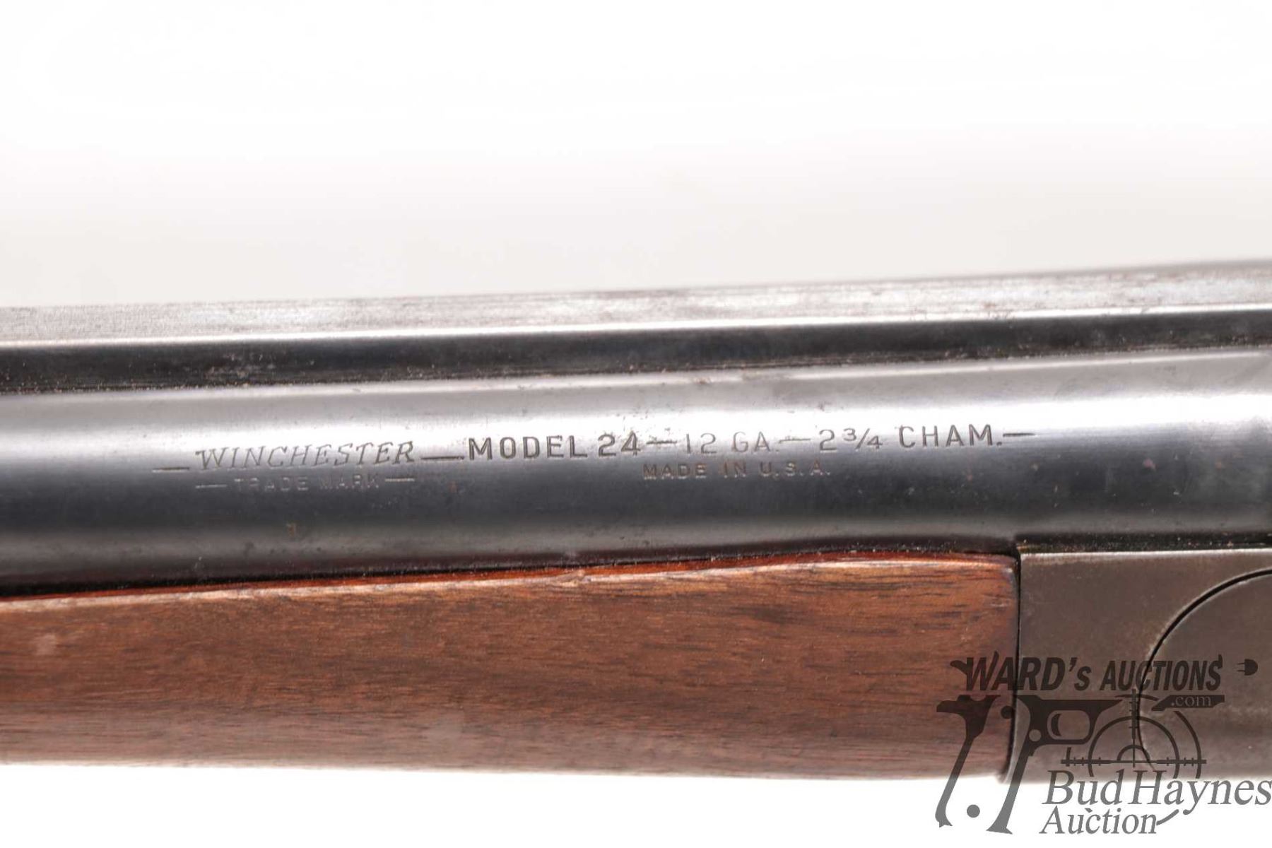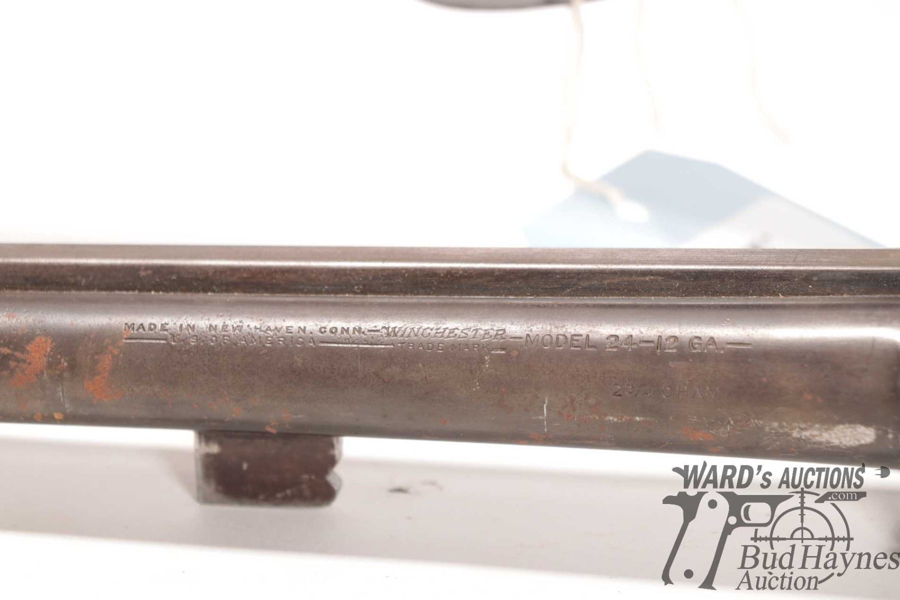Non-Restricted shotgun Winchester model 24, 12 ga. 2 3/4" Two shot hinge break, w/ bbl length 30" and 26" [Blued barrels and receiver. Single bead sights. Smooth wooden stock with plastic butt plate. No serial numbers seen on either barrel. 30" left barrel marked "Full" and measures .727 in the bore and .6945 at muzzle. Right 30" barrel marked "Mod" and measures .726 and muzzle .716. 26" left barrel marked "Mod" and measures .7275 in the bore and .716 at muzzle. Right 26" barrel marked "Cyl" and measures .728 at the bore and .7285 at muzzle. Both barrels fitted to receiver and function reasonably well. Finish on receiver and short barrel is brown with surface rust and pitting, 30" barrel has most of bluing intact with much less surface rust and pitting.] serial # 34128, PAL required