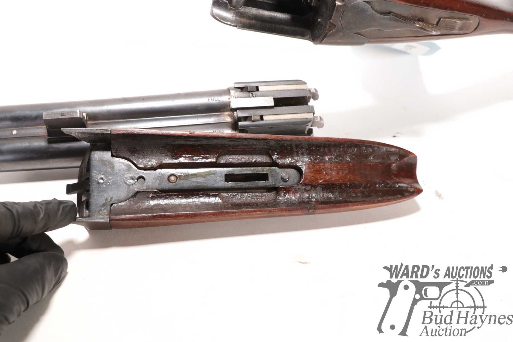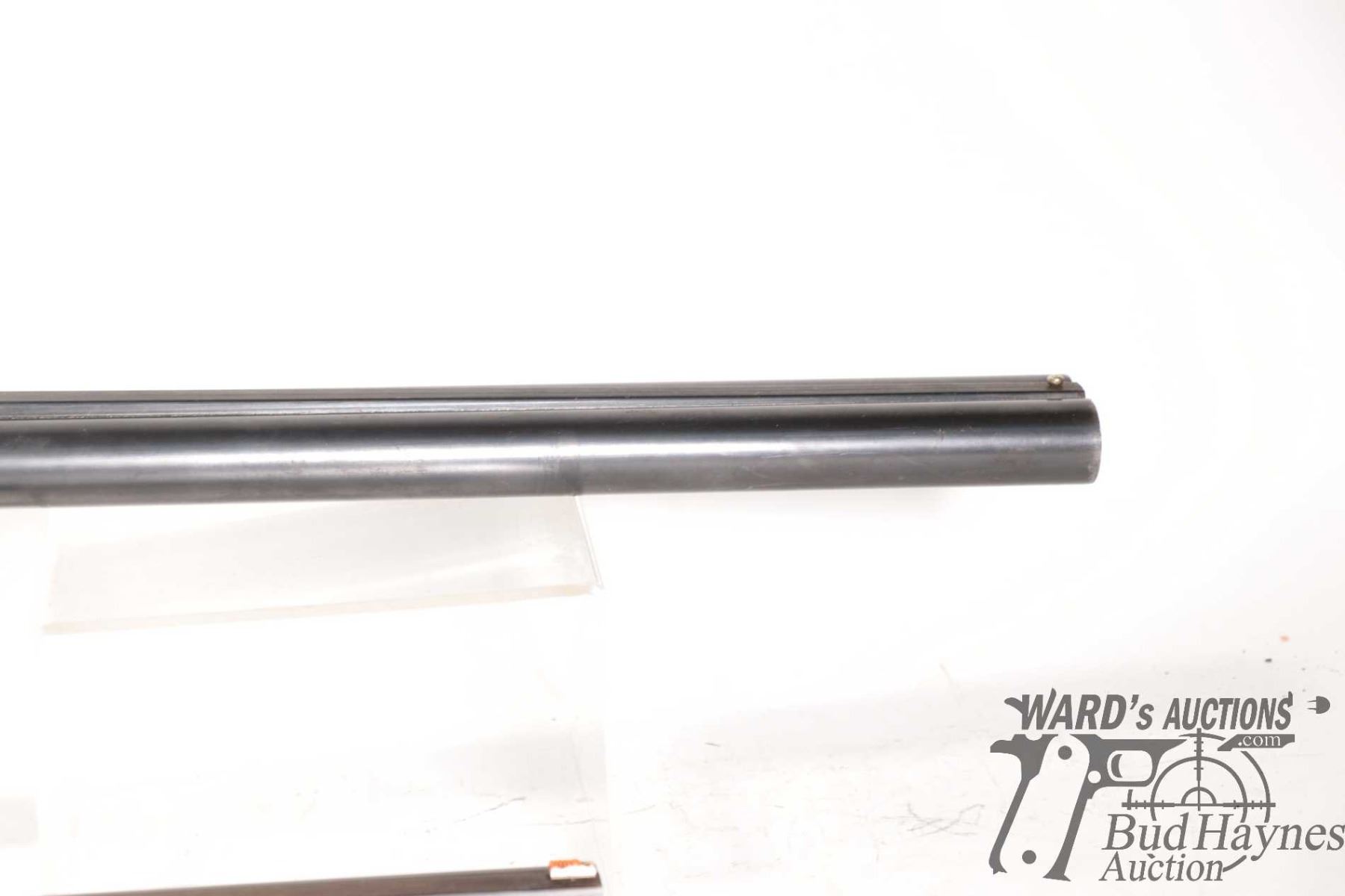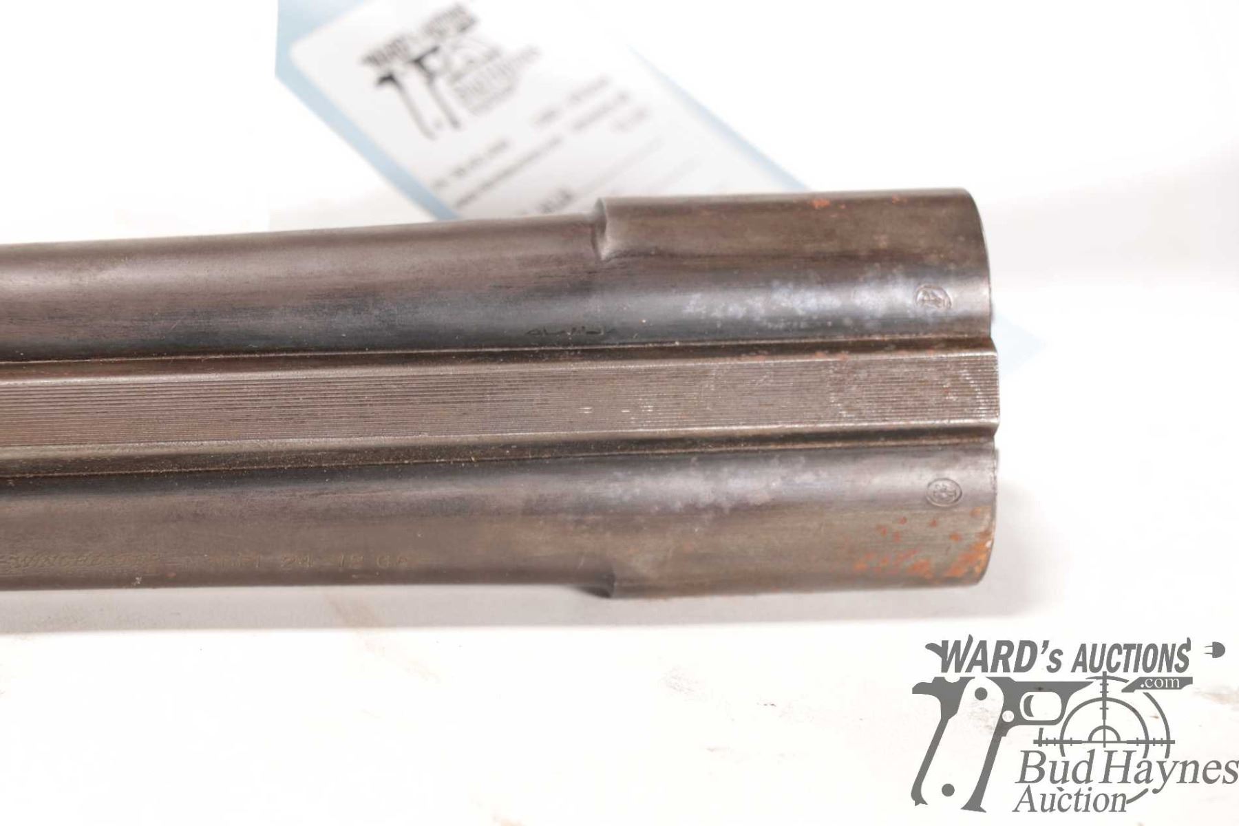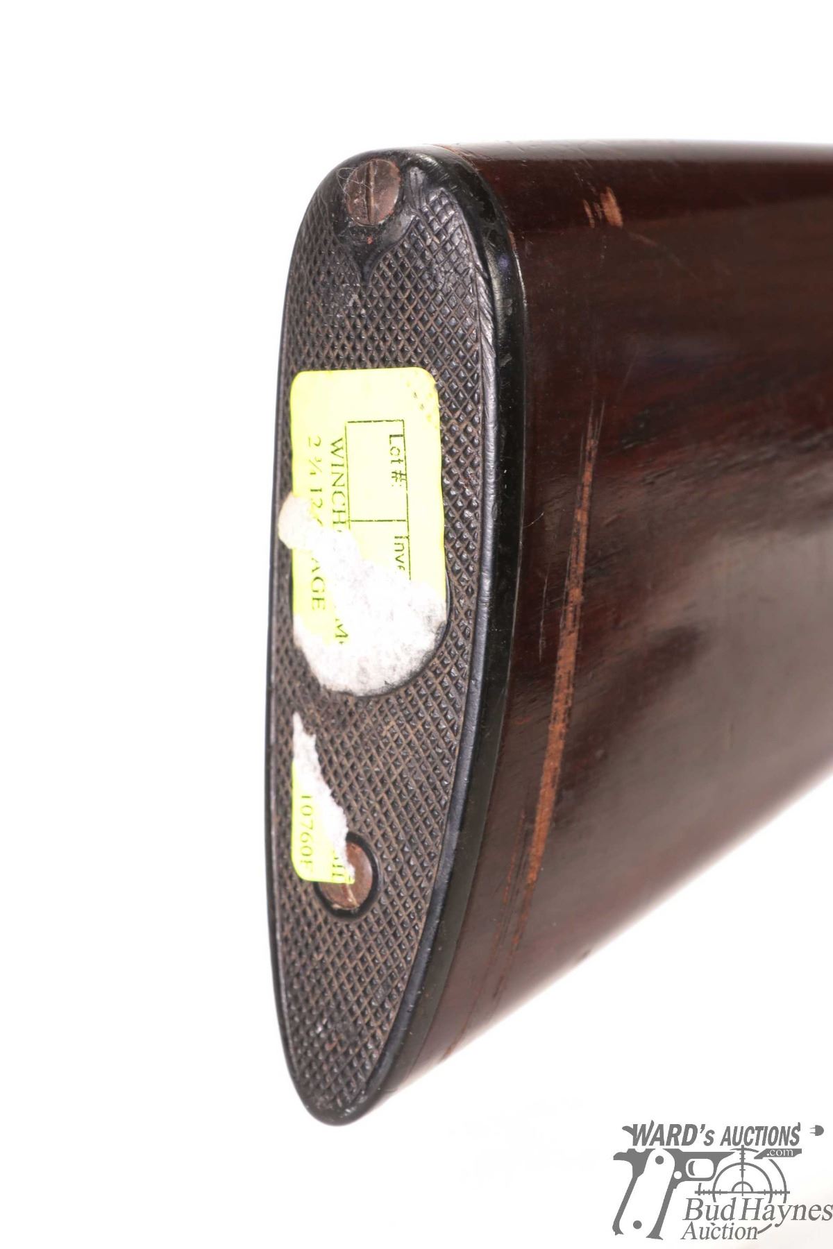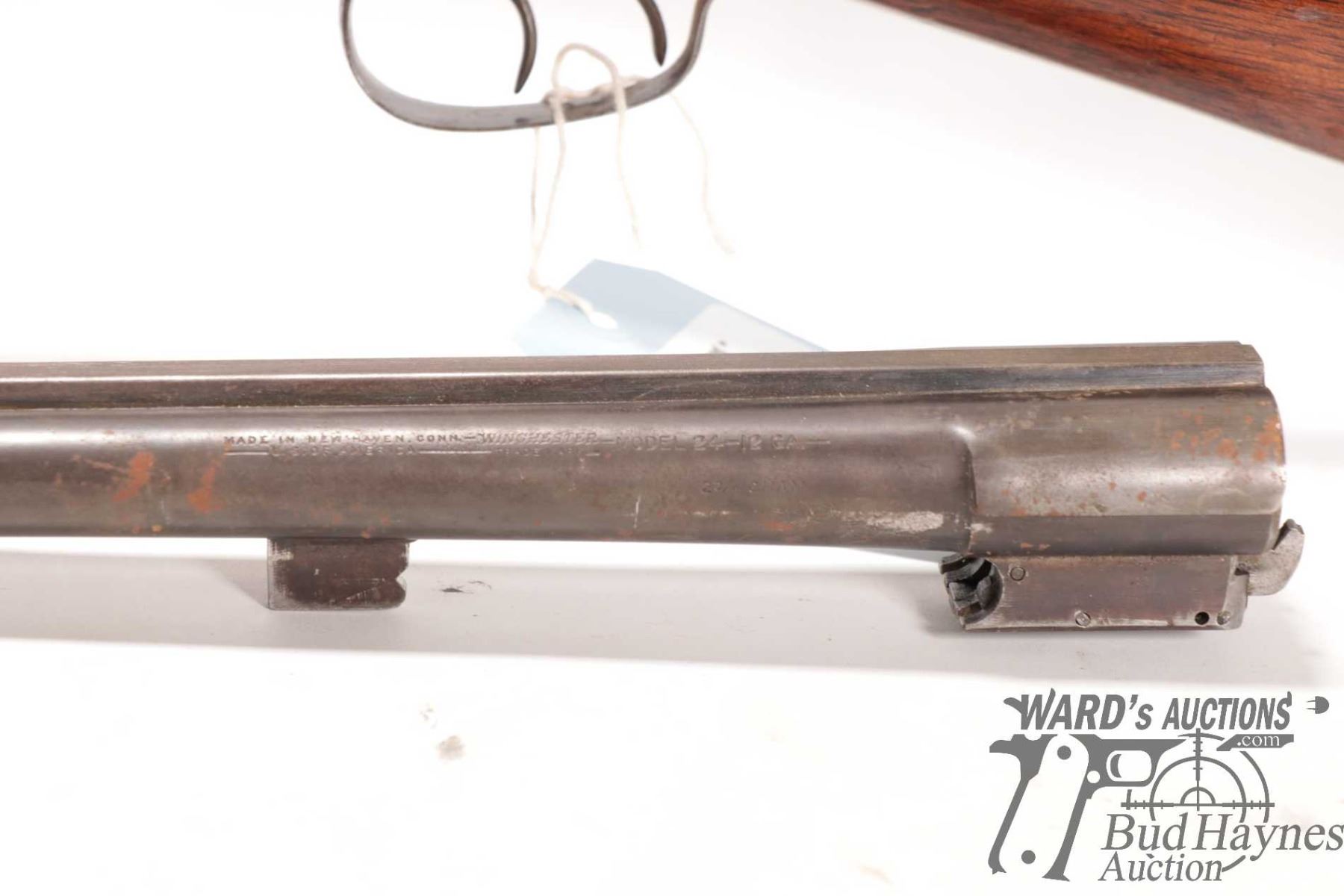 Non-Restricted shotgun Winchester model 24, 12 ga. 2 3/4" Two shot hinge break, w/ bbl length 30" and 26" [Blued barrels and receiver. Single bead sights. Smooth wooden stock with plastic butt plate. No serial numbers seen on either barrel. 30" left barrel marked "Full" and measures .727 in the bore and .6945 at muzzle. Right 30" barrel marked "Mod" and measures .726 and muzzle .716. 26" left barrel marked "Mod" and measures .7275 in the bore and .716 at muzzle. Right 26" barrel marked "Cyl" and measures .728 at the bore and .7285 at muzzle. Both barrels fitted to receiver and function reasonably well. Finish on receiver and short barrel is brown with surface rust and pitting, 30" barrel has most of bluing intact with much less surface rust and pitting.] serial # 34128, PAL required