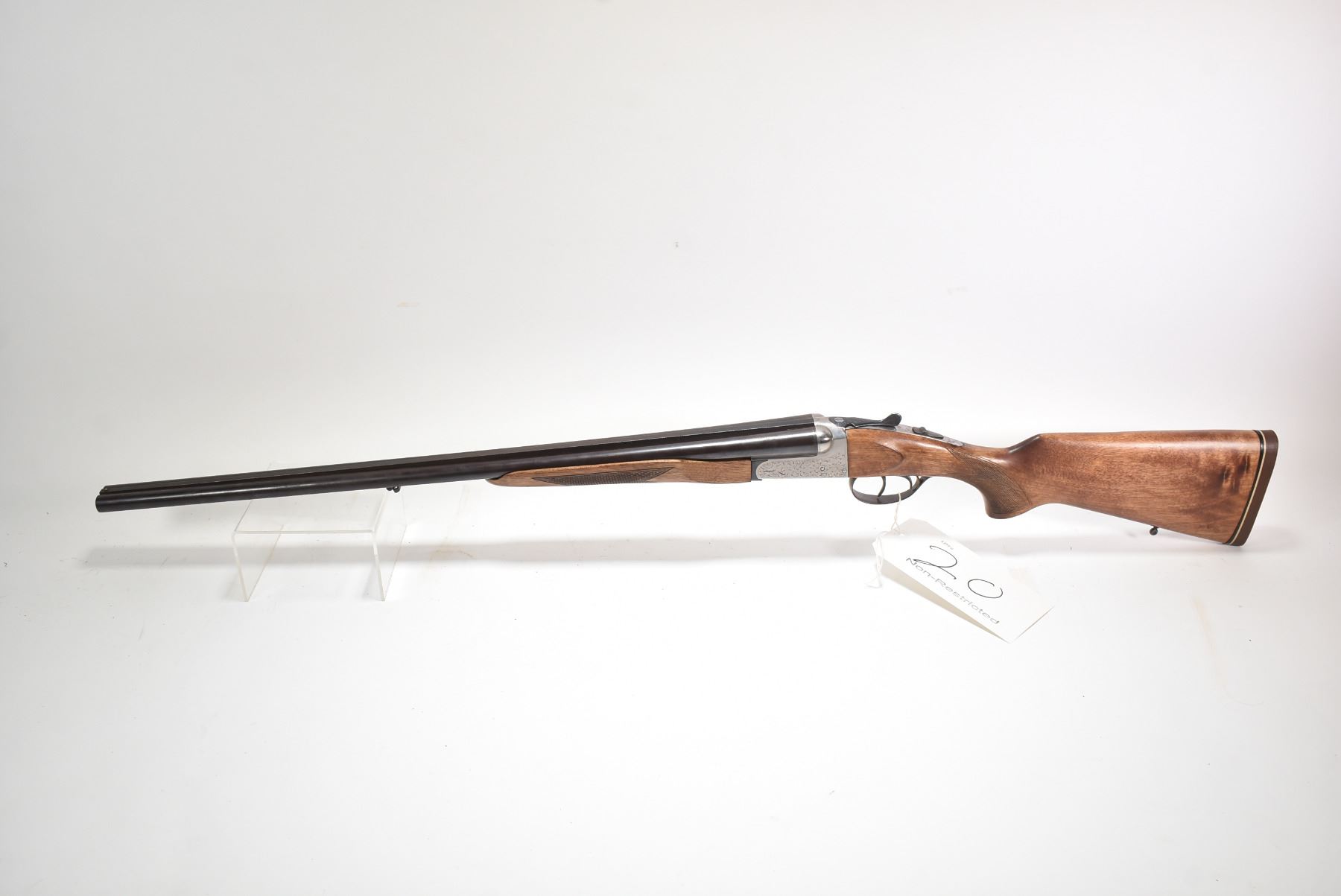 Non-Restricted shotgun Zabala Hermanos model Ruko 700, 28 gauge 2 3/4" two shot hinge break, w/ bbl length 26" [Blue style finished barrel and stainless receiver. Single bead sight. Wooden stock with checkered pistol and forend. Pachmayr Old English recoil pad. Sides and bottom of receiver have etched foliage and underside of trigger guard has etched scrollwork. Appears to have had very little use with minor use, handling and storage marks throughout.] serial # 397374, PAL required
