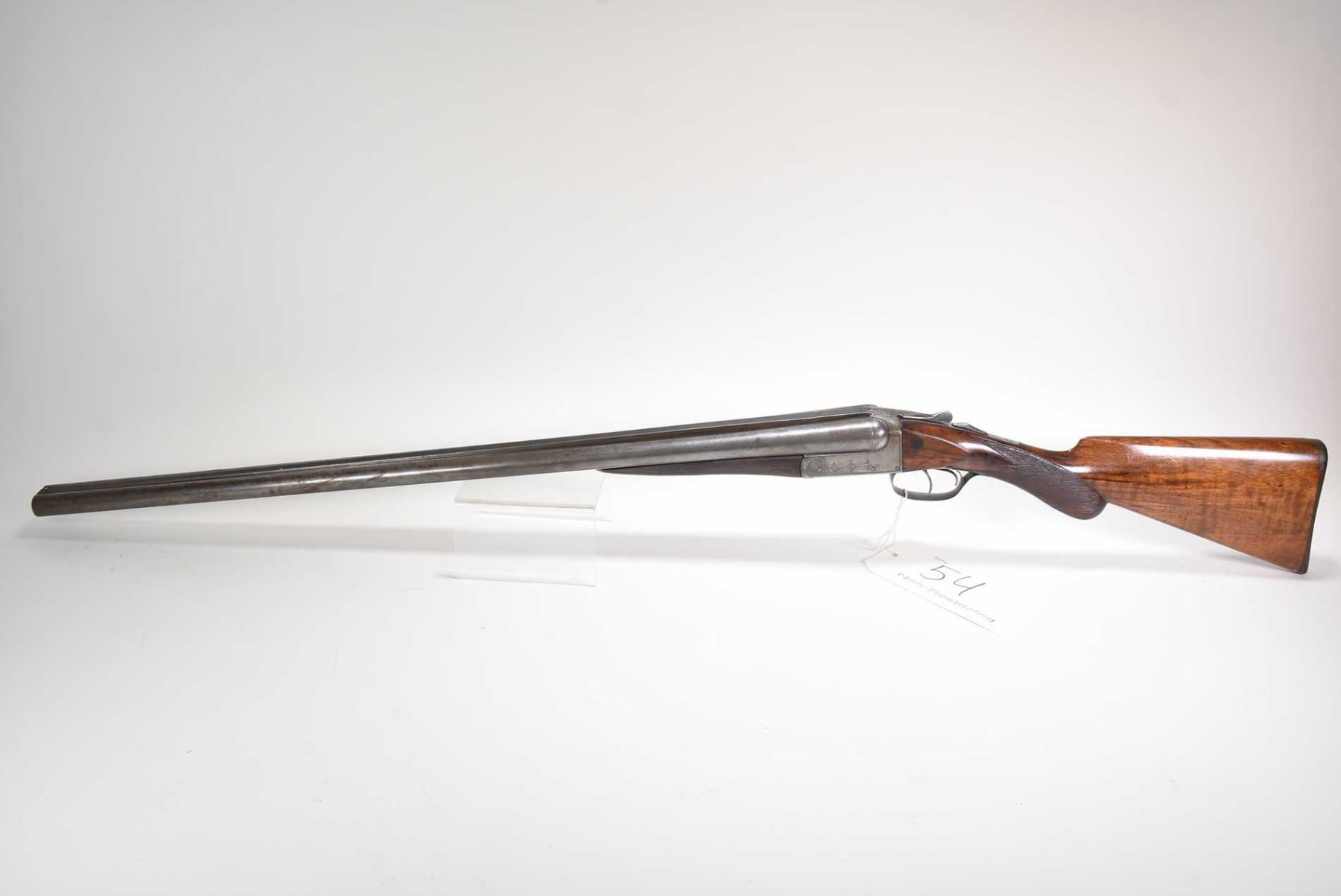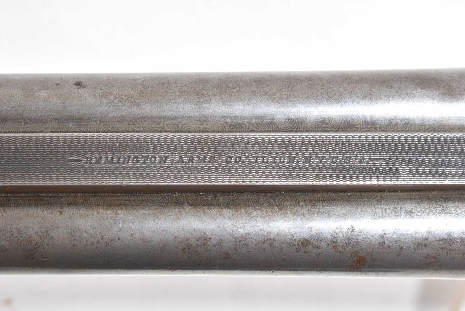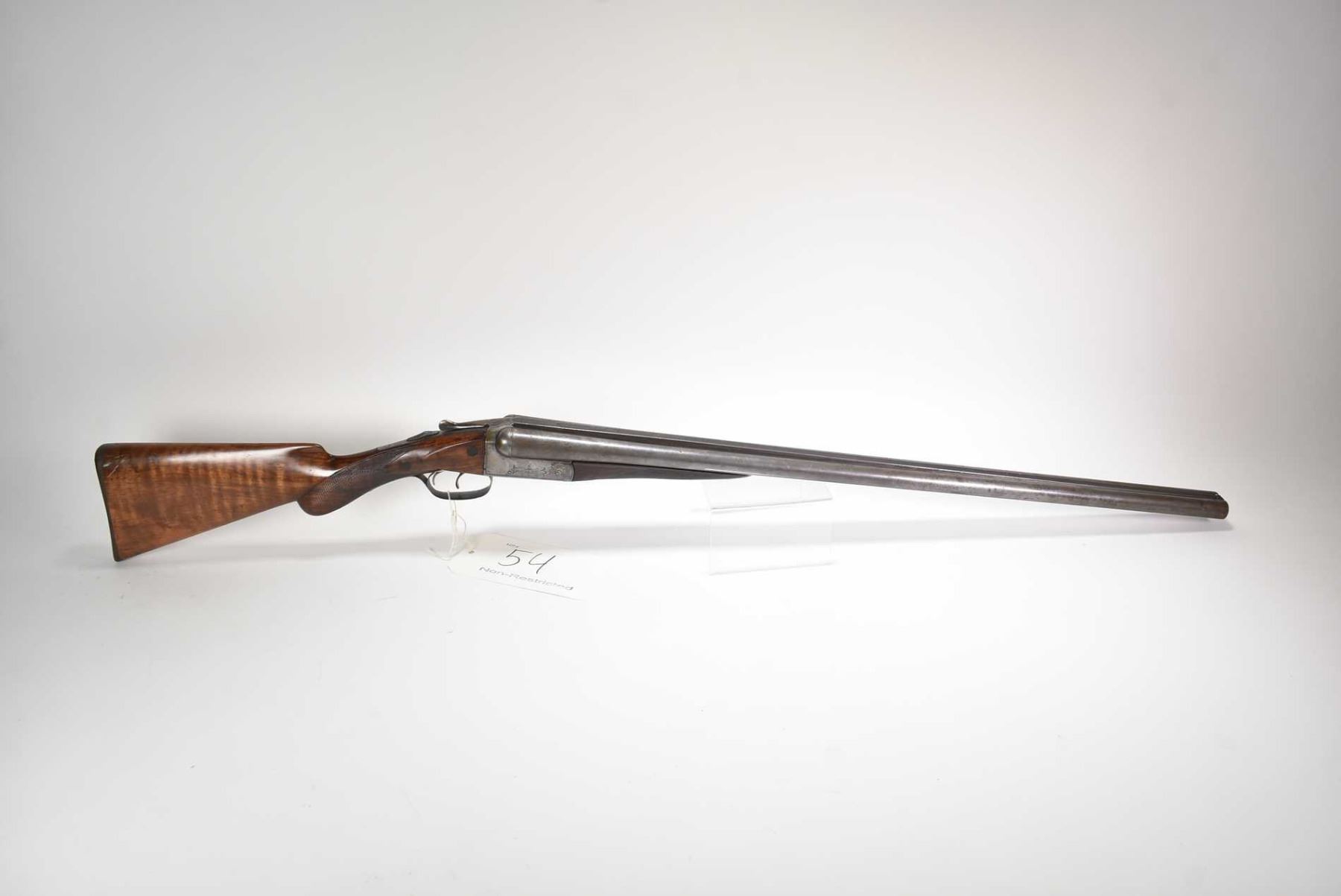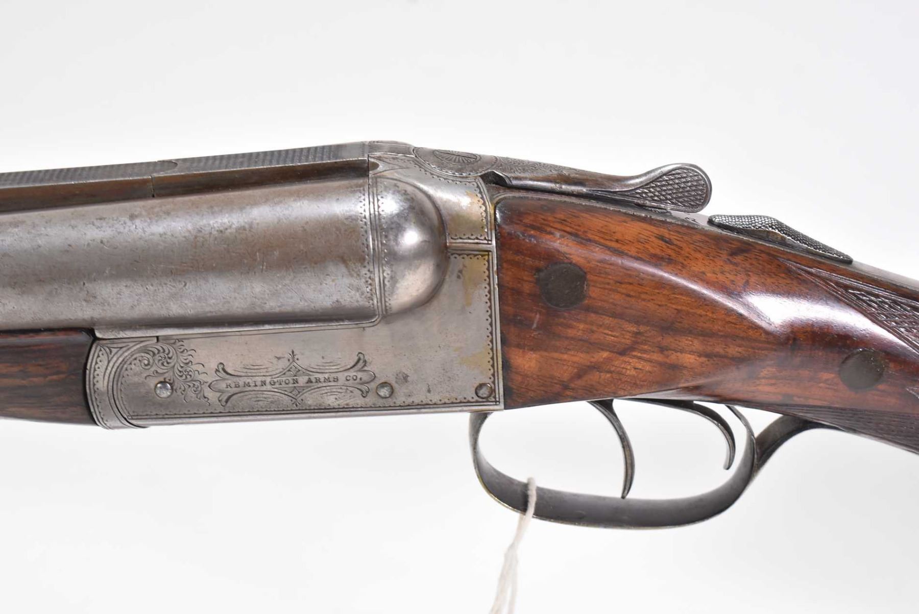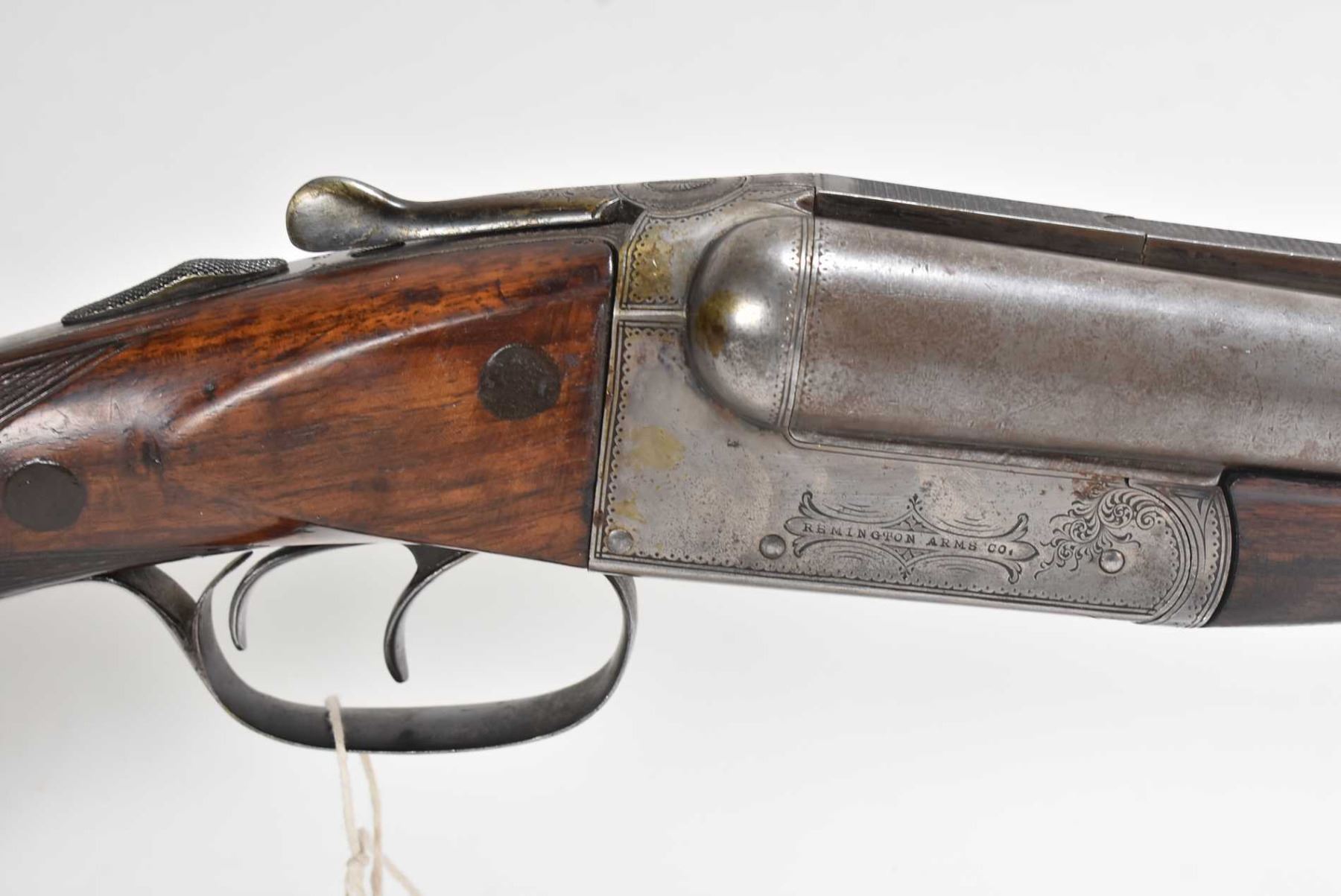 Non-Restricted sxs shotgun Remington model 1894 (B Grade), 12 ga 2 3/4" two shot hinge break, w/ bbl length 30" [Faded blued turning brown grey Damascus barrel with engraved steel receiver. Single bead front sight. Smooth hardwood stock with hard plastic branded butt plate. Checkered foregrip and pommeo grip. Overall well used condition with marks and nicks to wood and metal. Storage, use and handling marks] serial # 132147, PAL required