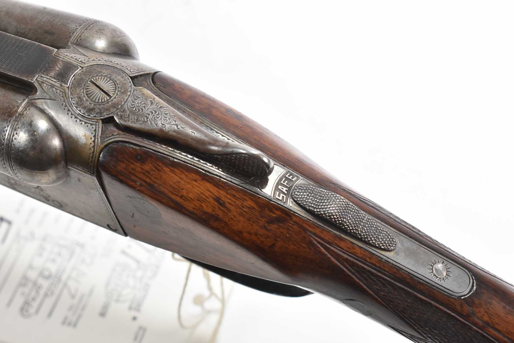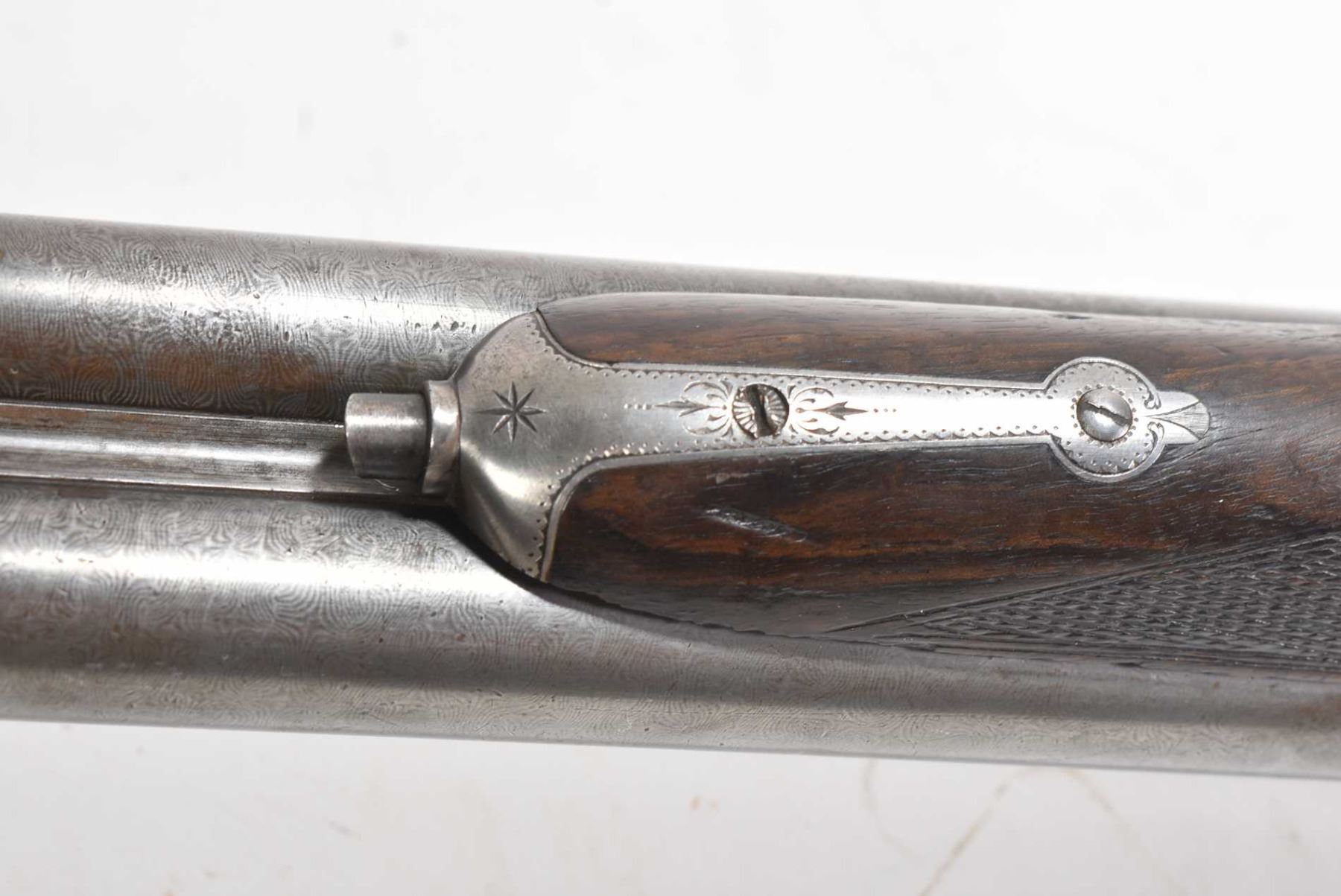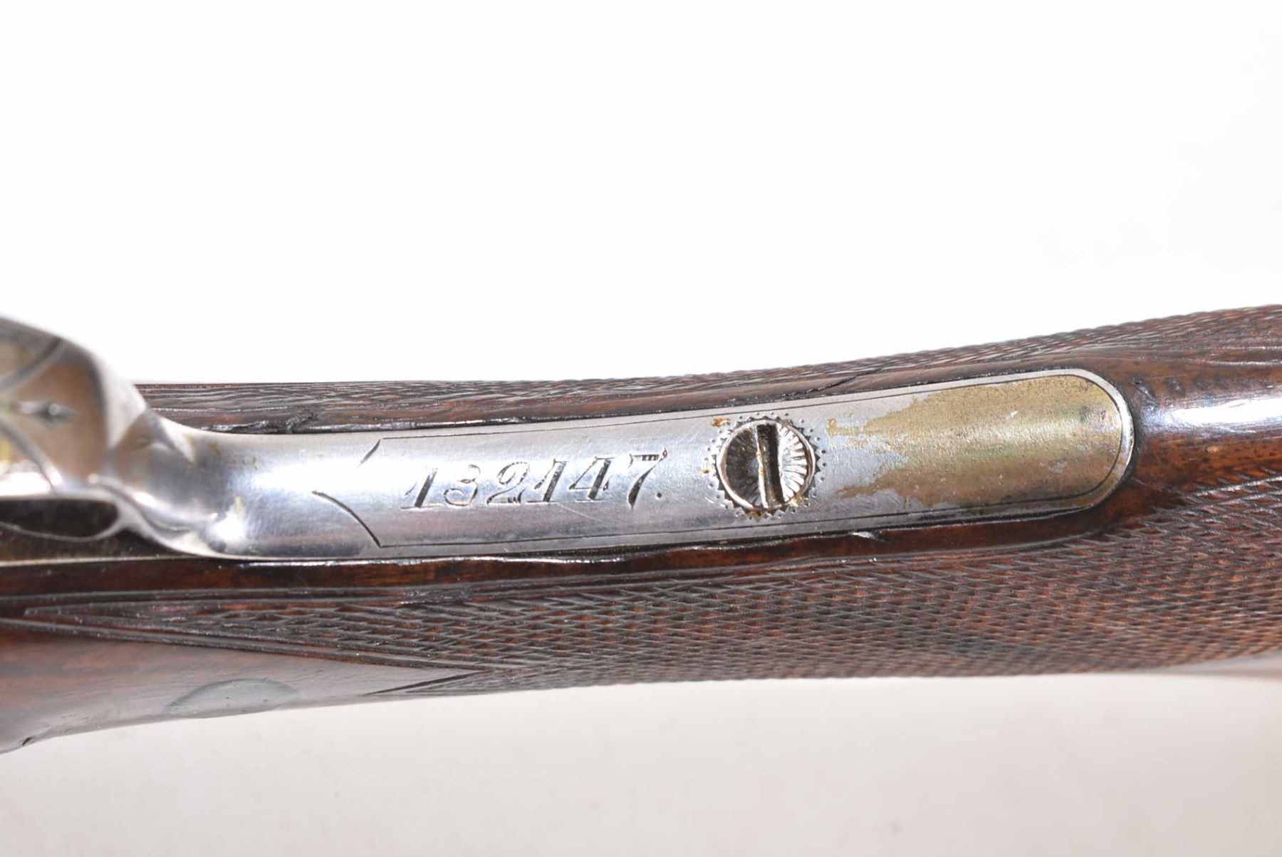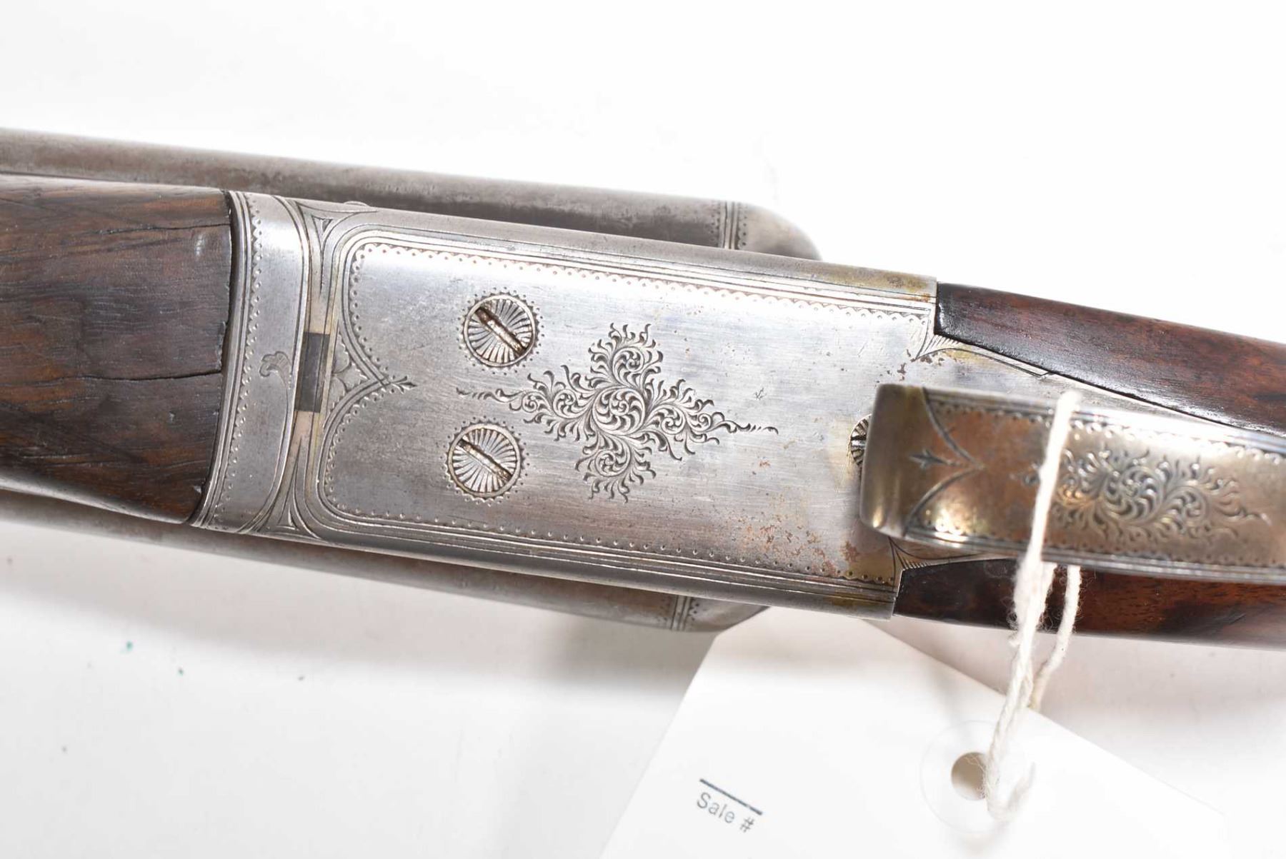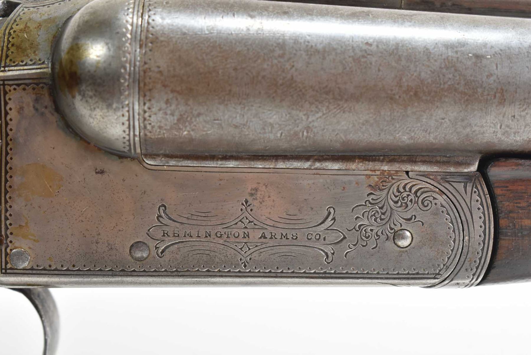 Non-Restricted sxs shotgun Remington model 1894 (B Grade), 12 ga 2 3/4" two shot hinge break, w/ bbl length 30" [Faded blued turning brown grey Damascus barrel with engraved steel receiver. Single bead front sight. Smooth hardwood stock with hard plastic branded butt plate. Checkered foregrip and pommeo grip. Overall well used condition with marks and nicks to wood and metal. Storage, use and handling marks] serial # 132147, PAL required