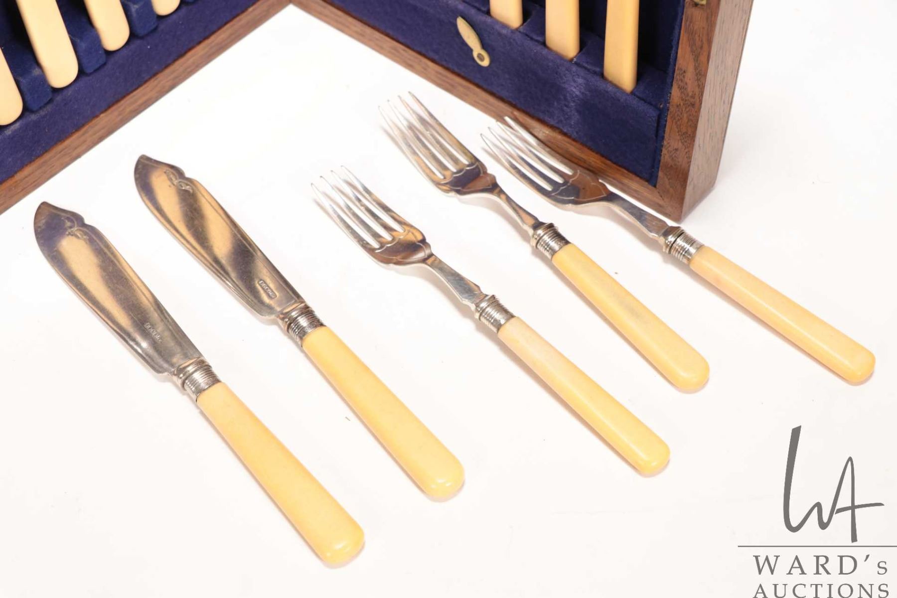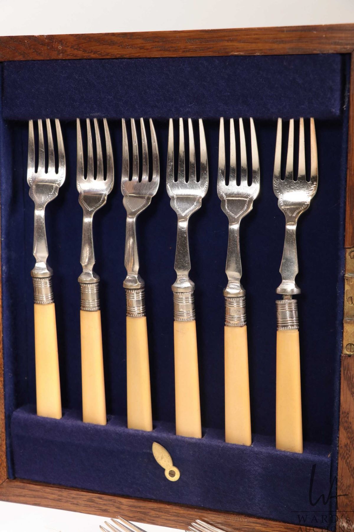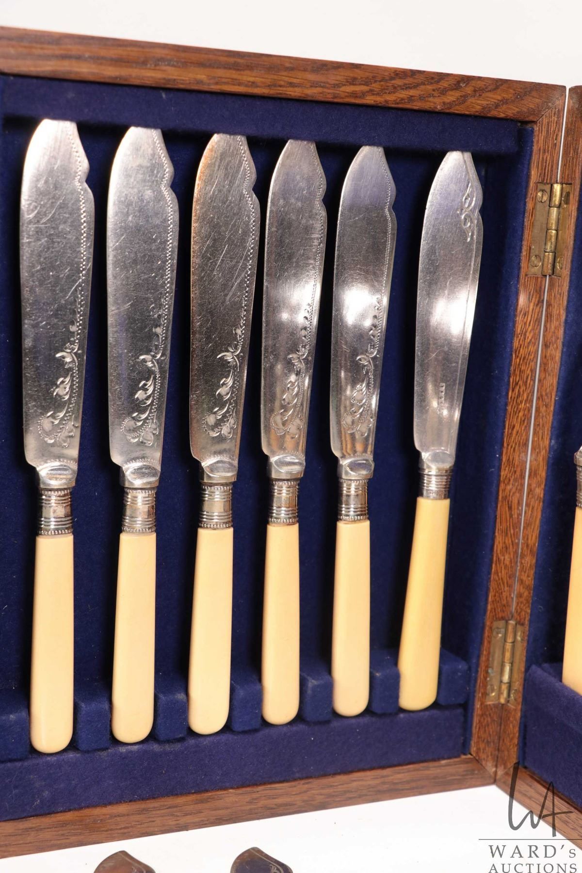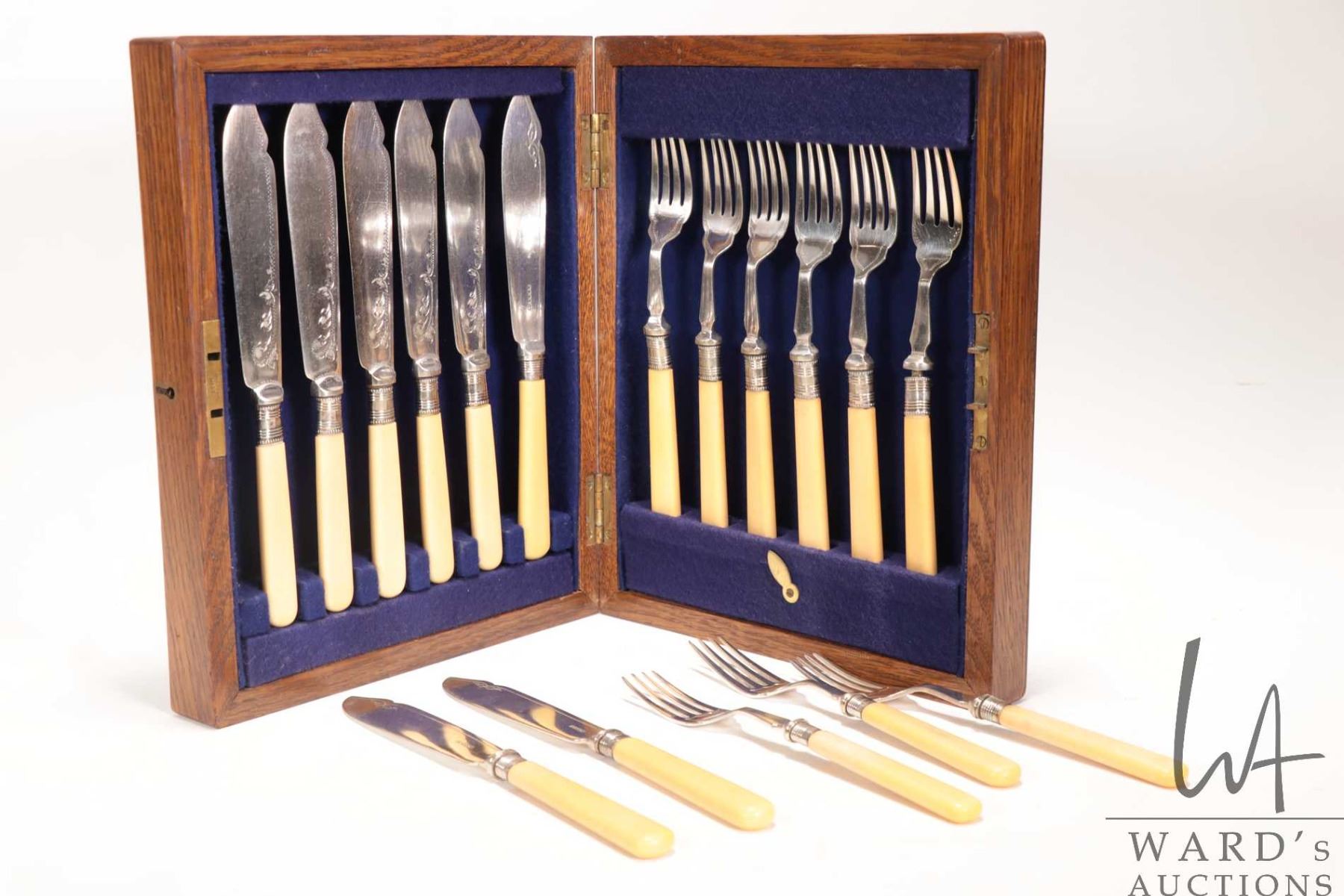Oak cased flatware box containing a selection of silver plated fish knives and forks with French ivory handles. Note, not all matching