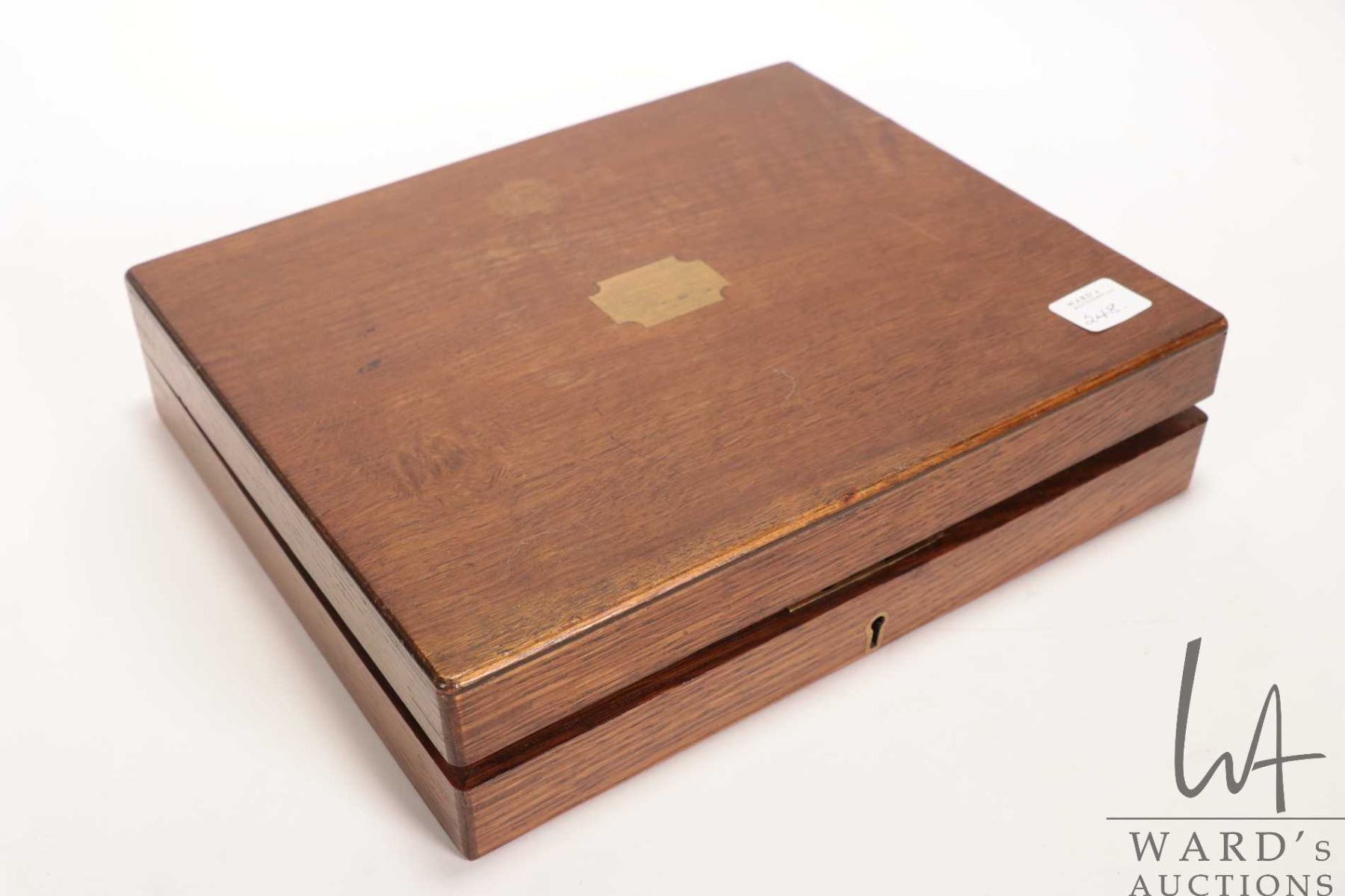 Oak cased flatware box containing a selection of silver plated fish knives and forks with French ivo