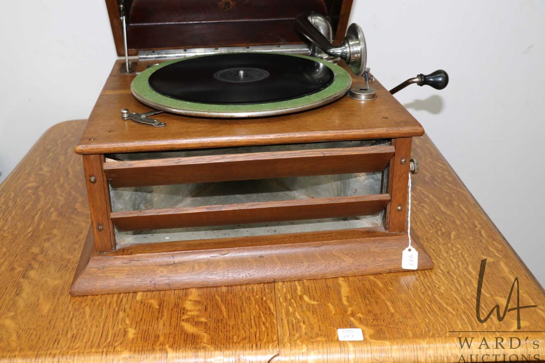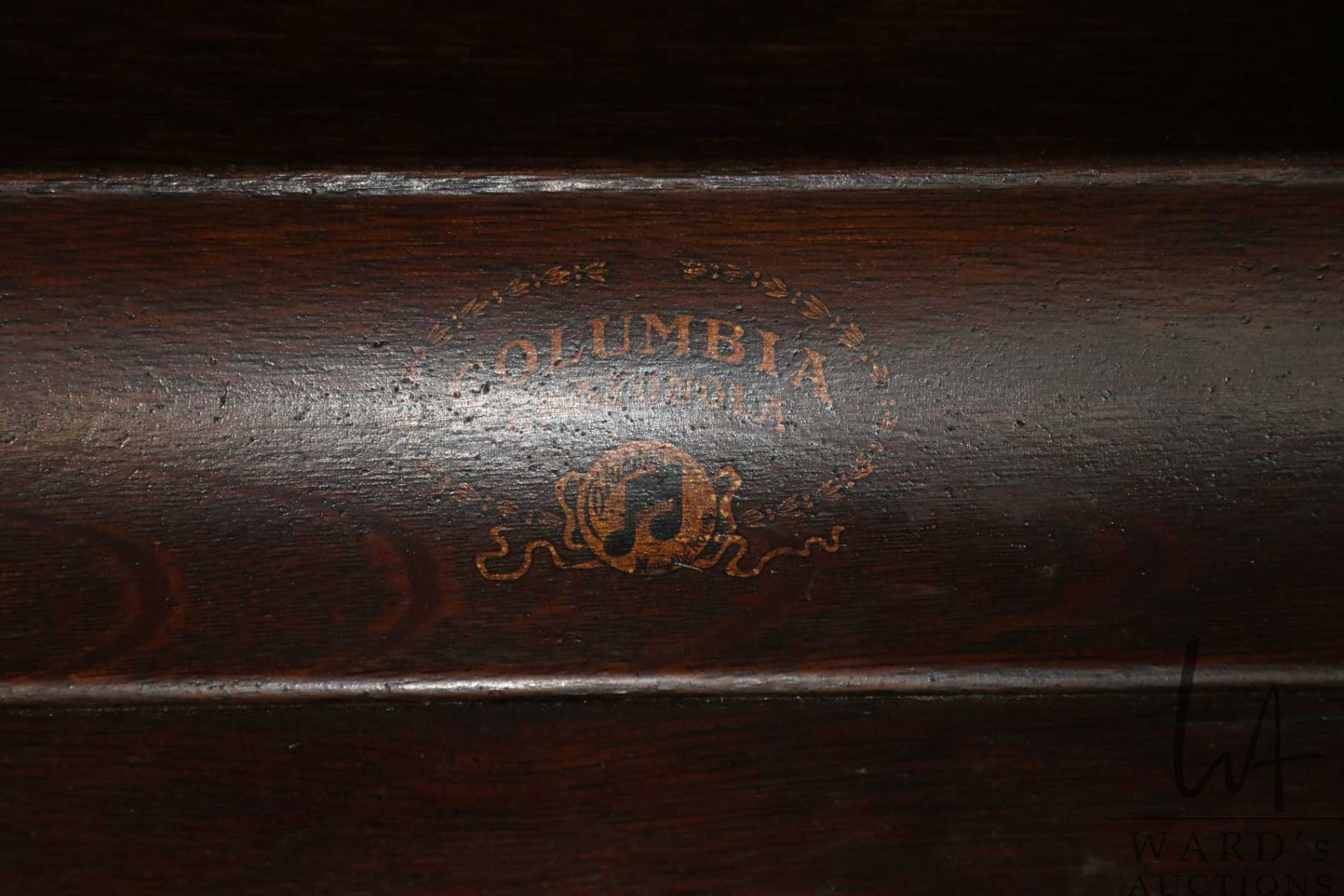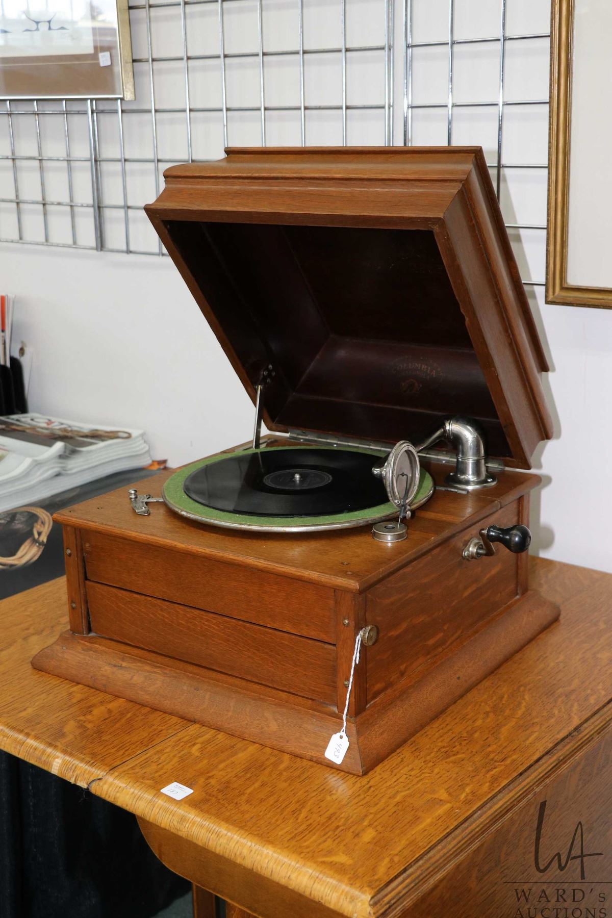 Oak cased, table top Columbia Grafonola 78 rpm gramophone. Working at time of cataloguing, mechanica