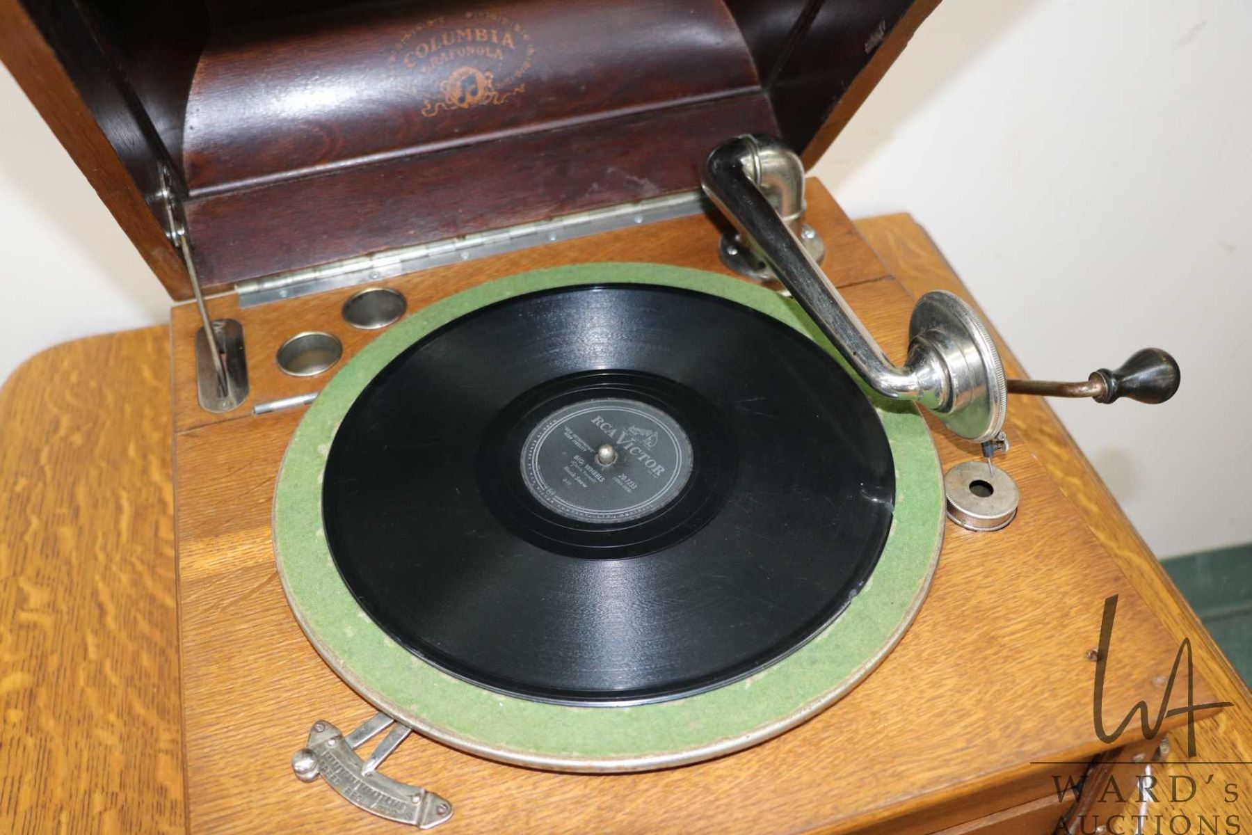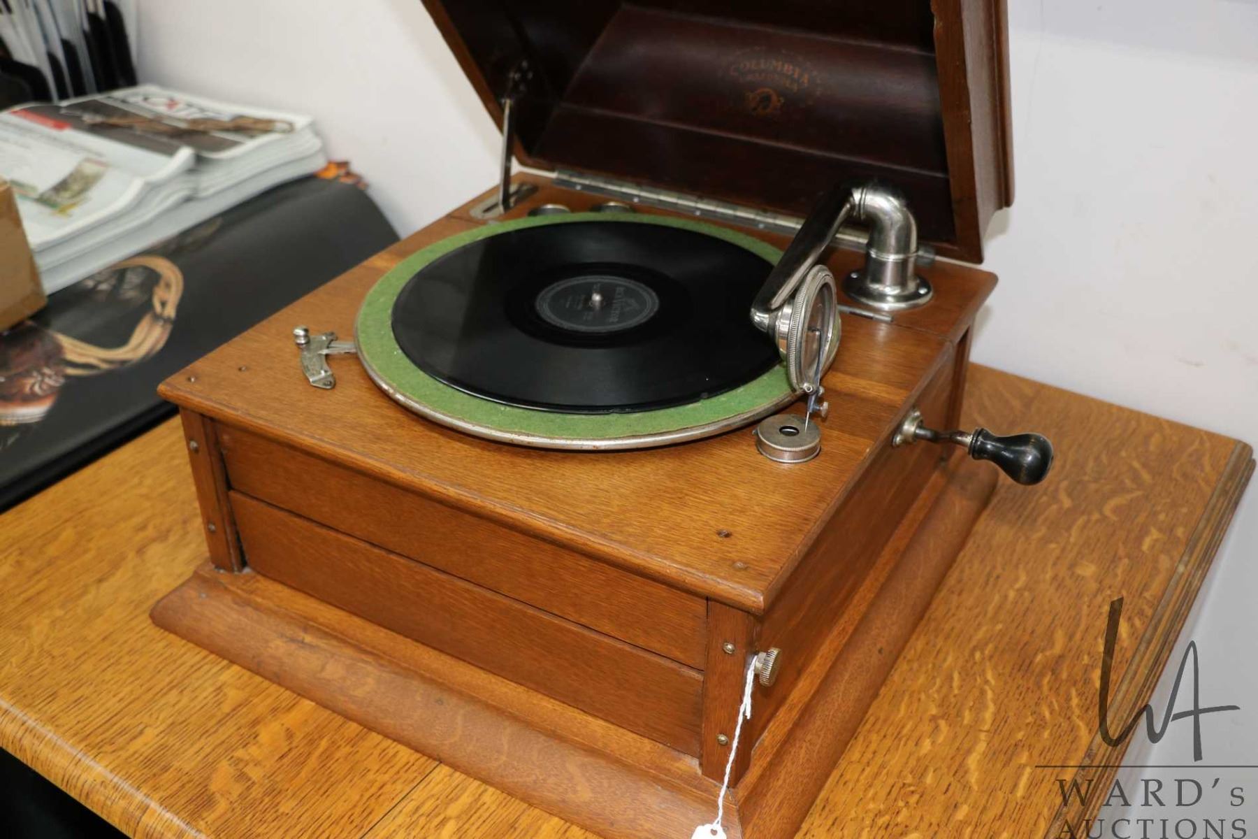 Oak cased, table top Columbia Grafonola 78 rpm gramophone. Working at time of cataloguing, mechanically working but runs slow, will need service work