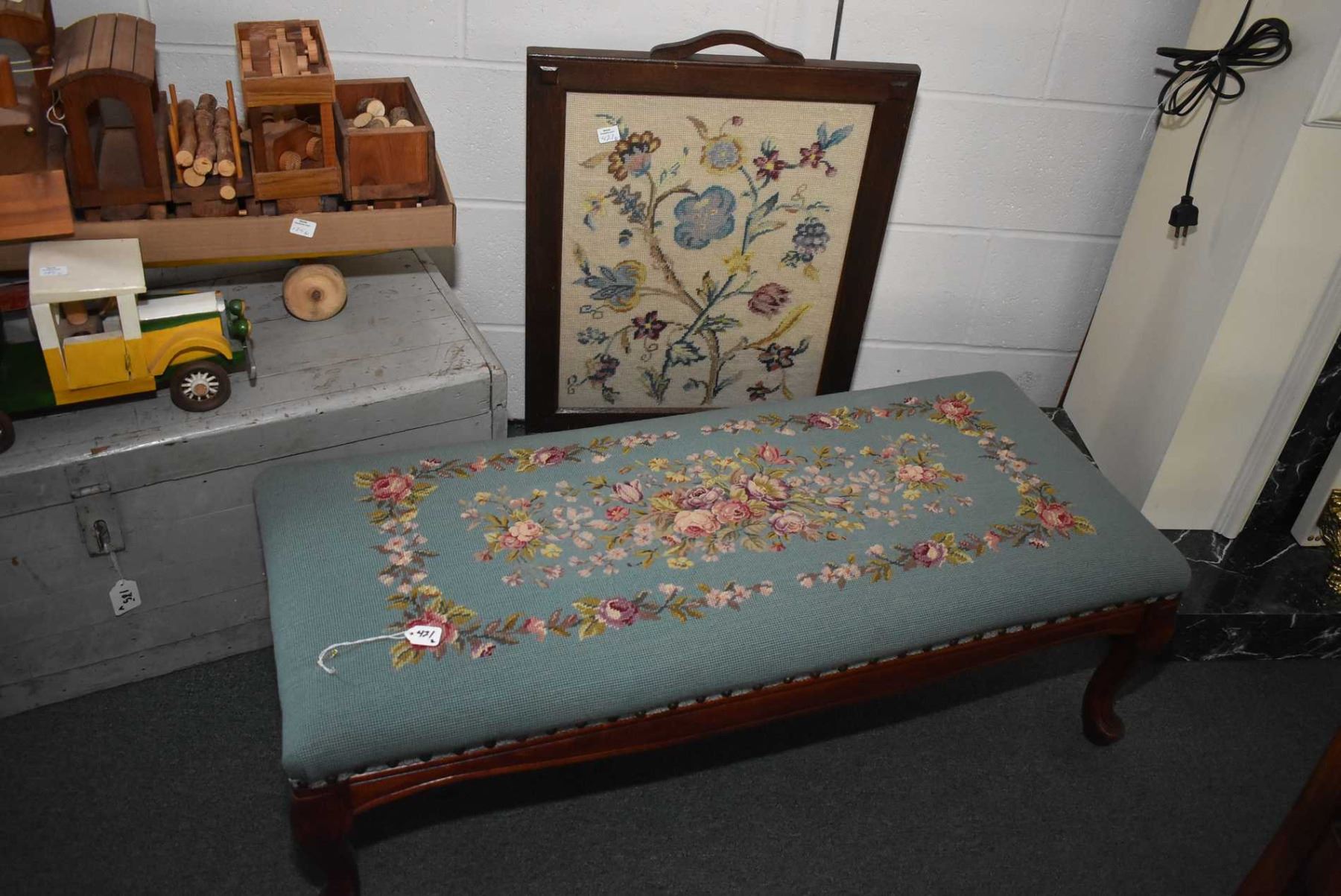 Oak framed needlepoint draft screen and a needlepoint upholstered fireside bench with cabriole supports